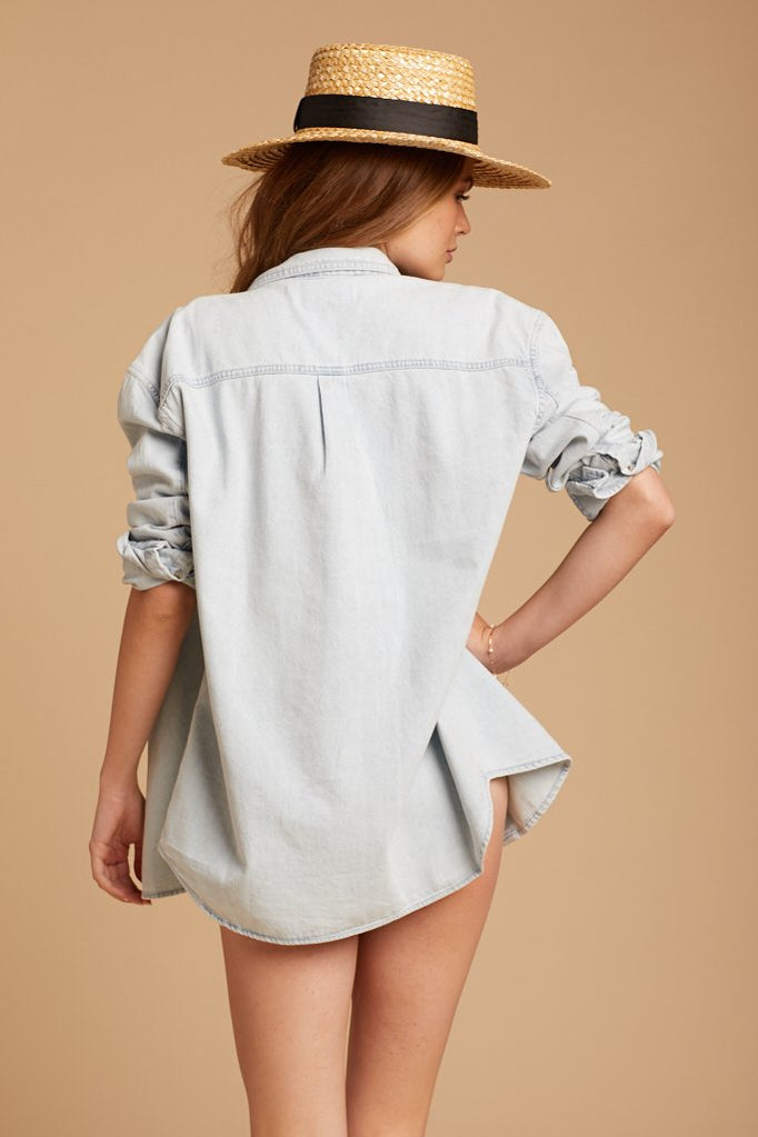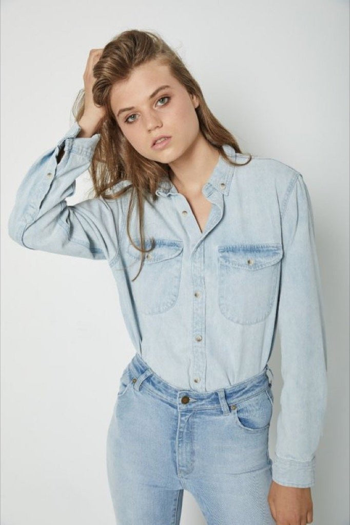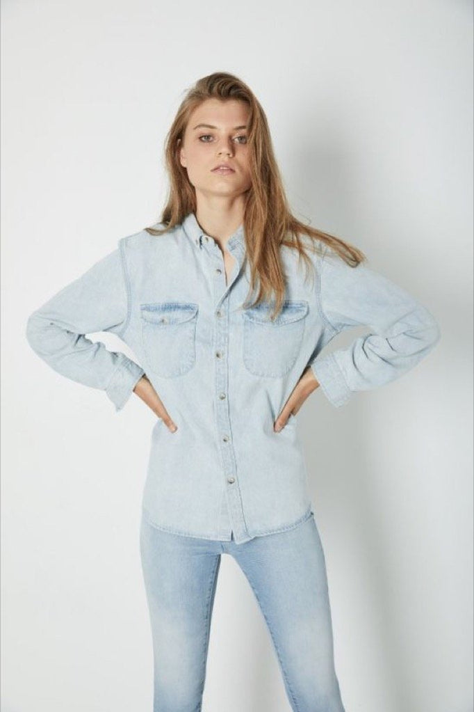 Slouch fit shirt with tortoise look buttons and classic denim styling. In a washed cotton denim for a vintage look and handfeel.