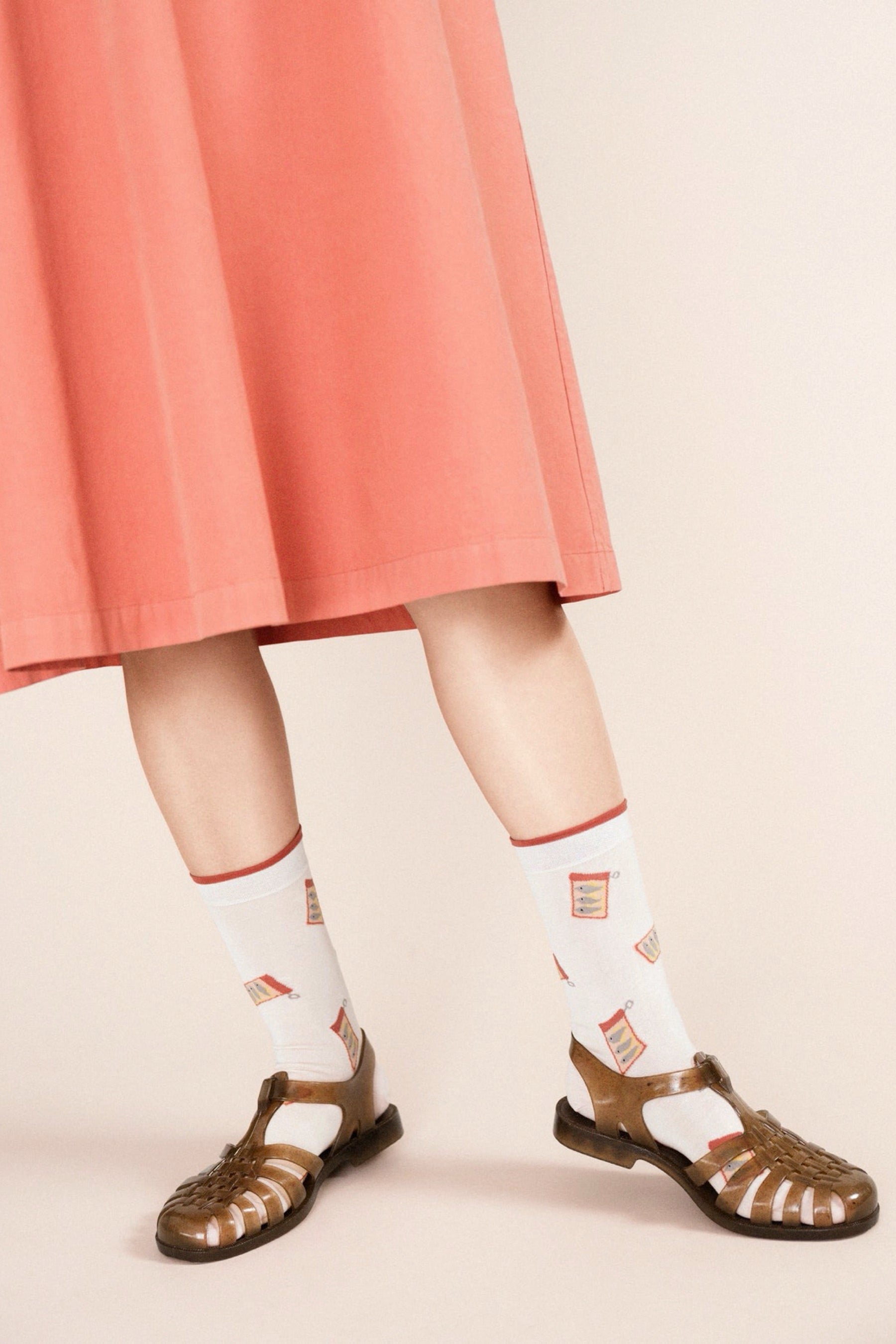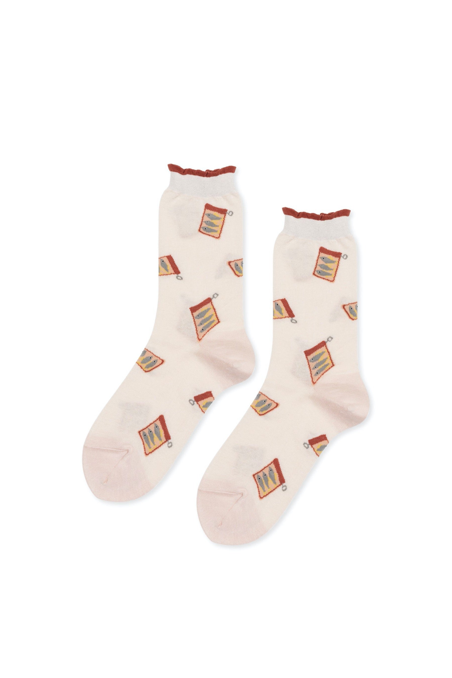 Our tinned fish obsession is bubbling up, so we just had to put canned sardines all over a pair of cotton-blend crews. Wear them to host a snack night featuring your favorite tins as the main course. Fintastic!