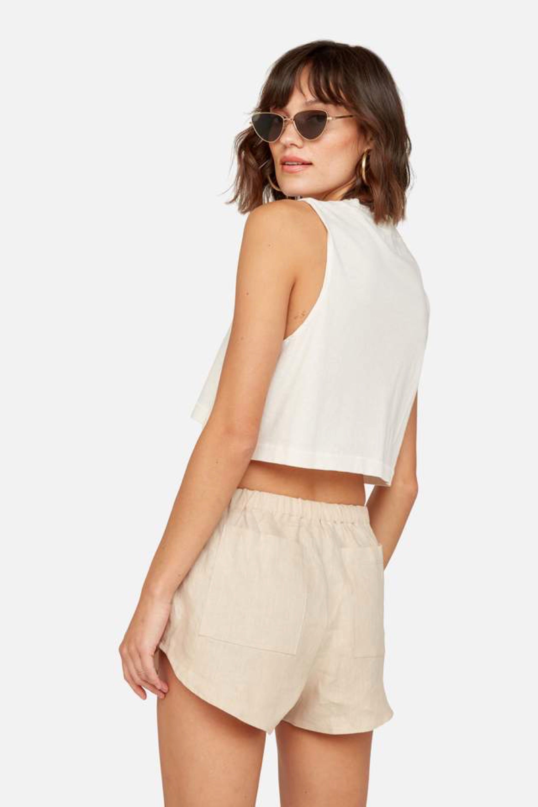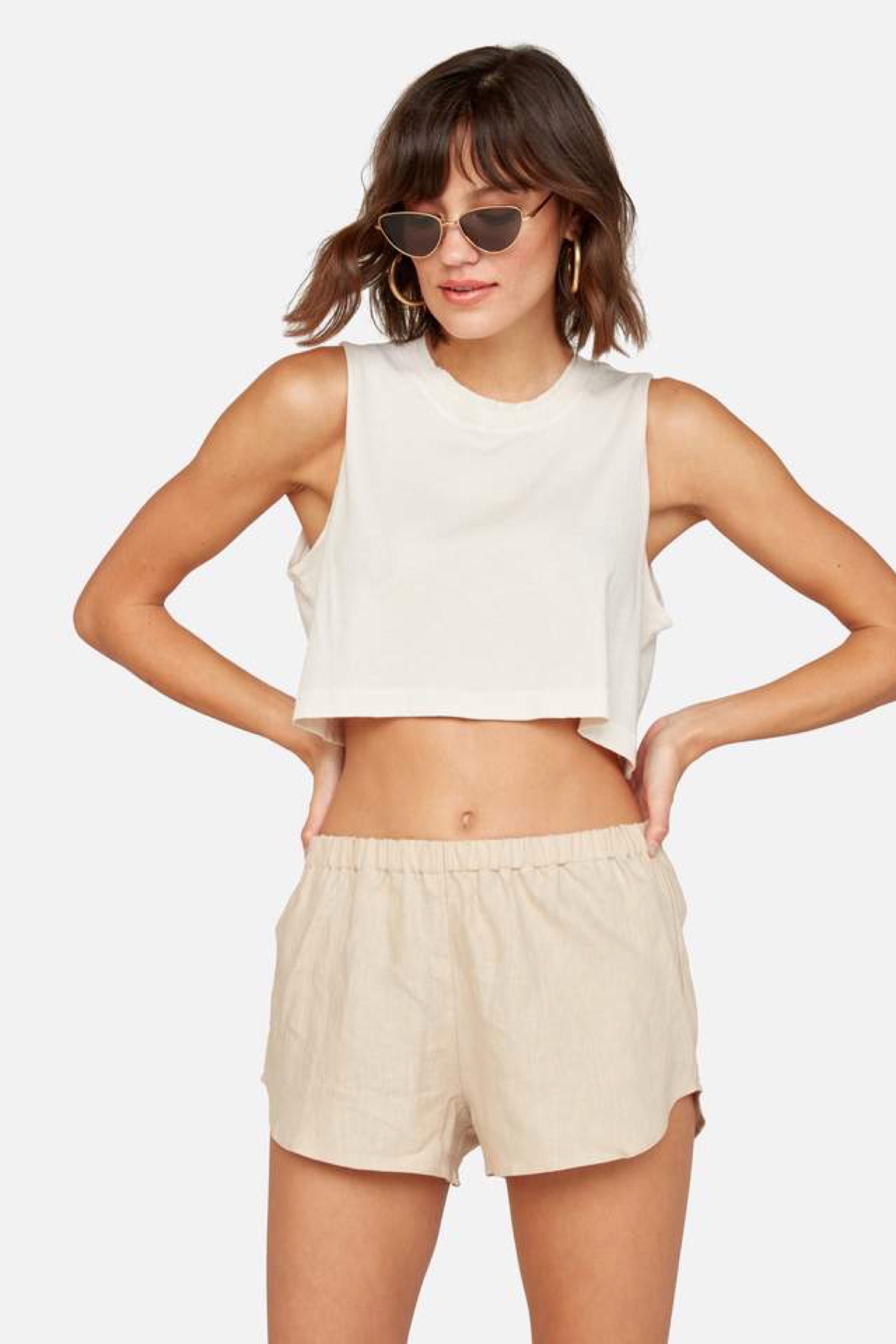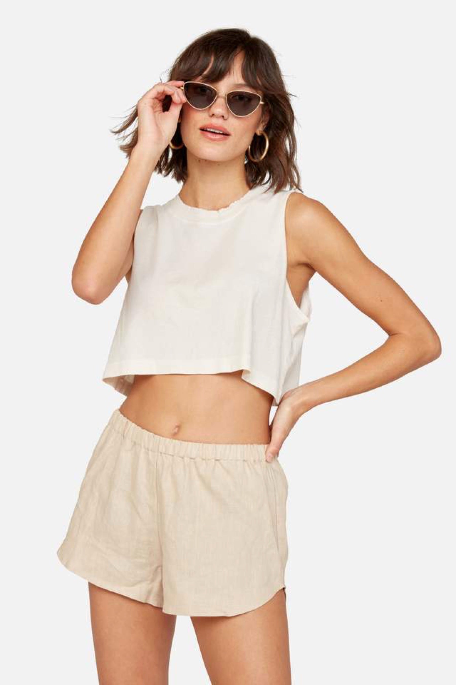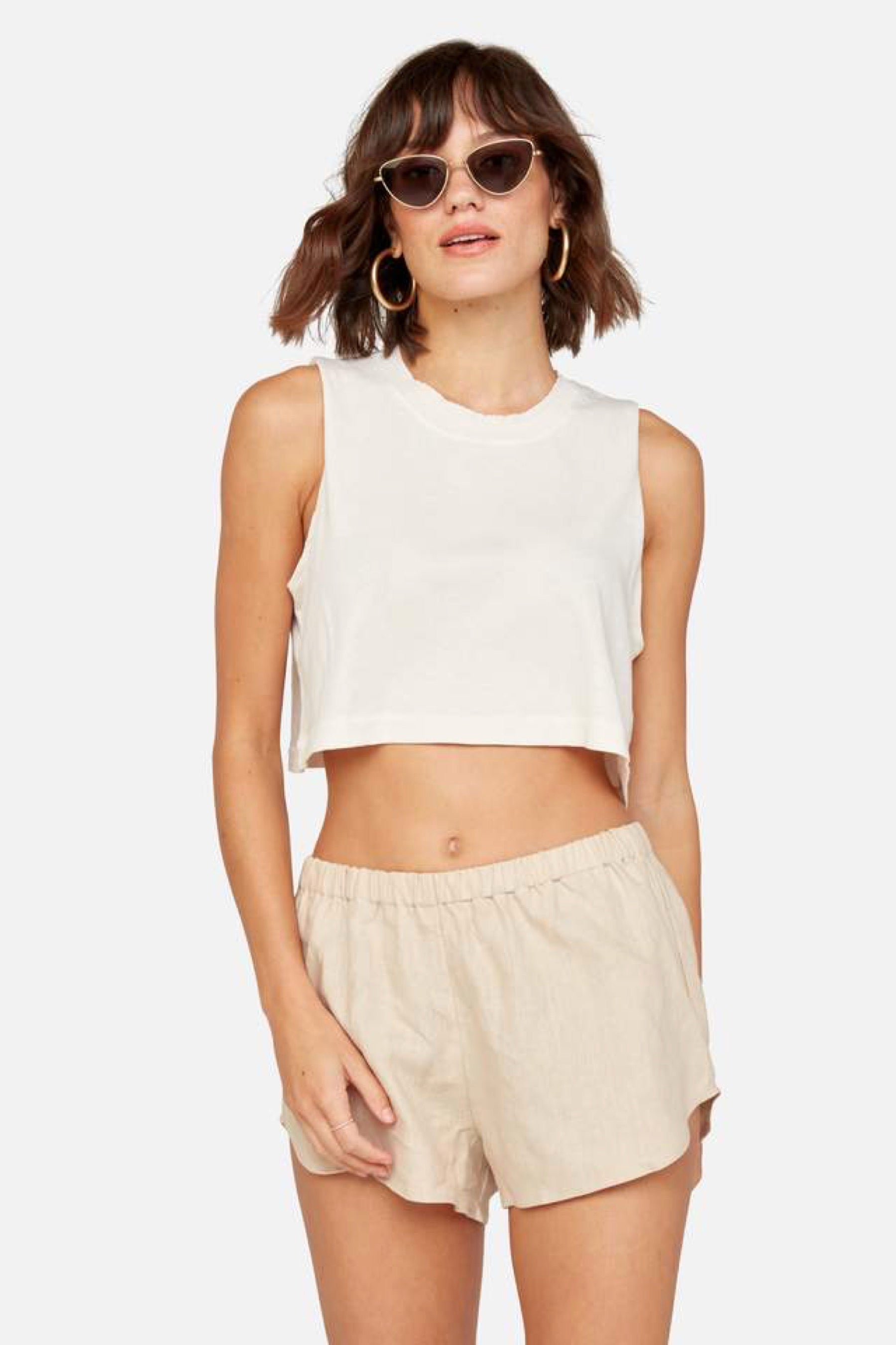 A cropped tank with double raw rib detail at the neckline. Made with super soft eco cotton that feels as if it's been washed and worn one hundred times.