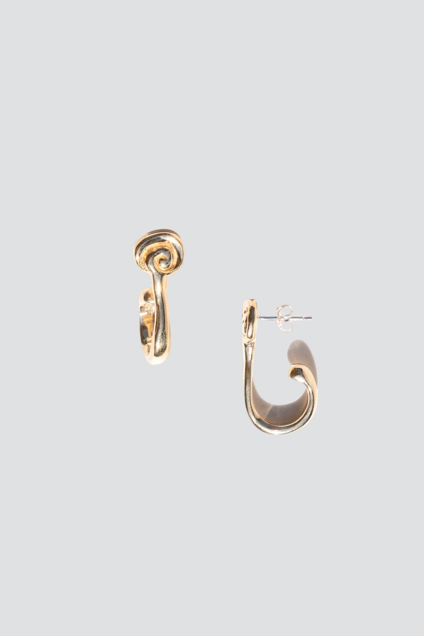A playful earring inspired by the form of a conch shell. Hand carved and cast in solid brass with a sterling silver post in a high polished finish and hammered texture.
