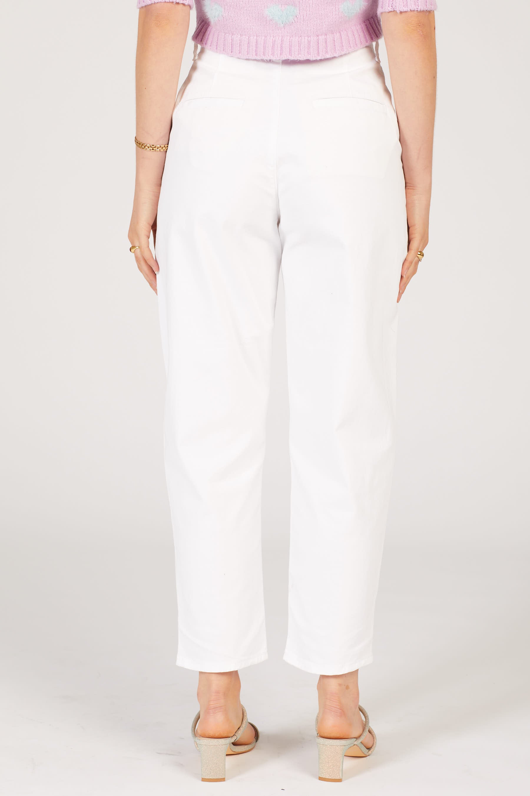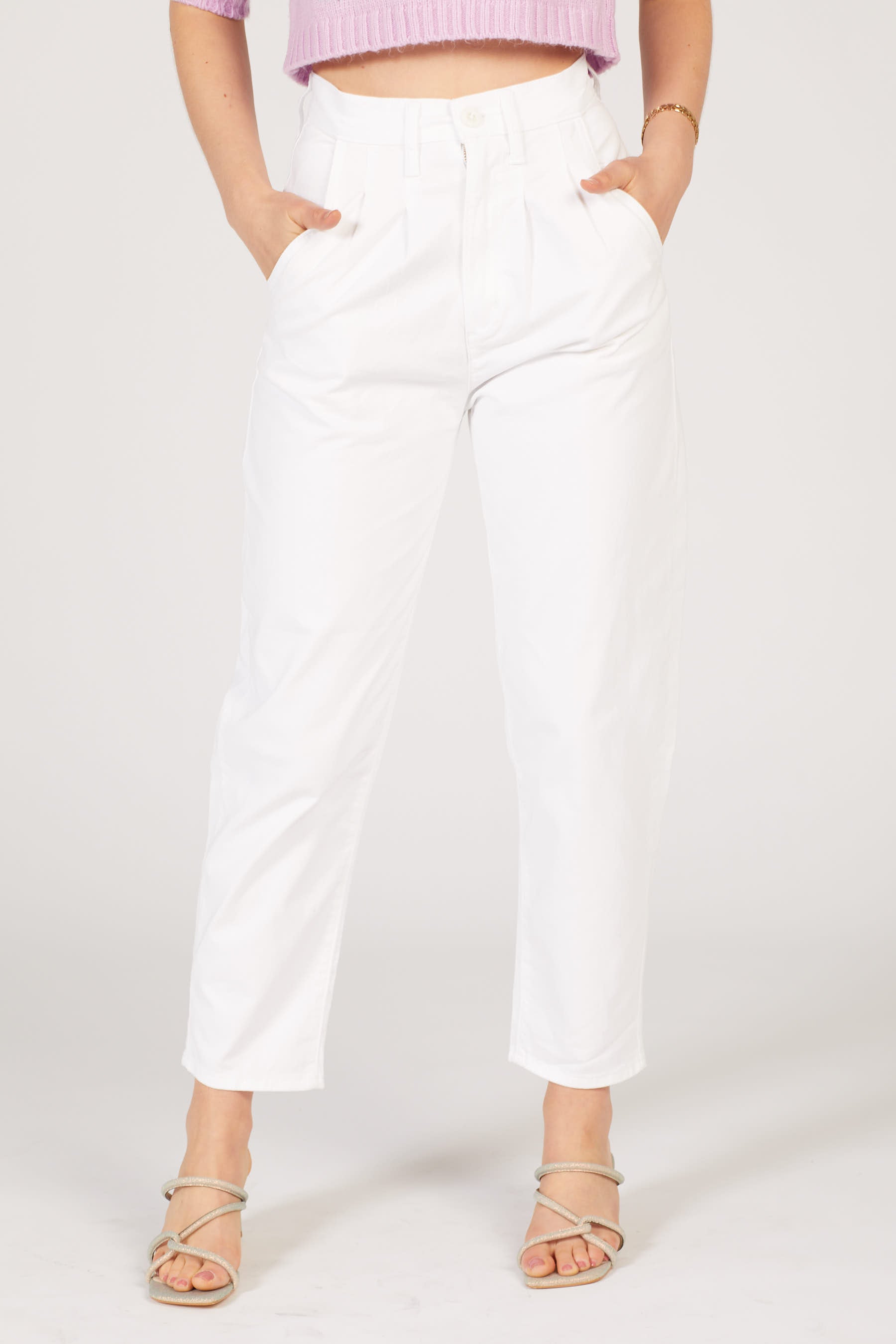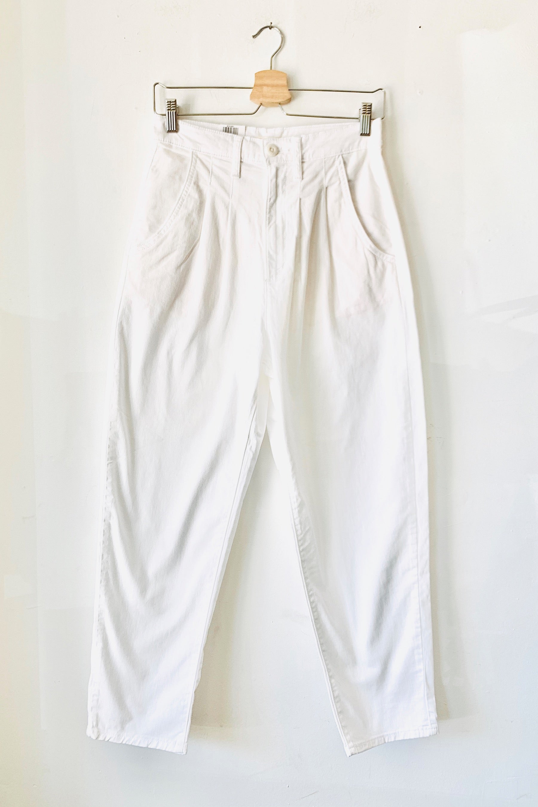 A fresh update on an '80s style in a fresh bright white. A flattering high rise with a dramatic curve at the hip that tapers at the leg.