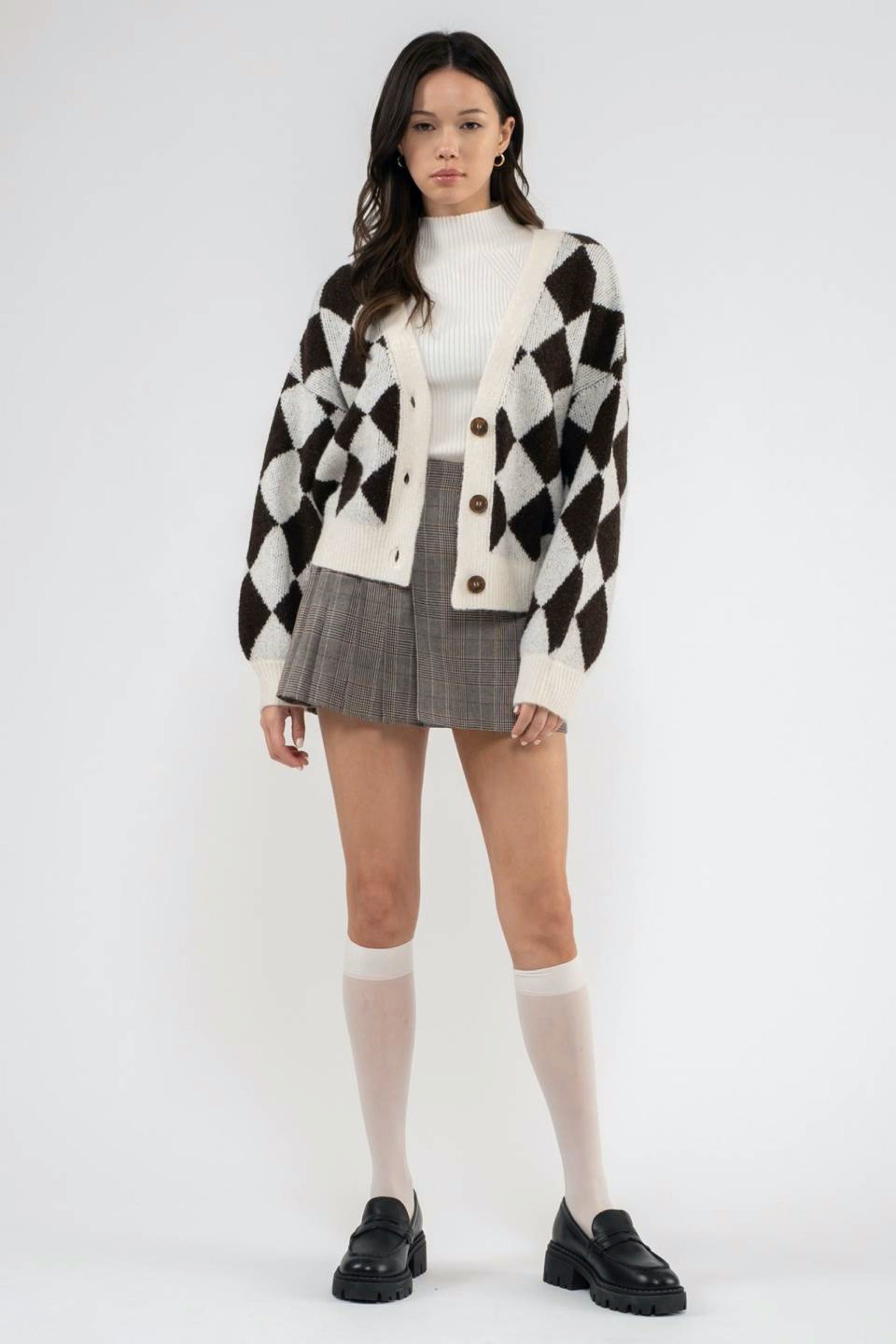 V-neck cardigan featuring an oversized balloon sleeve in a dark brown argyle pattern with tortoise buttons.