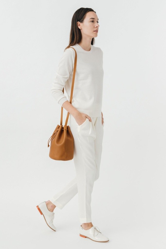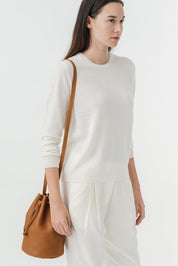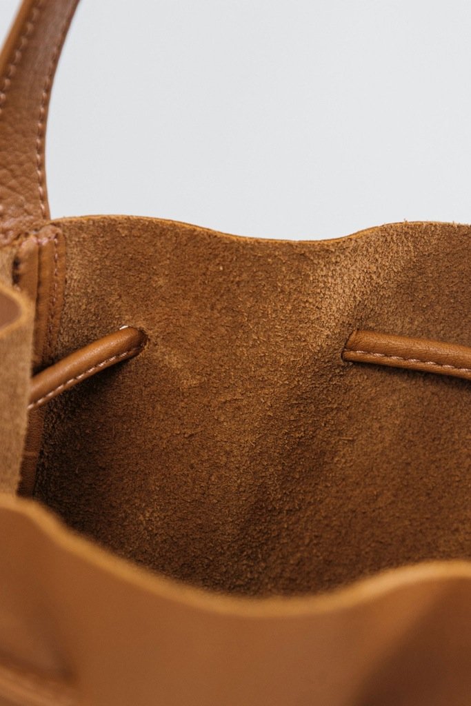 A perfectly simple bucket bag in supple, full-bodied leather. Drawstring cinch closure. Natural milled leather with 23" strap drop.