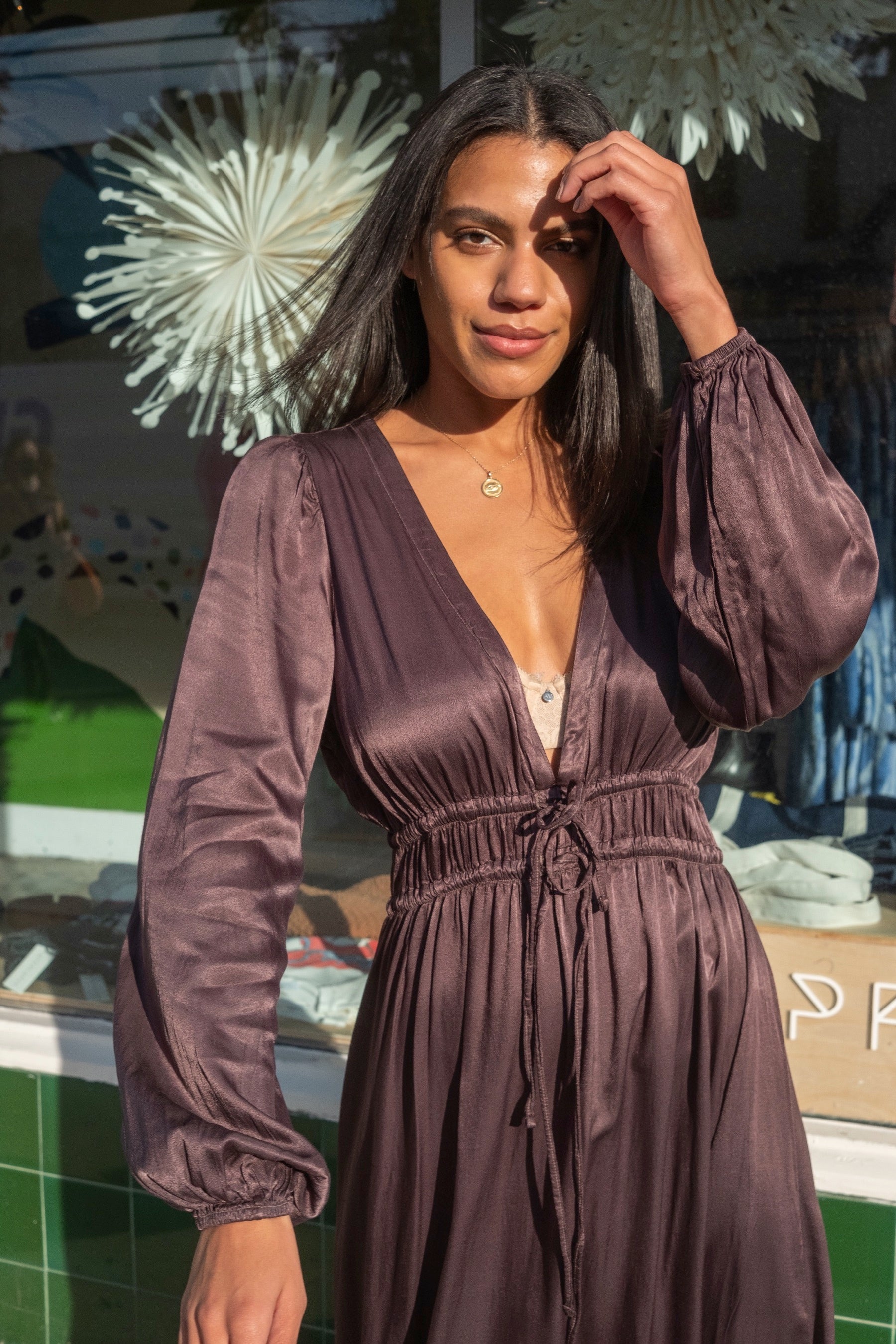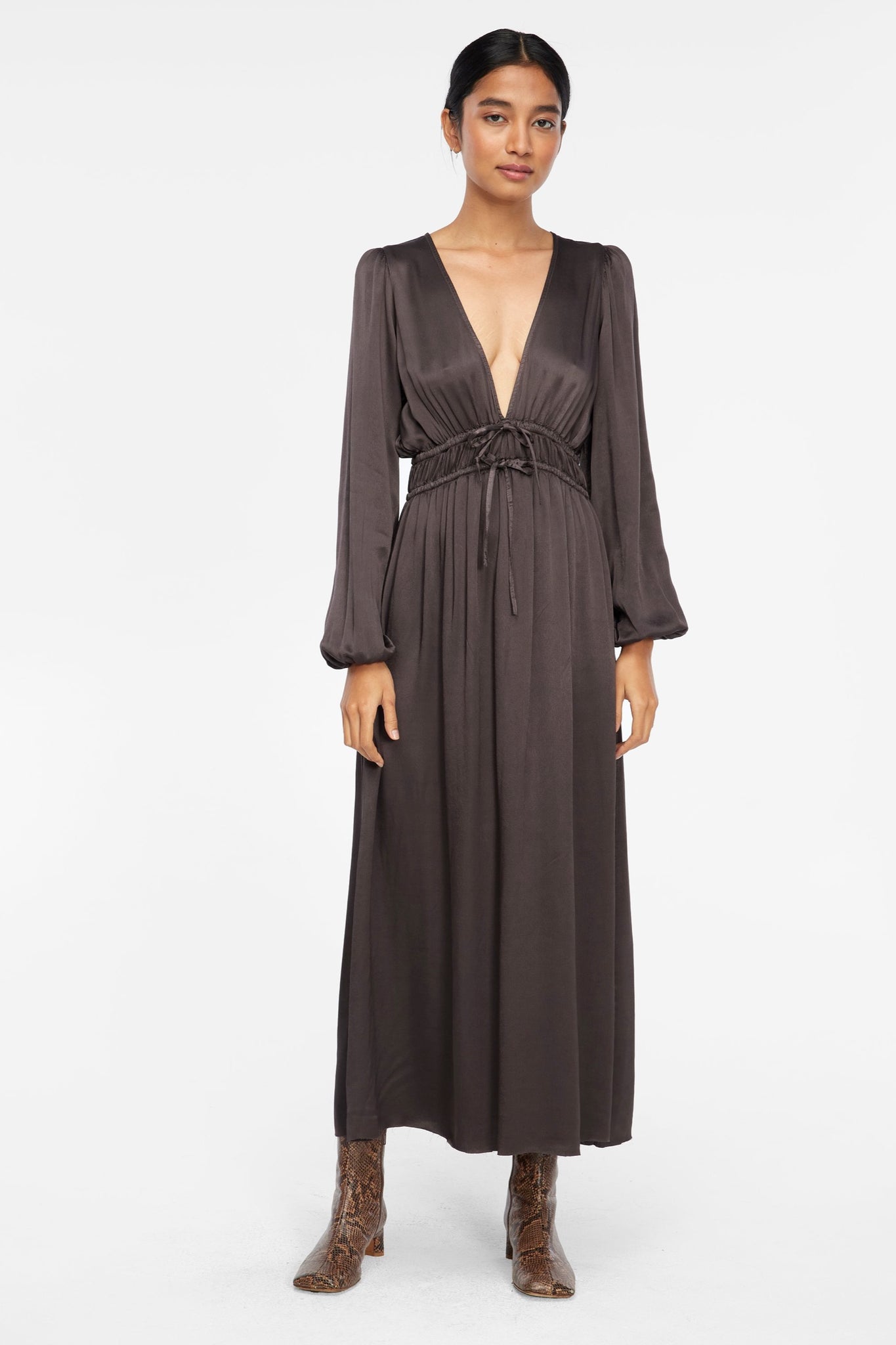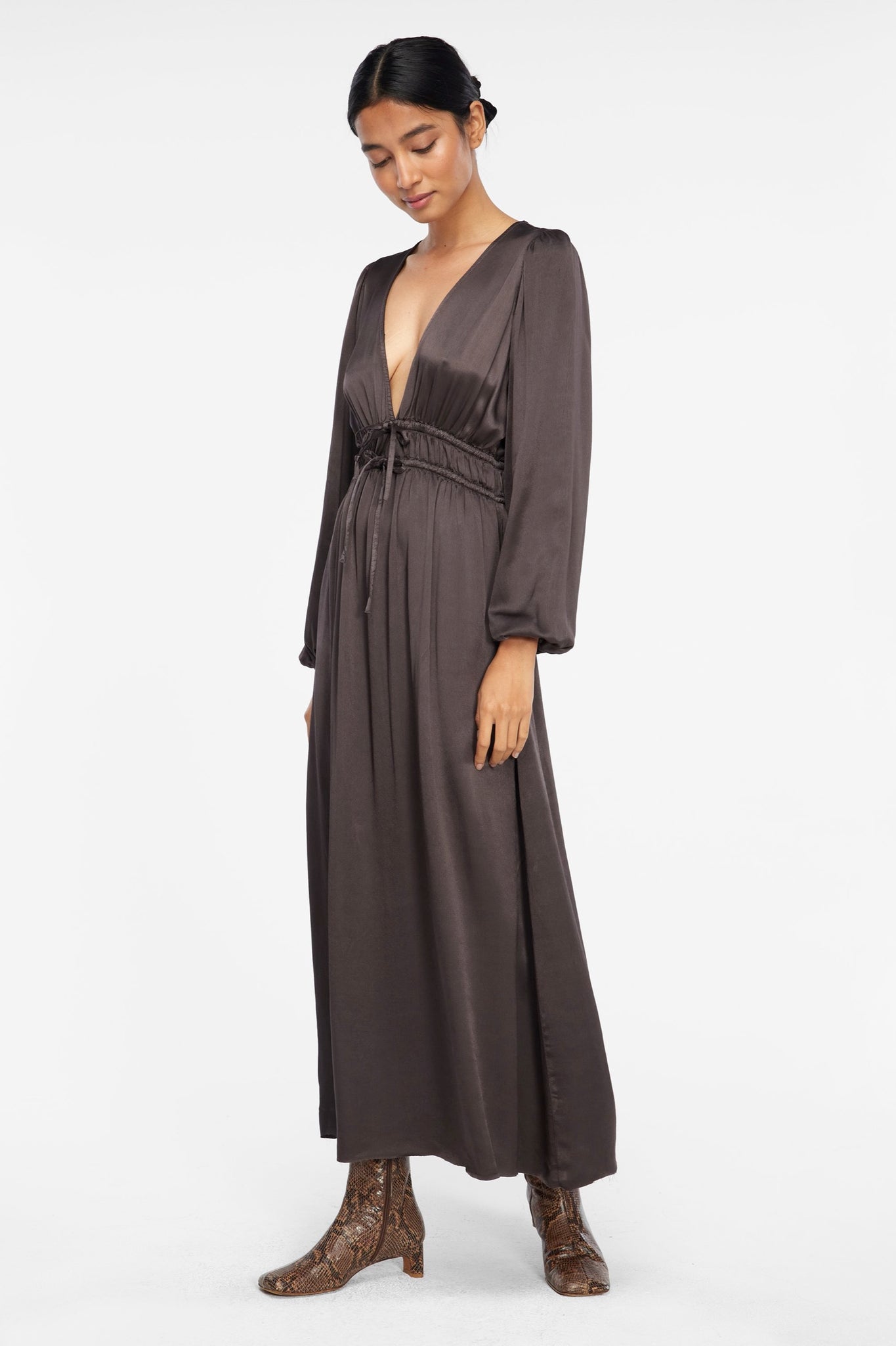 A gorgeous draped occasion dress with plunging neckline and adjustable drawstrings at waist for the most flattering but secure fit. Made from LACAUSA's insanely soft, garment dyed Martini Satin.