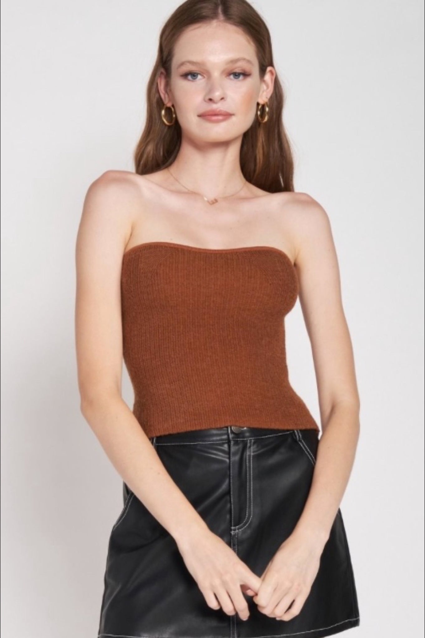 Brown tube top featuring a fuzzy sweater knit fabric, the perfect Fall transition top.
