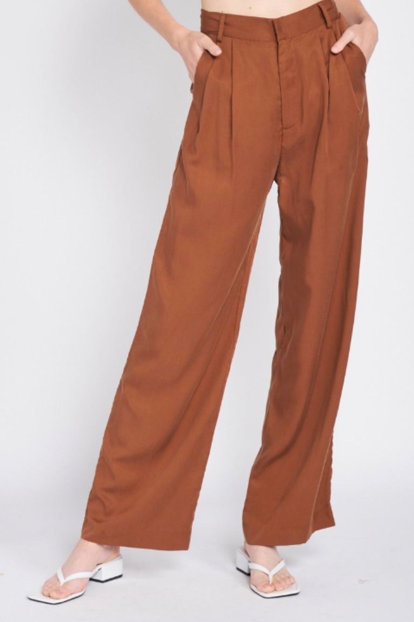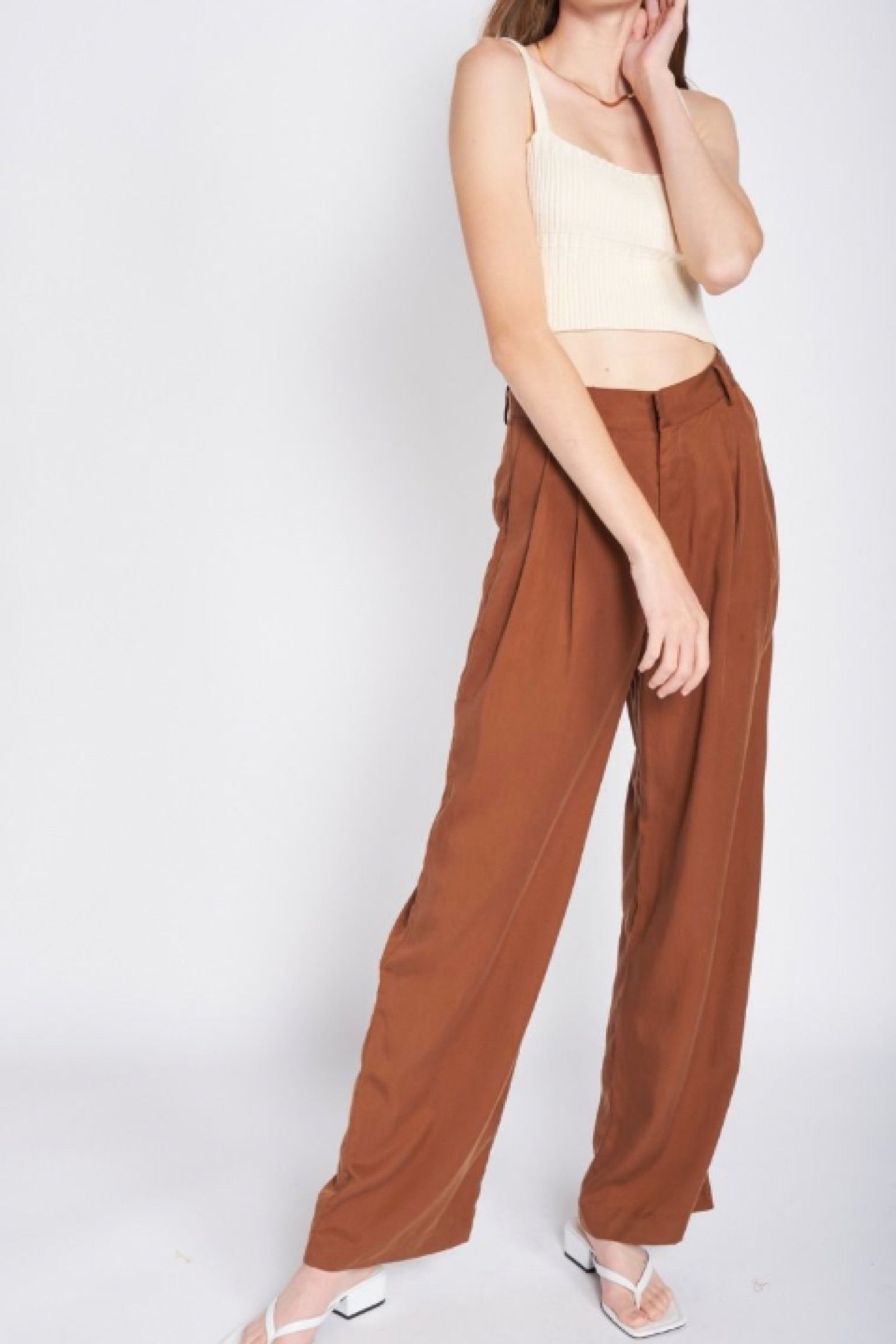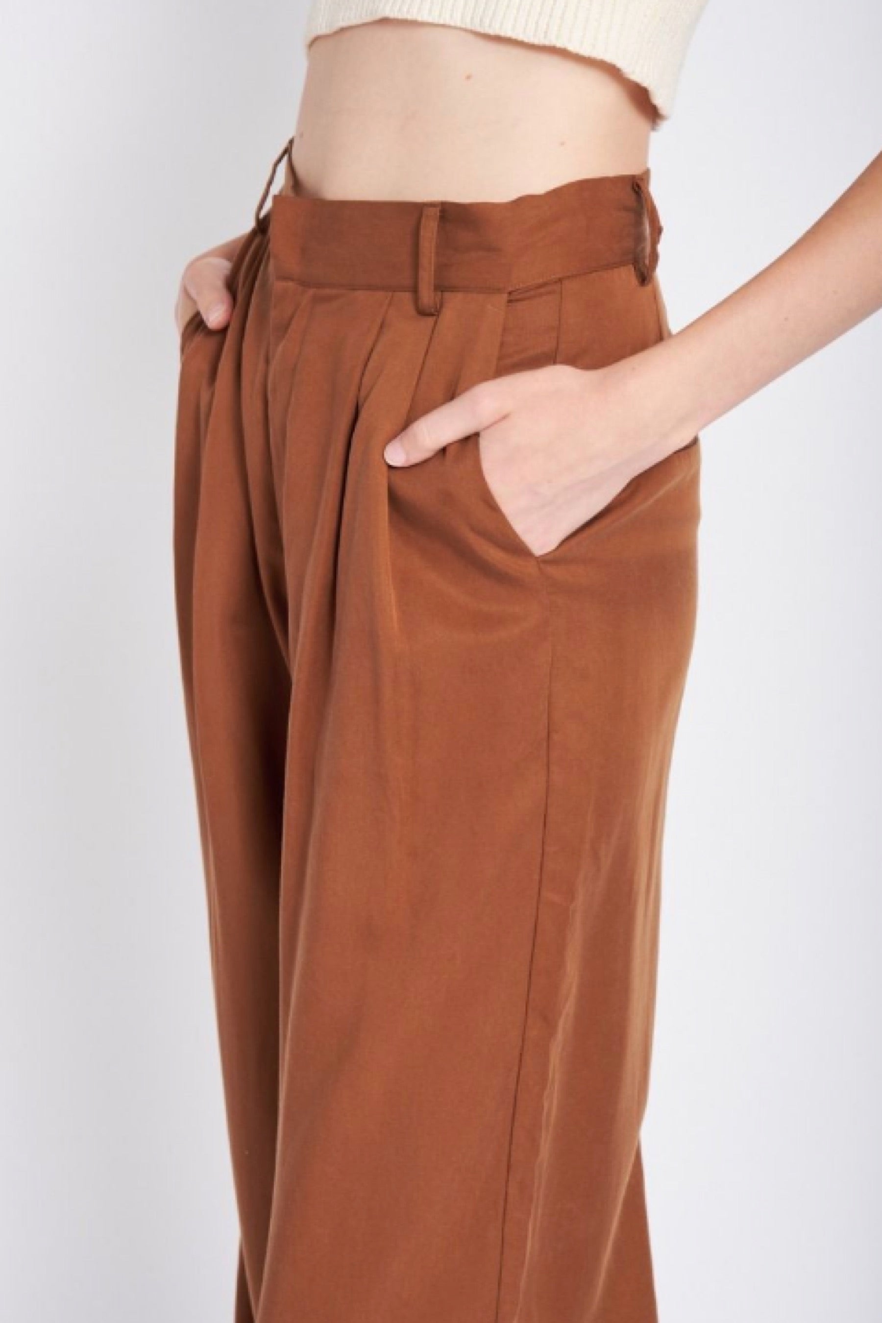 Brown trousers featuring pleats along the waist and a high rise with a wide relaxed leg.