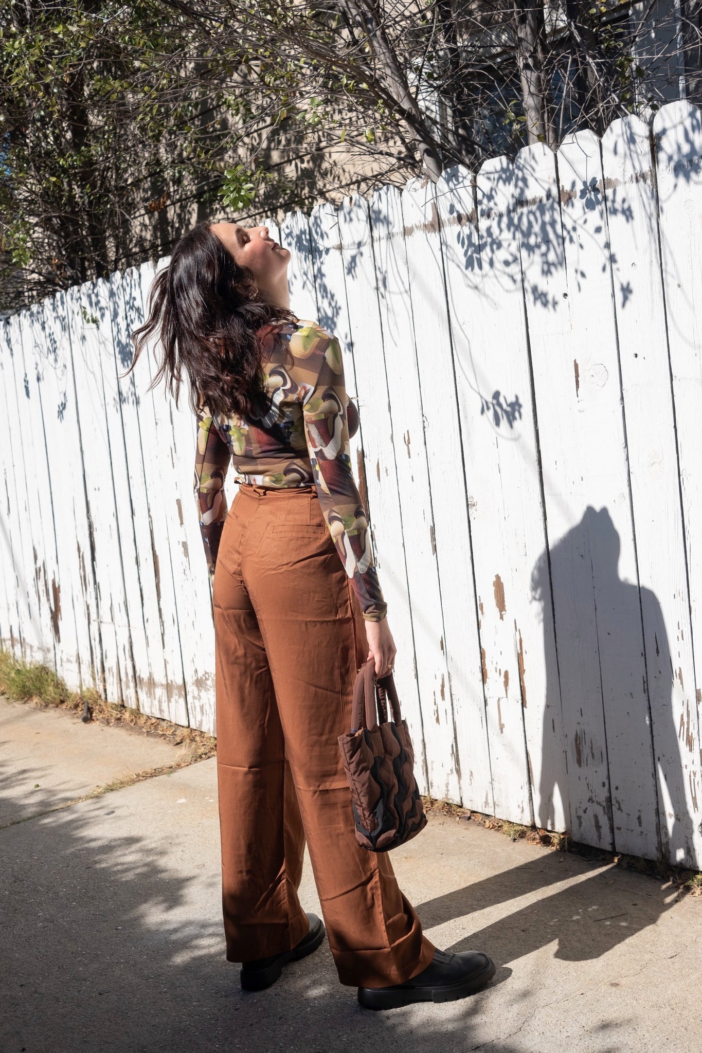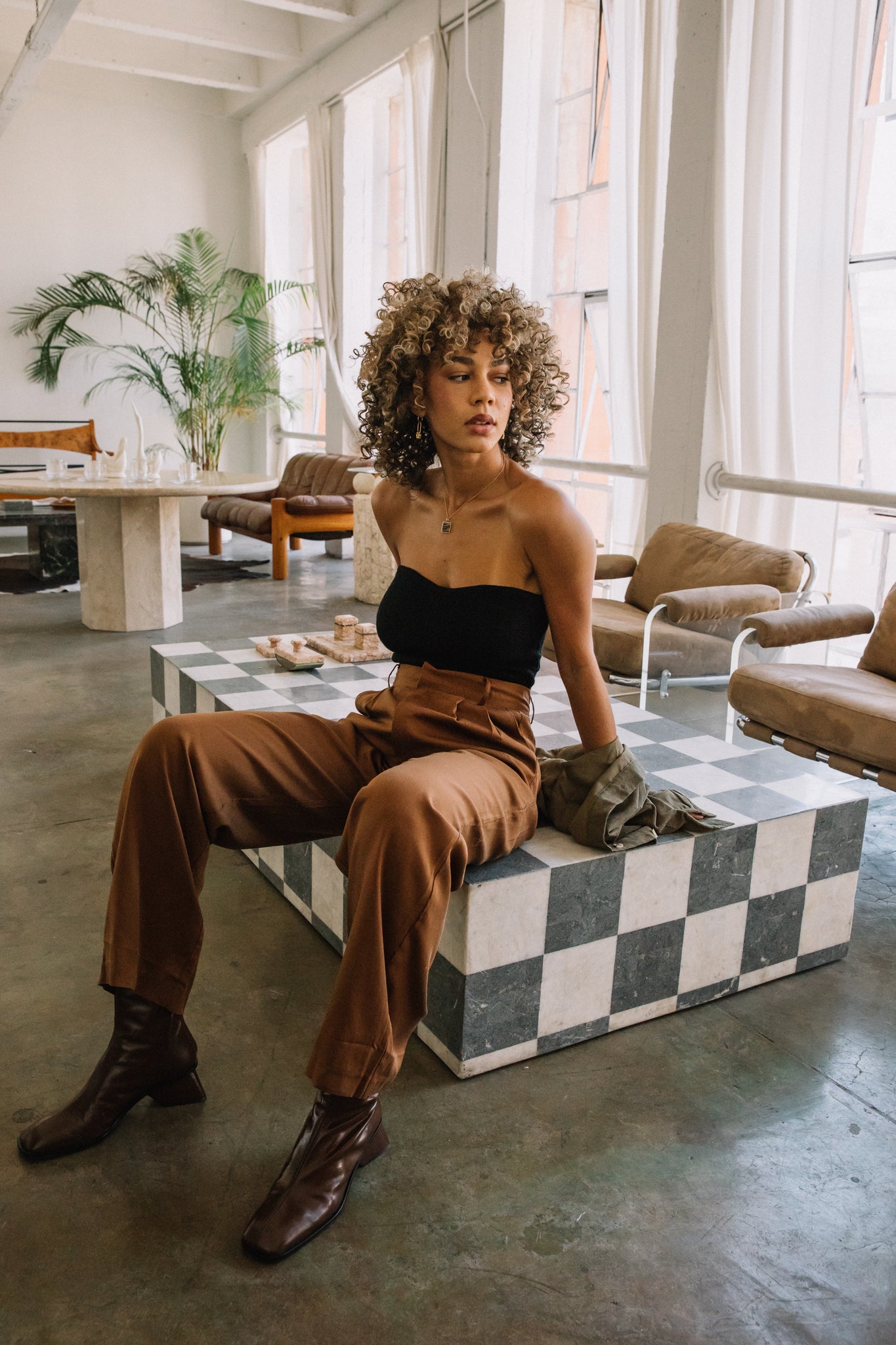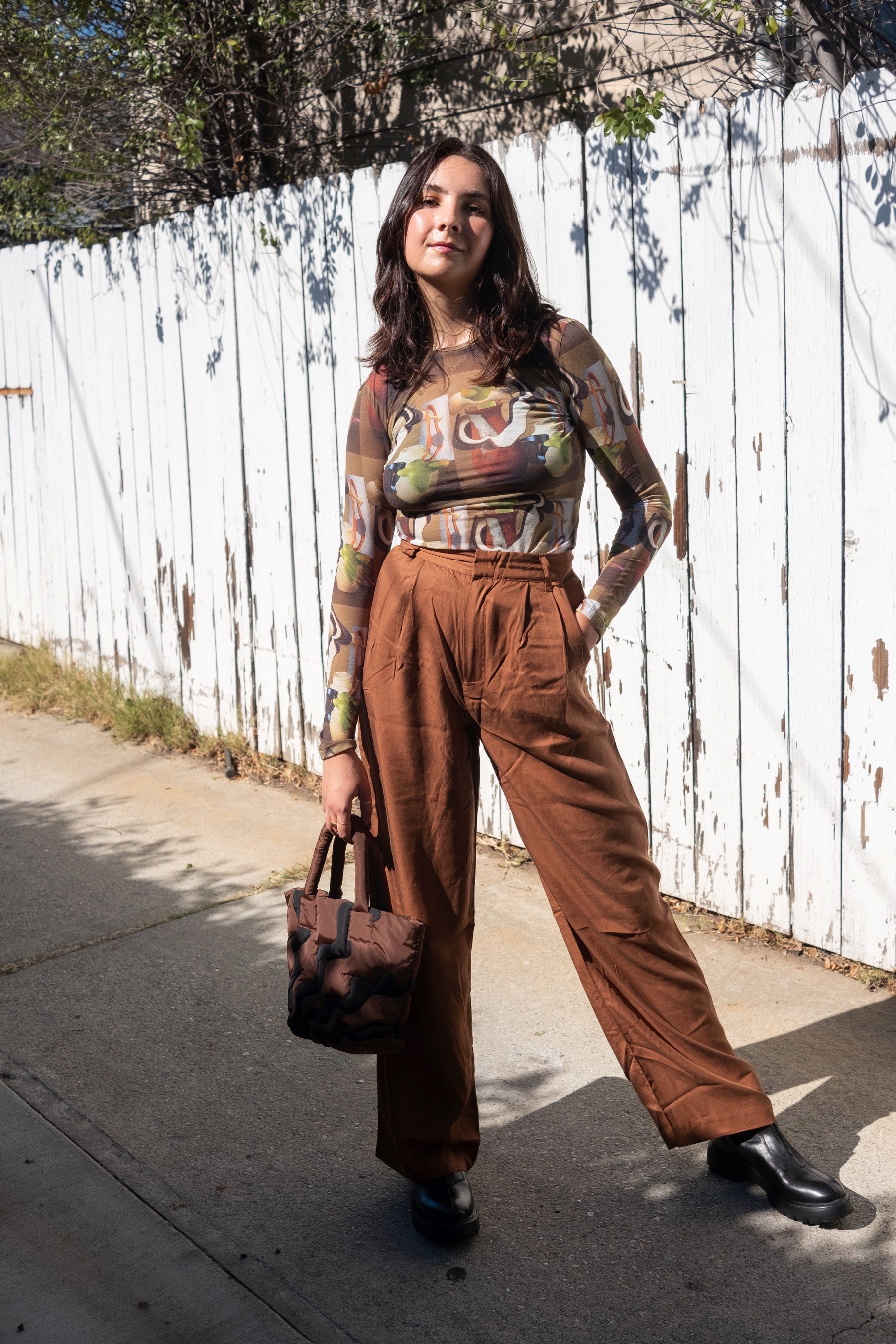 Brown trousers featuring pleats along the waist and a high rise with a wide relaxed leg.