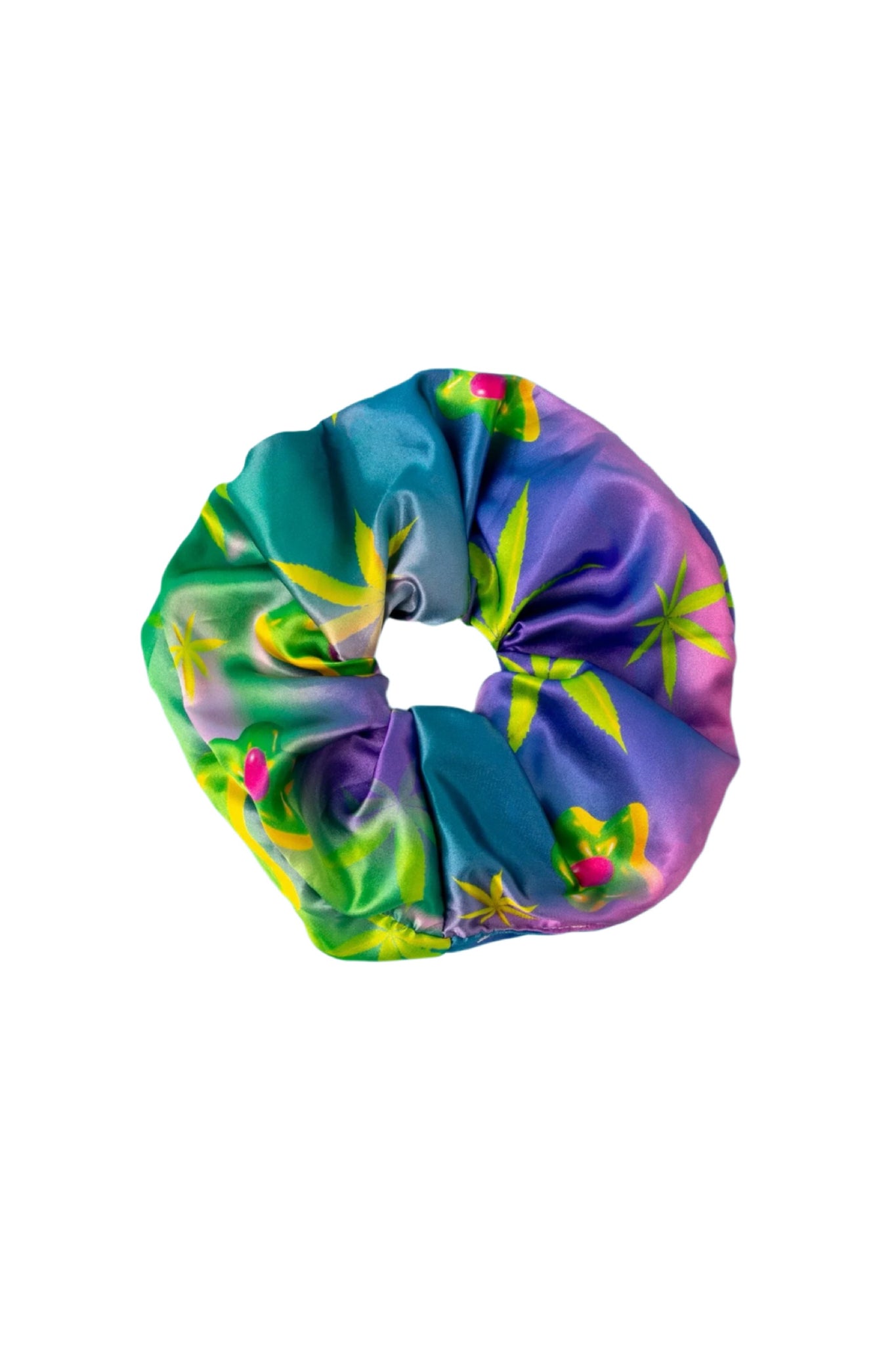 When the Broccoli team realized that scrunchies rhyme with munchies, they had no choice but to make some. These ruffly silk scrunchies are covered in puffy blossoms and weed leaves floating in tie-dyed space, a print designed by Broccoli Issue 07 cover artist Diana Lynn VanderMuelen.