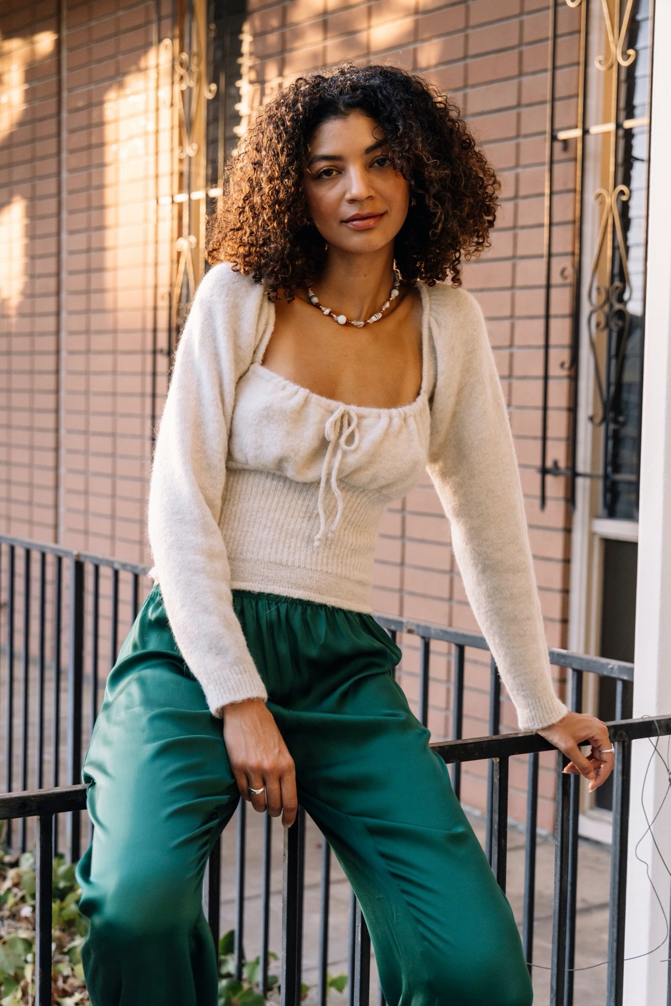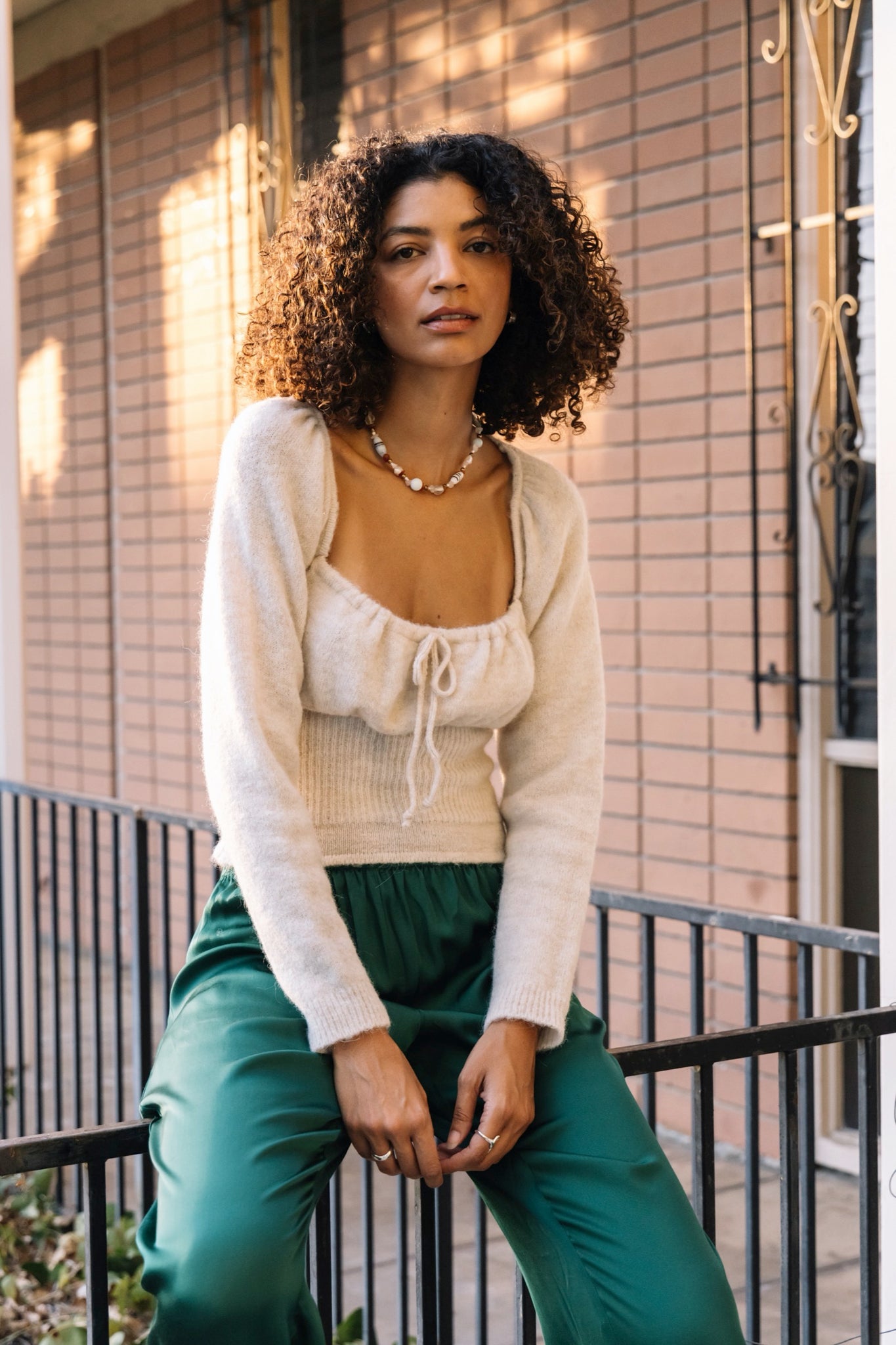 Knit top featuring a ruched chest with adjustable tie and a gathered fitted body.
