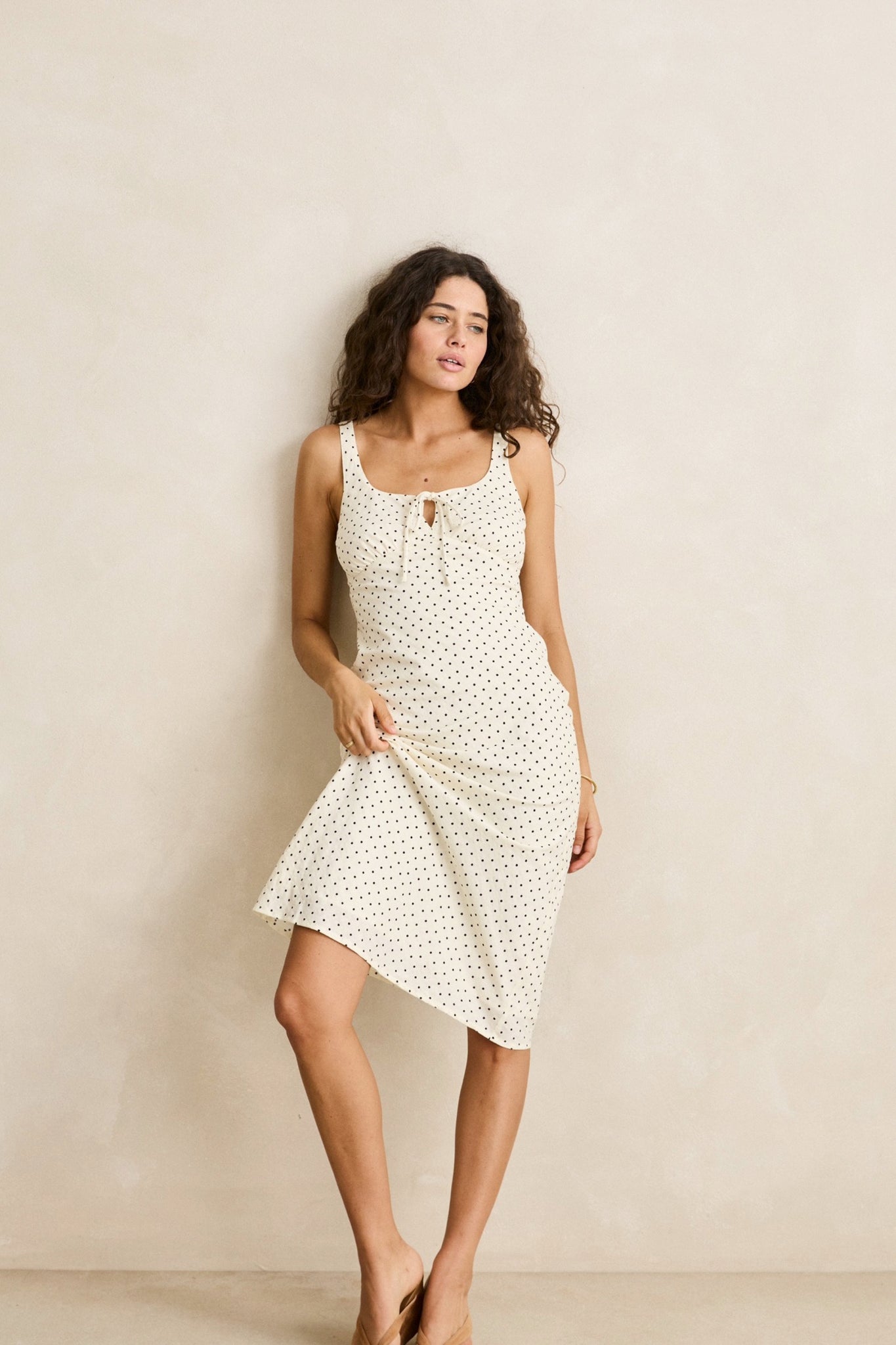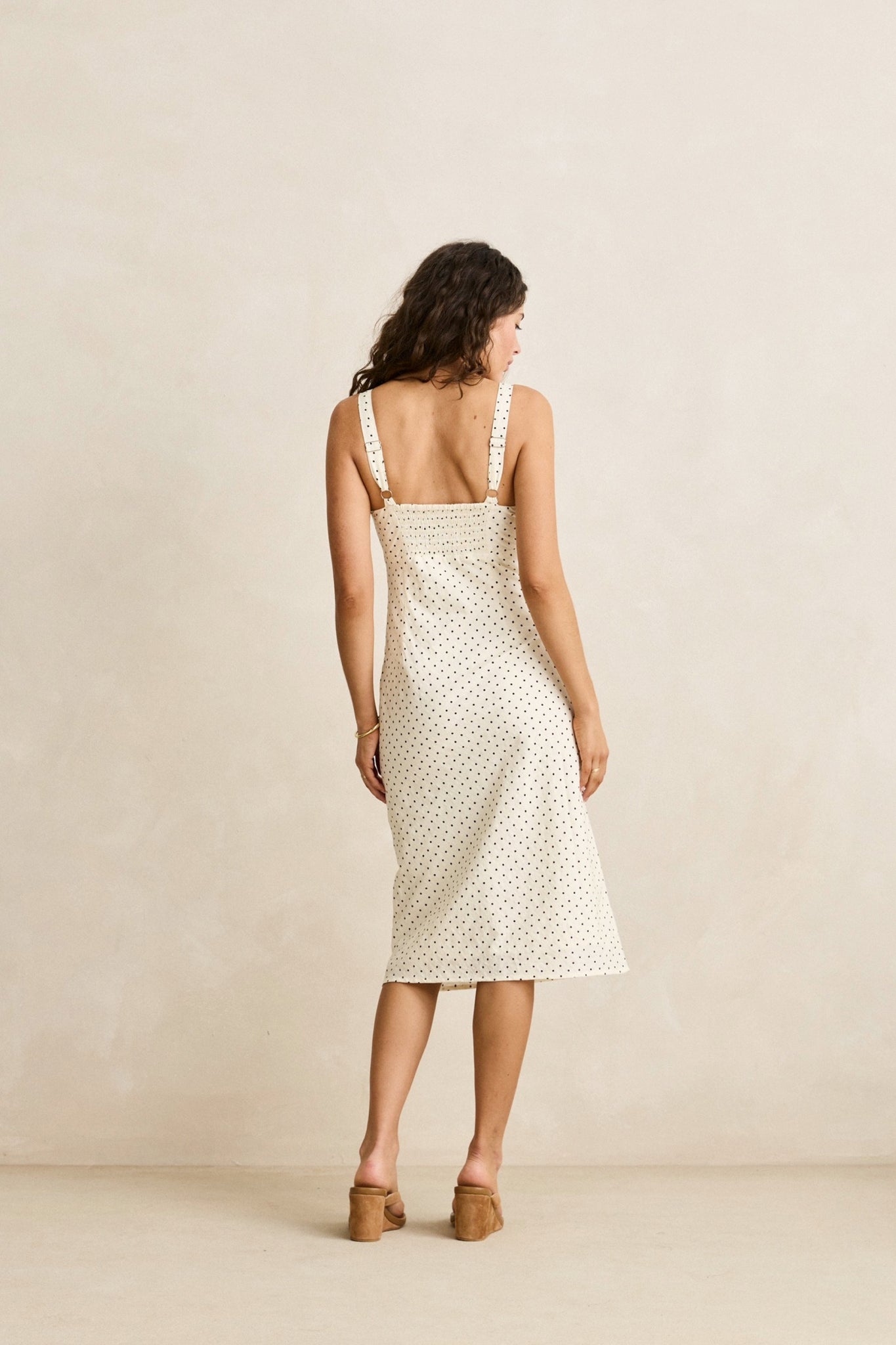 The Polka Midi Dress offers a relaxed silhouette with adjustable straps, a softly gathered bust, and an invisible zip closure. Its polka dot print and clean lines make it perfect for warm-weather dressing.