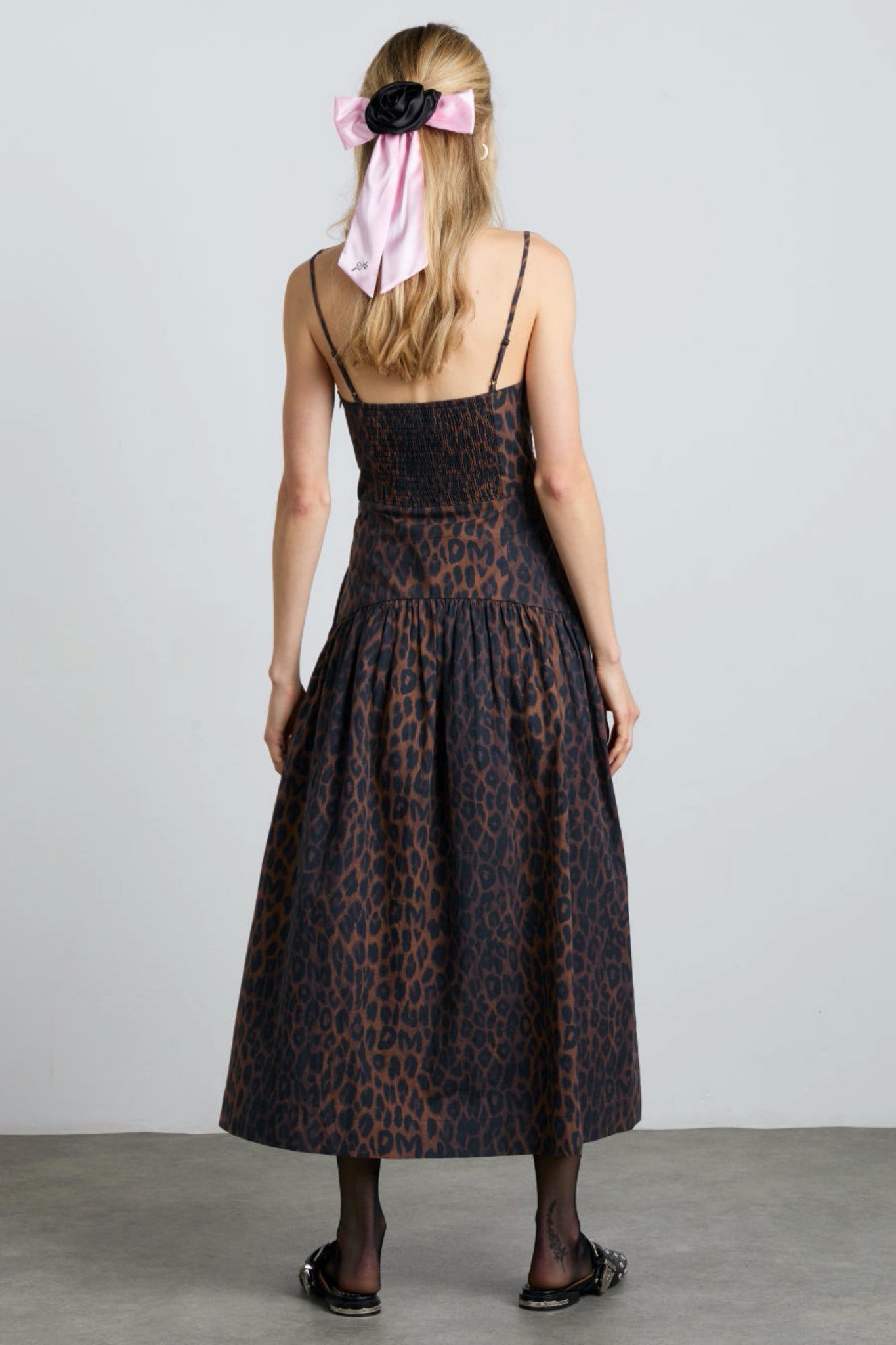Damson Madder's hero Persephone drop waist midi dress; reimagined in signature dark leopard print.