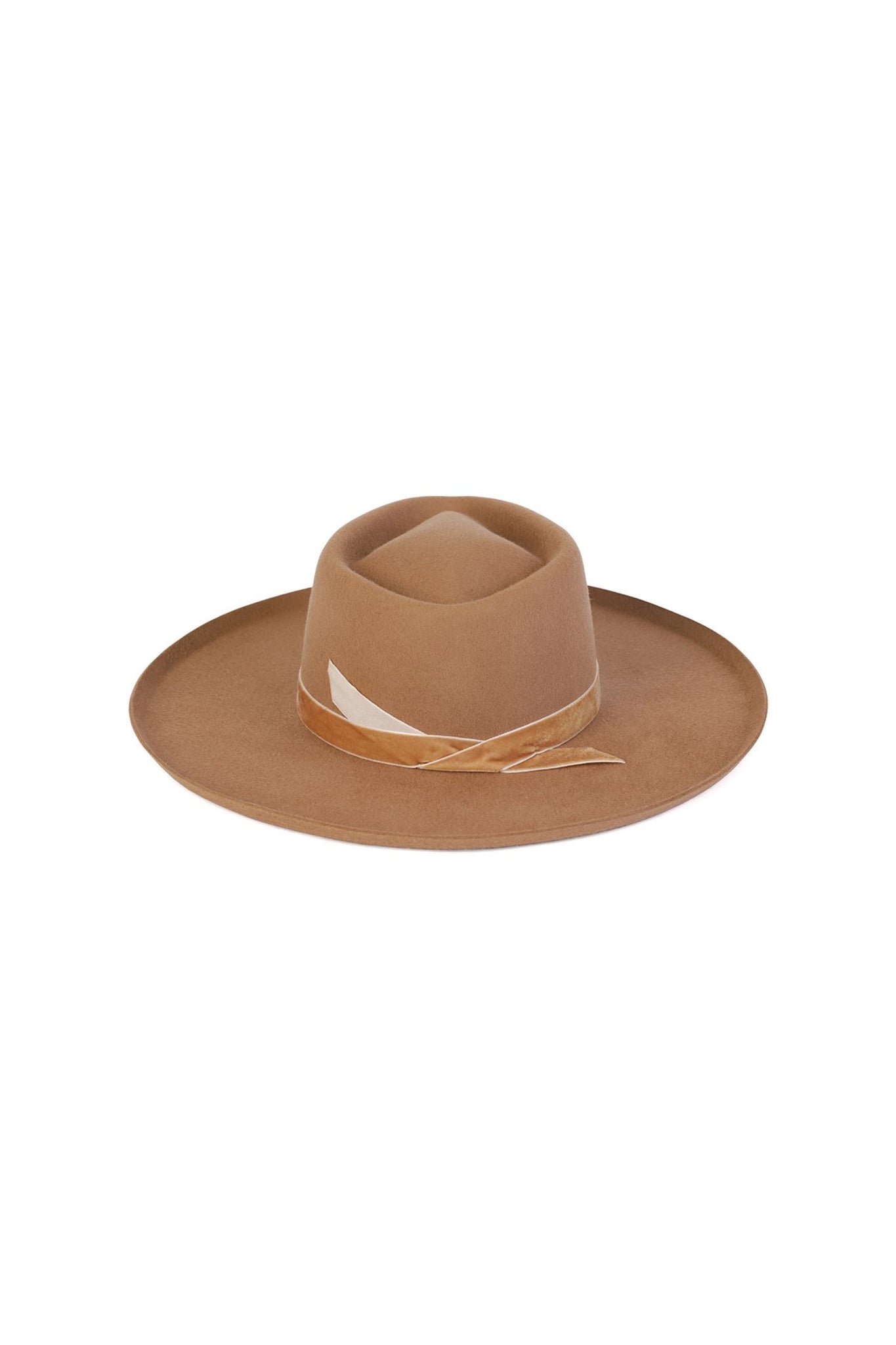 A vintage inspired silhouette featuring a diamond crown with a flicked edge and vintage orange velvet trim. A great uni-sex style.