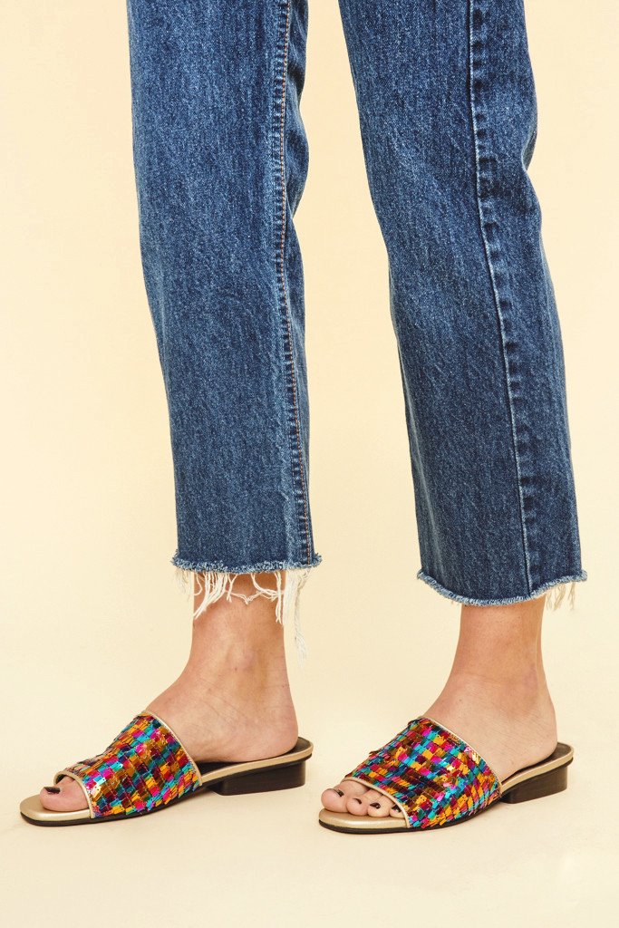 Put some shine in your step in these rainbow sequin slides! Pair with denim to sass up your day-to-day.