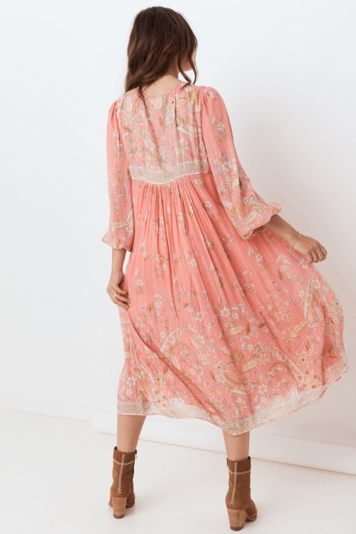 This dreamy dress with its stunning print placement on both the front and back yoke, is one for the dreamers and adds a laid-back, feminine charm to any occasion. Featuring gathers from the yoke, a neck tie with tassel and an elastic sleeve cuff to gently billow the sleeve, this ever-popular style is instantly disarming and easy to love.
