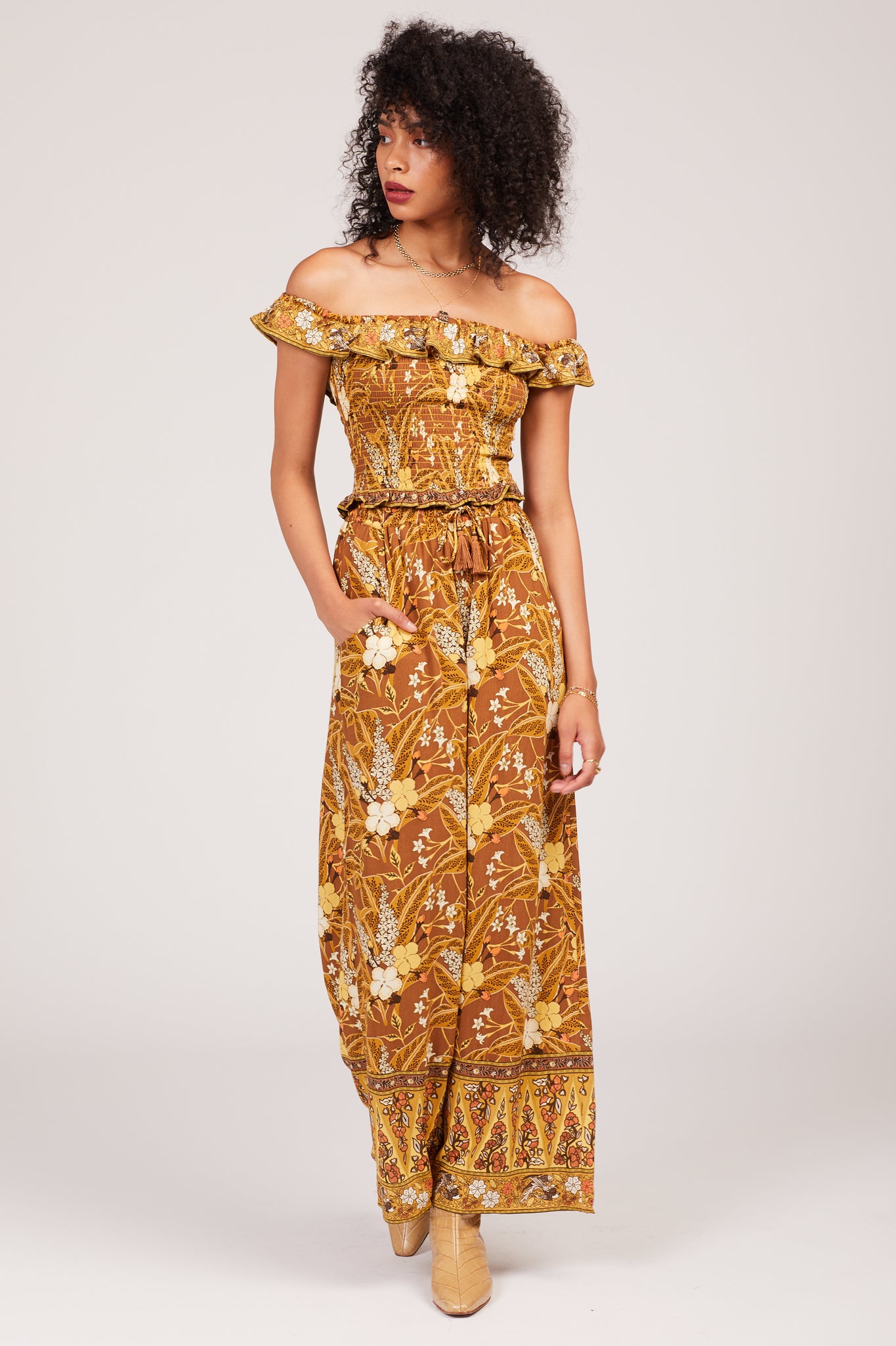 The gorgeous earth tones on this off the shoulder top will spice up your autumn wardrobe! Features a ruched bodice and cropped fit. Pair with the matching wide leg pants for a comfortable, yet effortless look!
