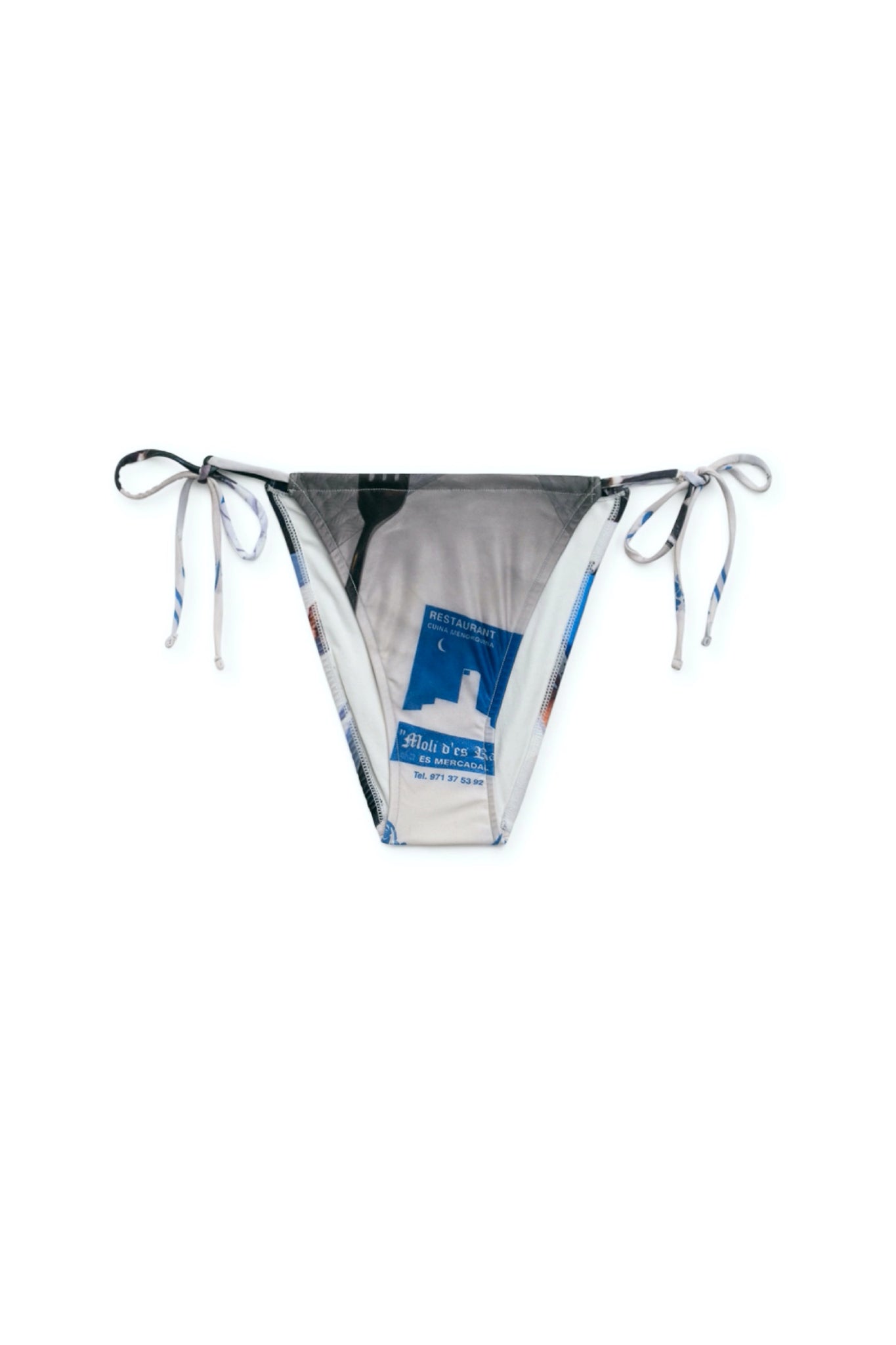 Adjustable drawstring bikini bottom made from recycled material and featured in an exclusive photo print.