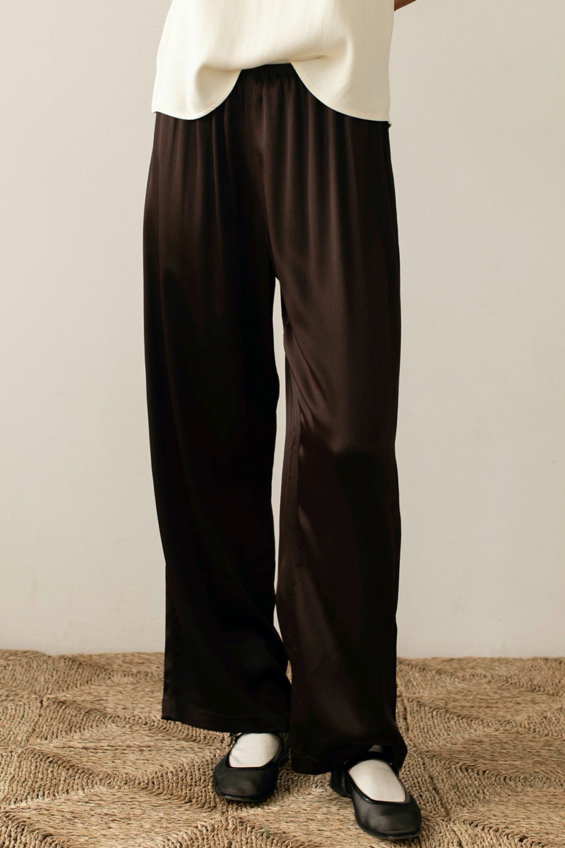Donni's signature simple pant crafted with luxe and elevated Satiny, featuring a satin-like sheen, wide leg fit and elastic waistband.