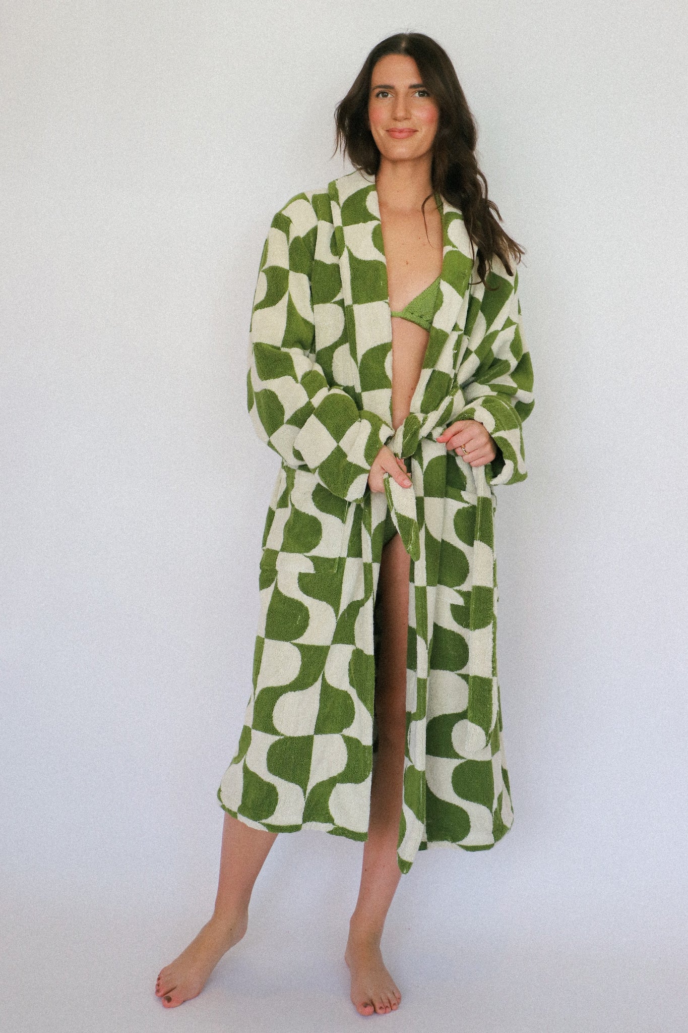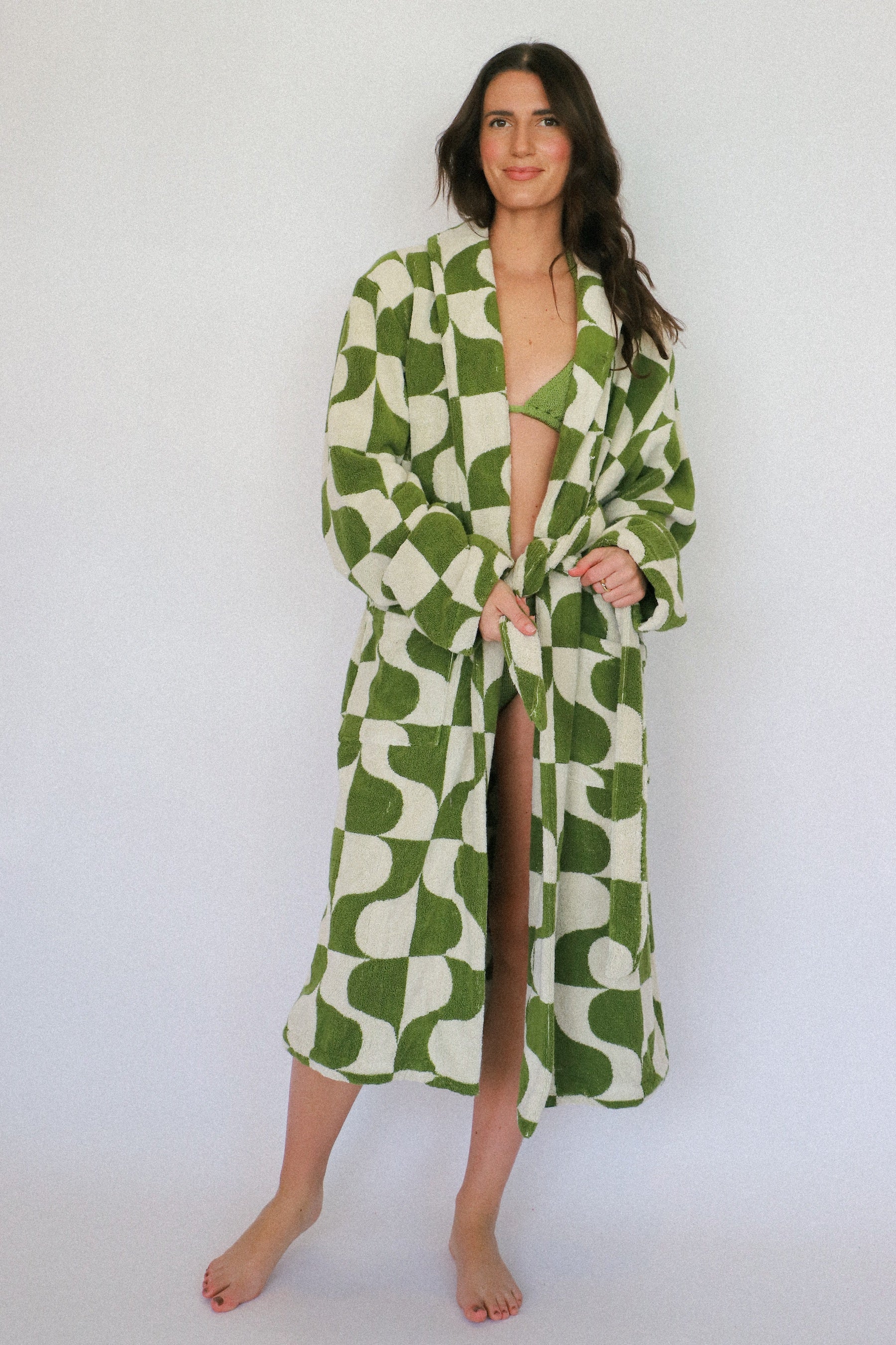 The Ferus is our first departure from the boundaries of straight lines. Much like the artists who filled the gallery this pattern owes its namesake to, we felt it necessary to break the rules—even if they were our own. This unisex, terry cloth robe comes in our signature martini olive and natural cotton colors in three sizes.