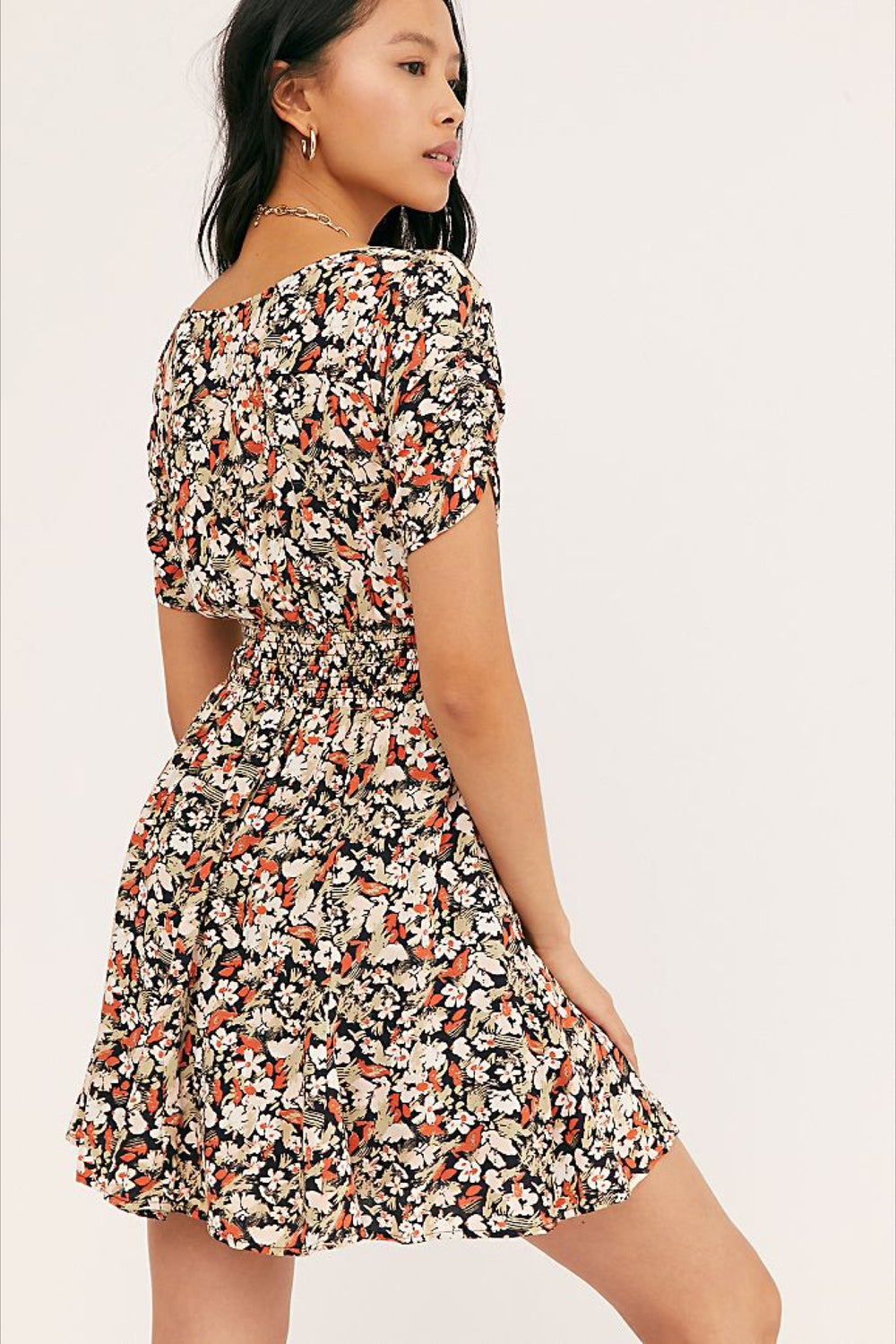 Femme and floral mini dress featuring V-neckline and front tie feature with defined waist for added shape.