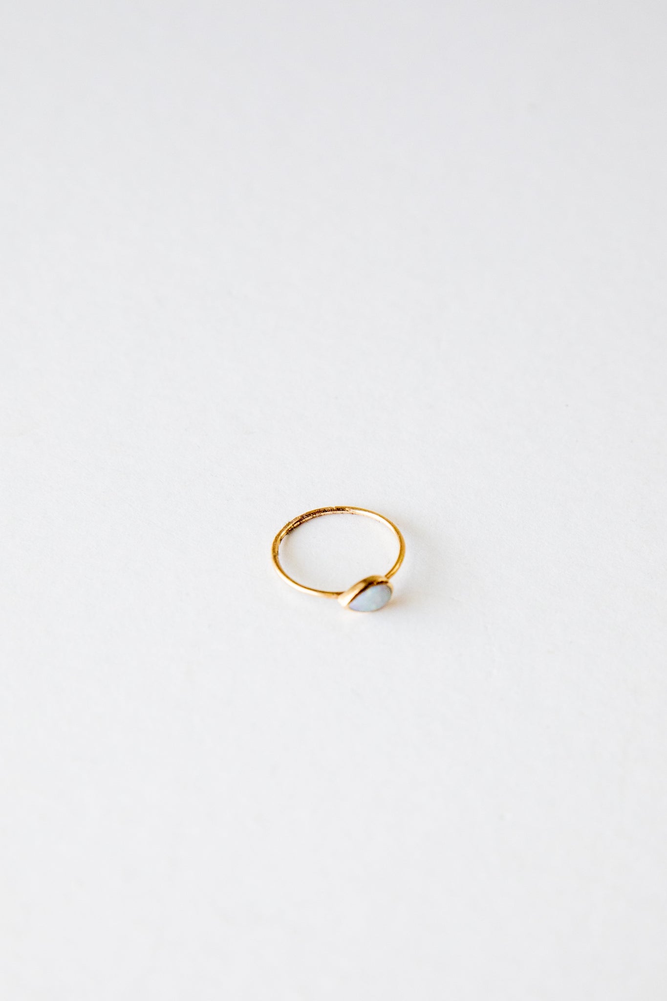 Dainty gold ring featuring a thin rounded band and a teardrop shaped opal at the center.