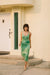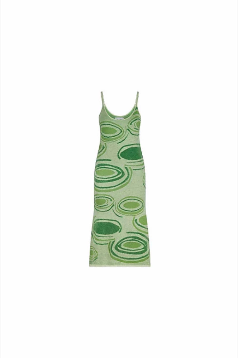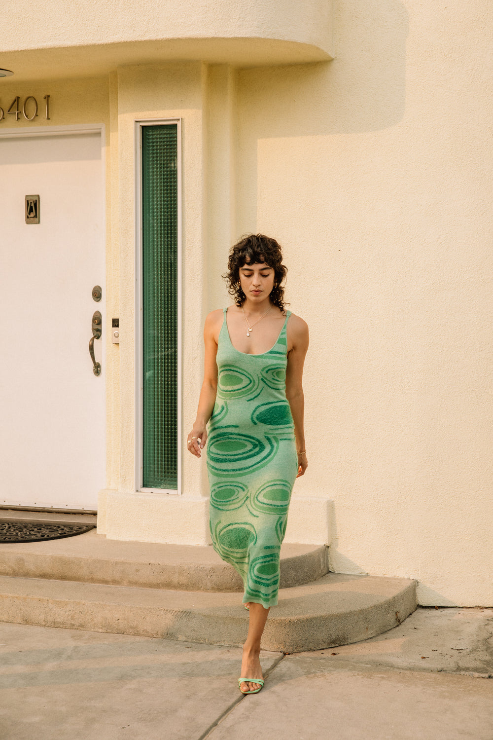 Knit midi length dress with back cut out detail and adjustable straps in an exclusive lily pad print.