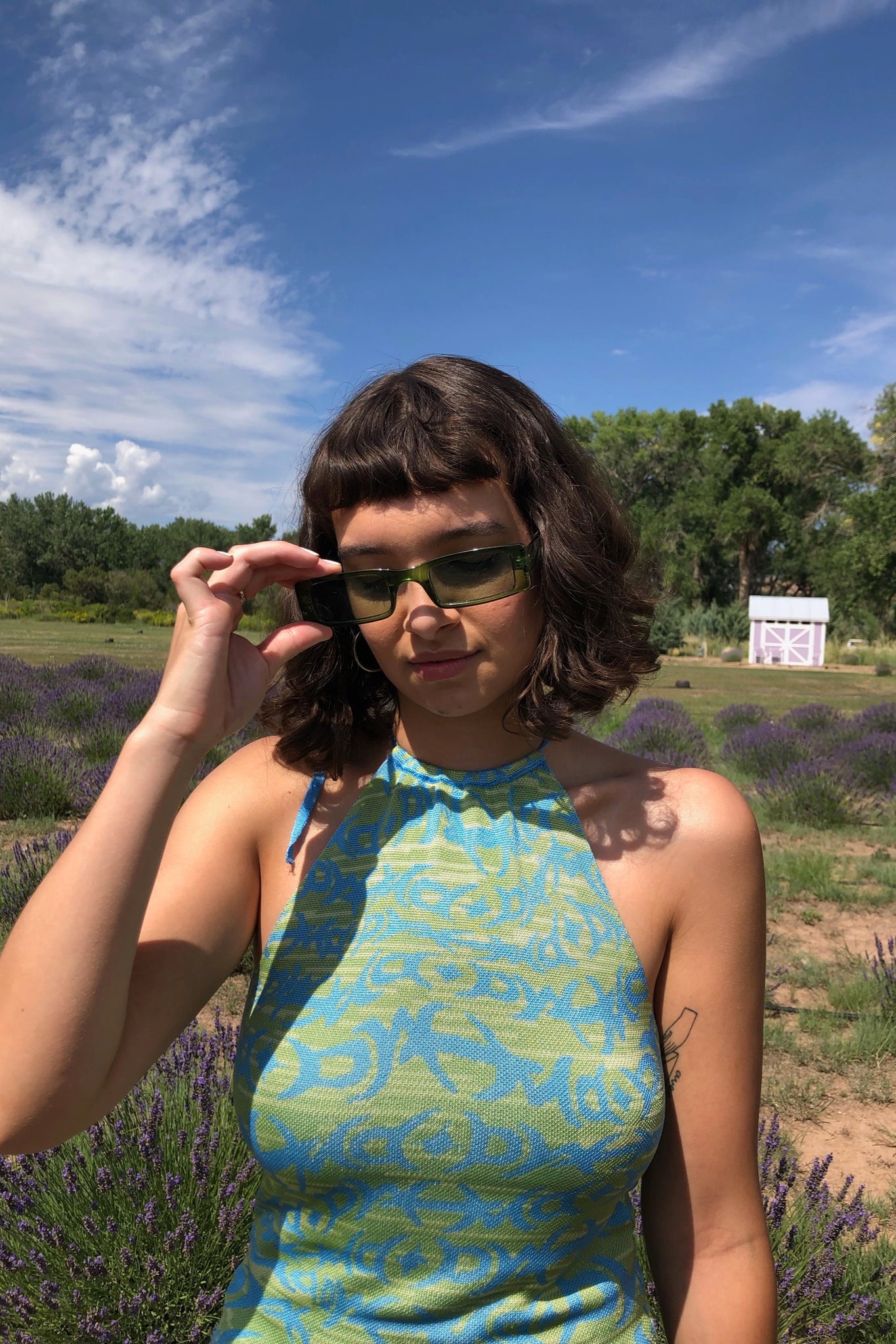 Halter midi dress with adjustable straps and open back. V-shape bottom in jacquard Tattoo Print.