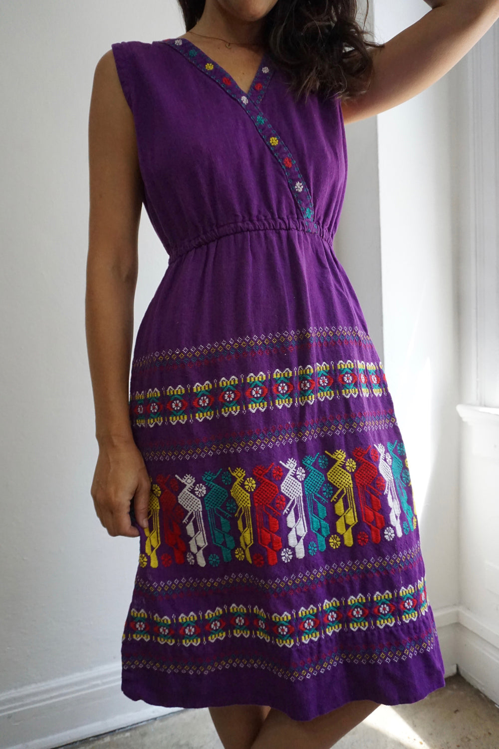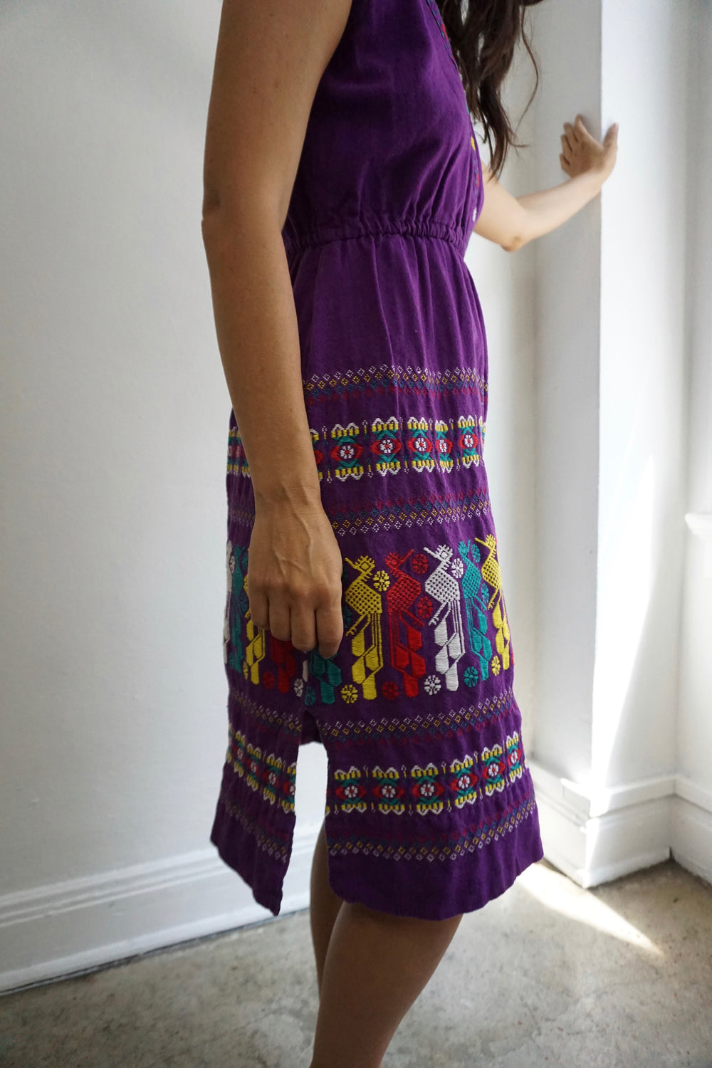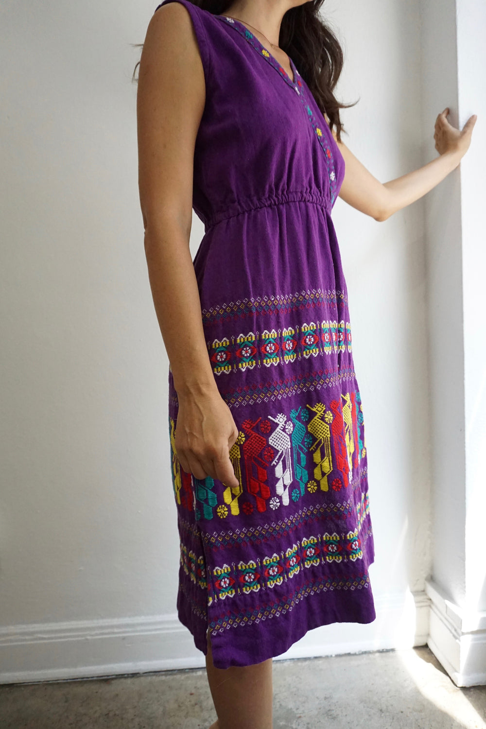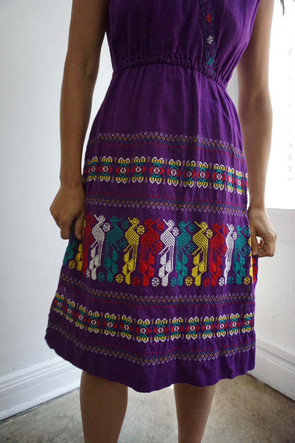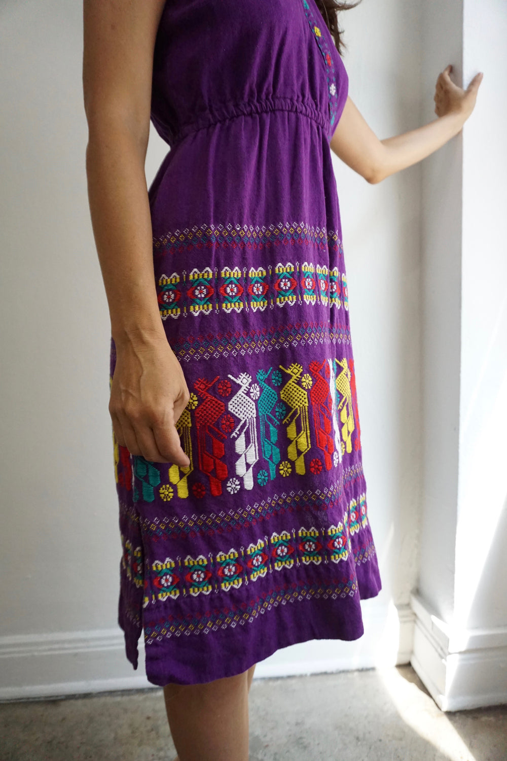 1970s Guatemalan woven dress. 100% cotton. V-neck. Elastic waist. Intricate, multicolored woven design on skirt.