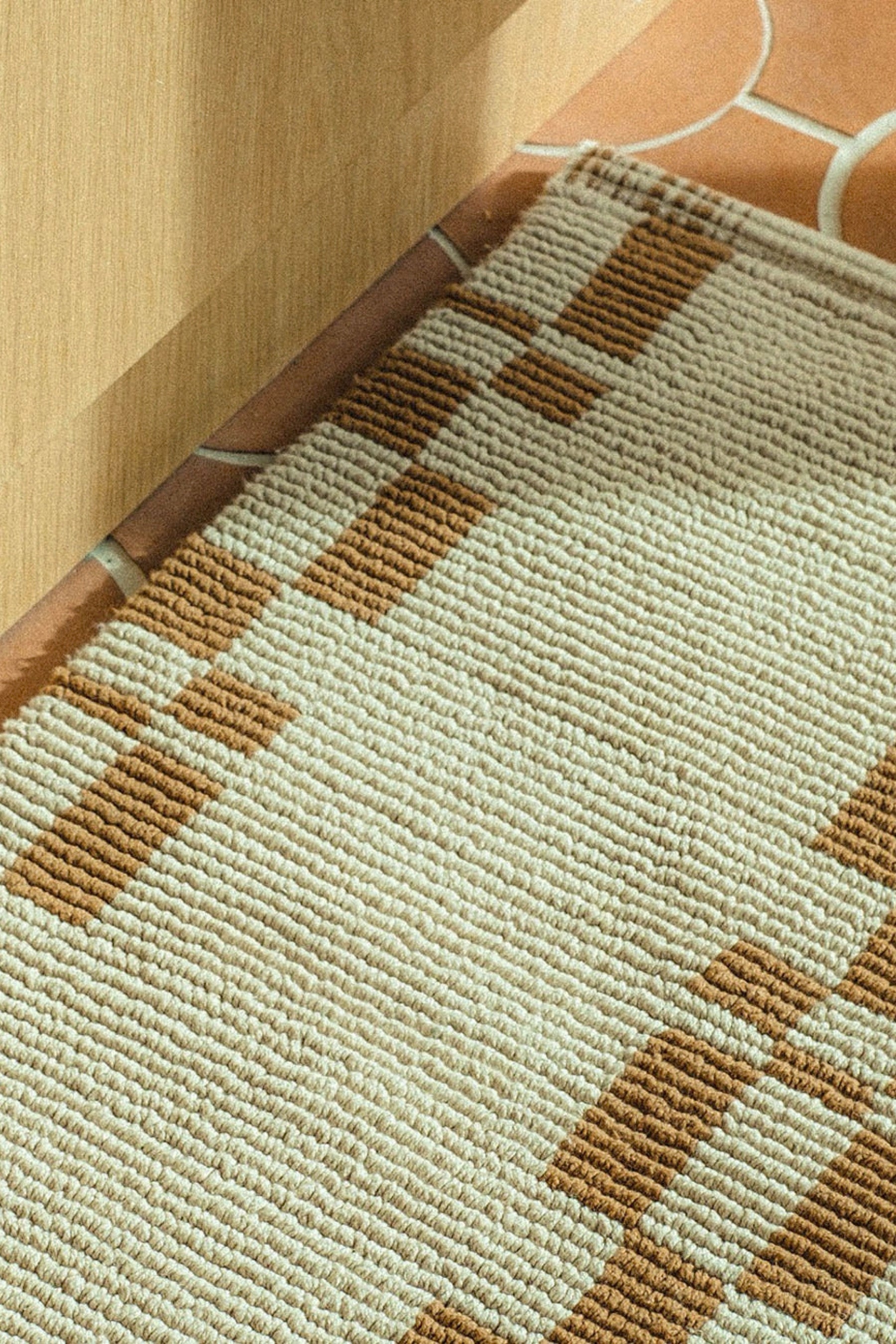 Featuring a smooth surface created by small tight loop, this neutral piece has a hazelnut geometric pattern on a cream background.