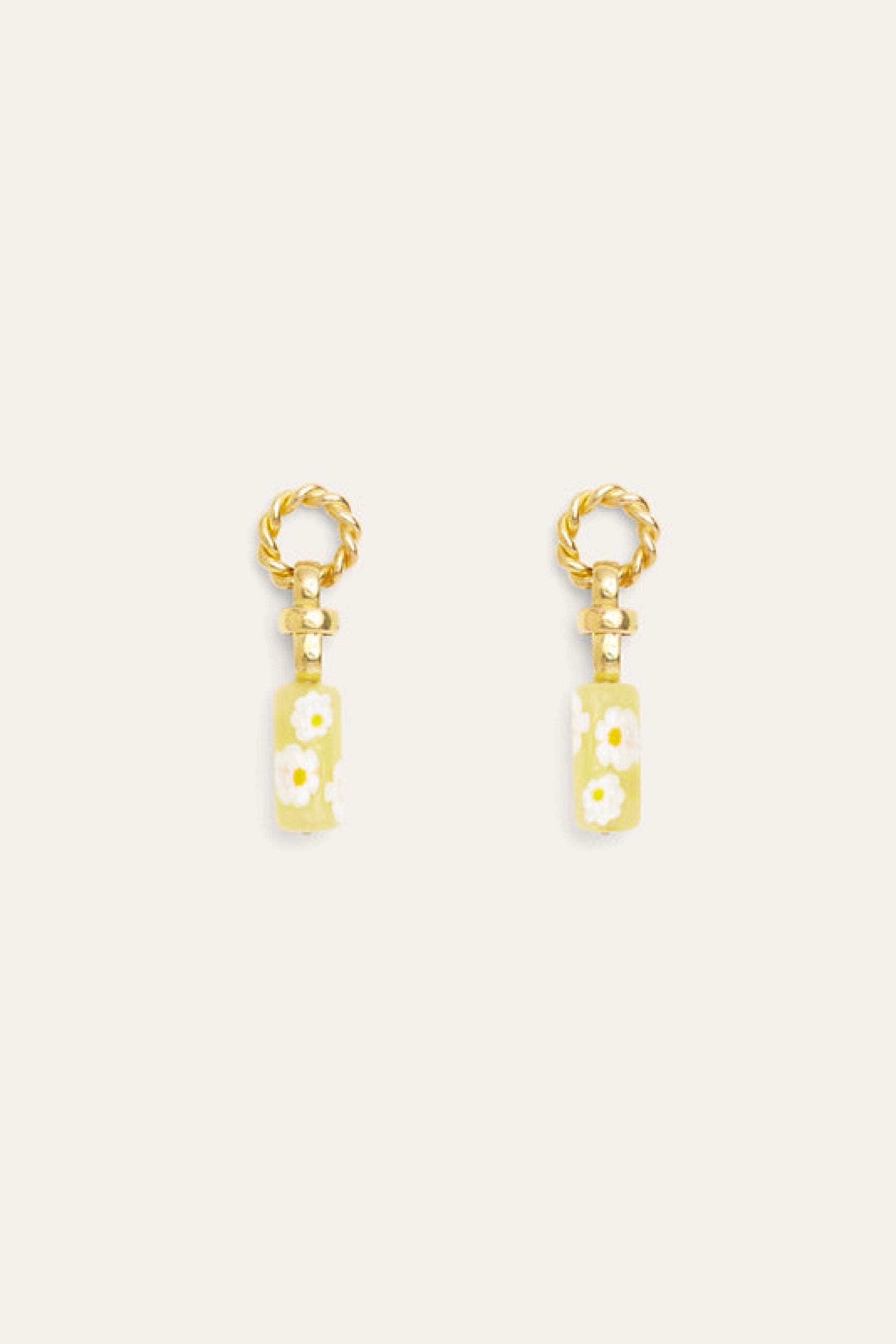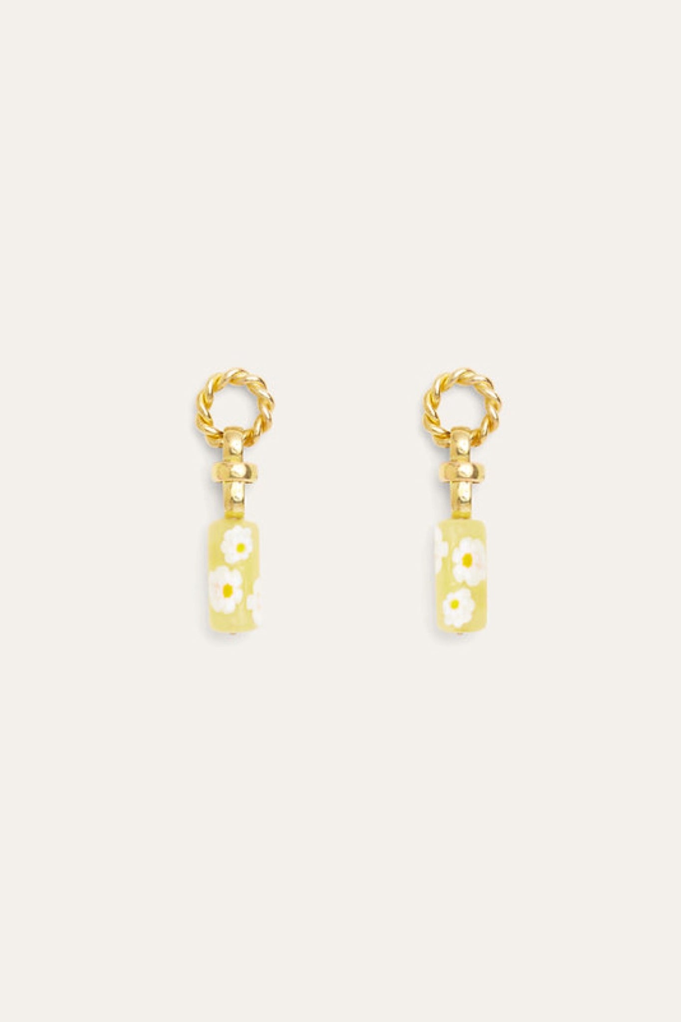 Handmade yellow millefiori bead on a brass stud with a sterling silver ear post.