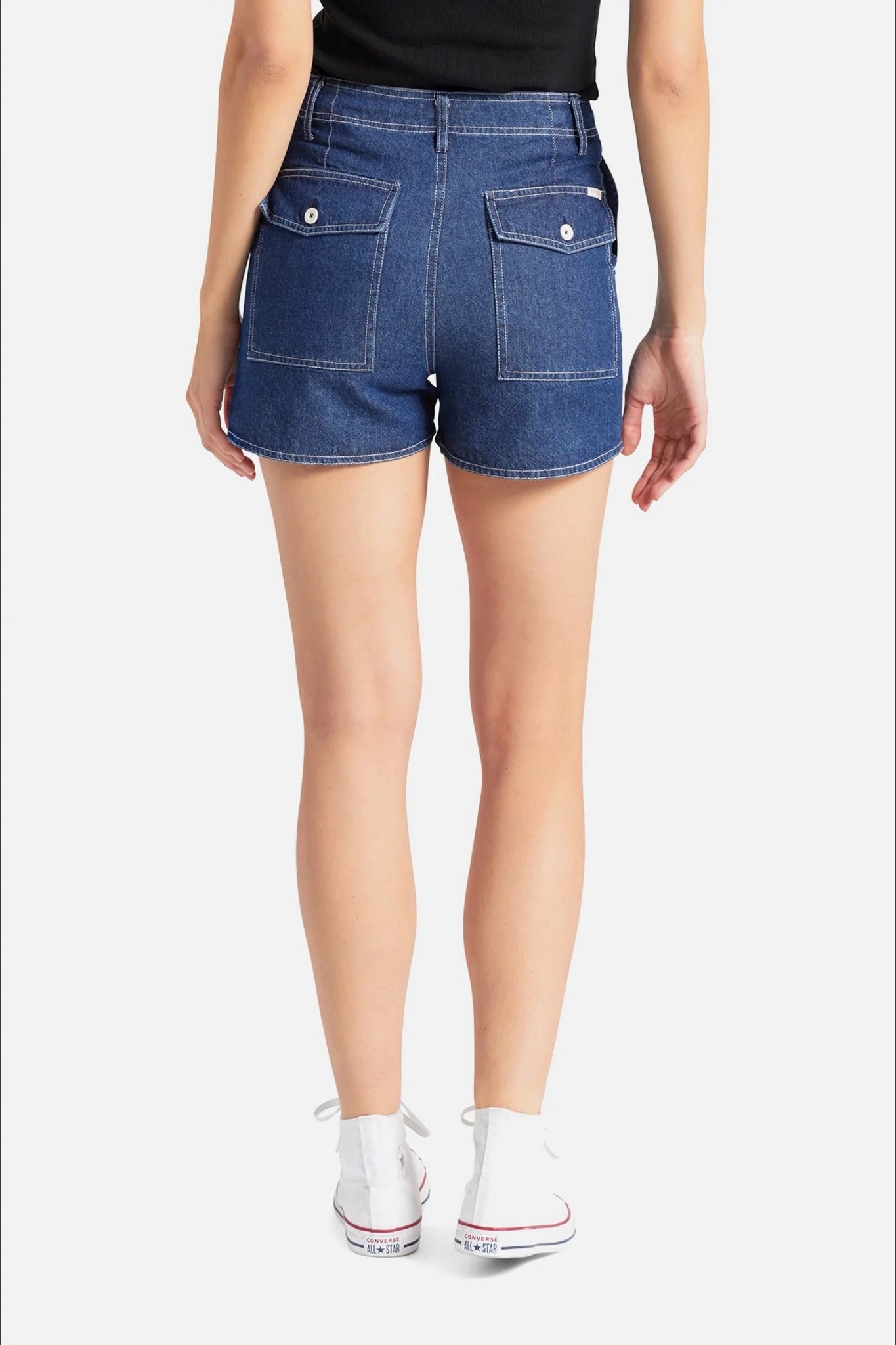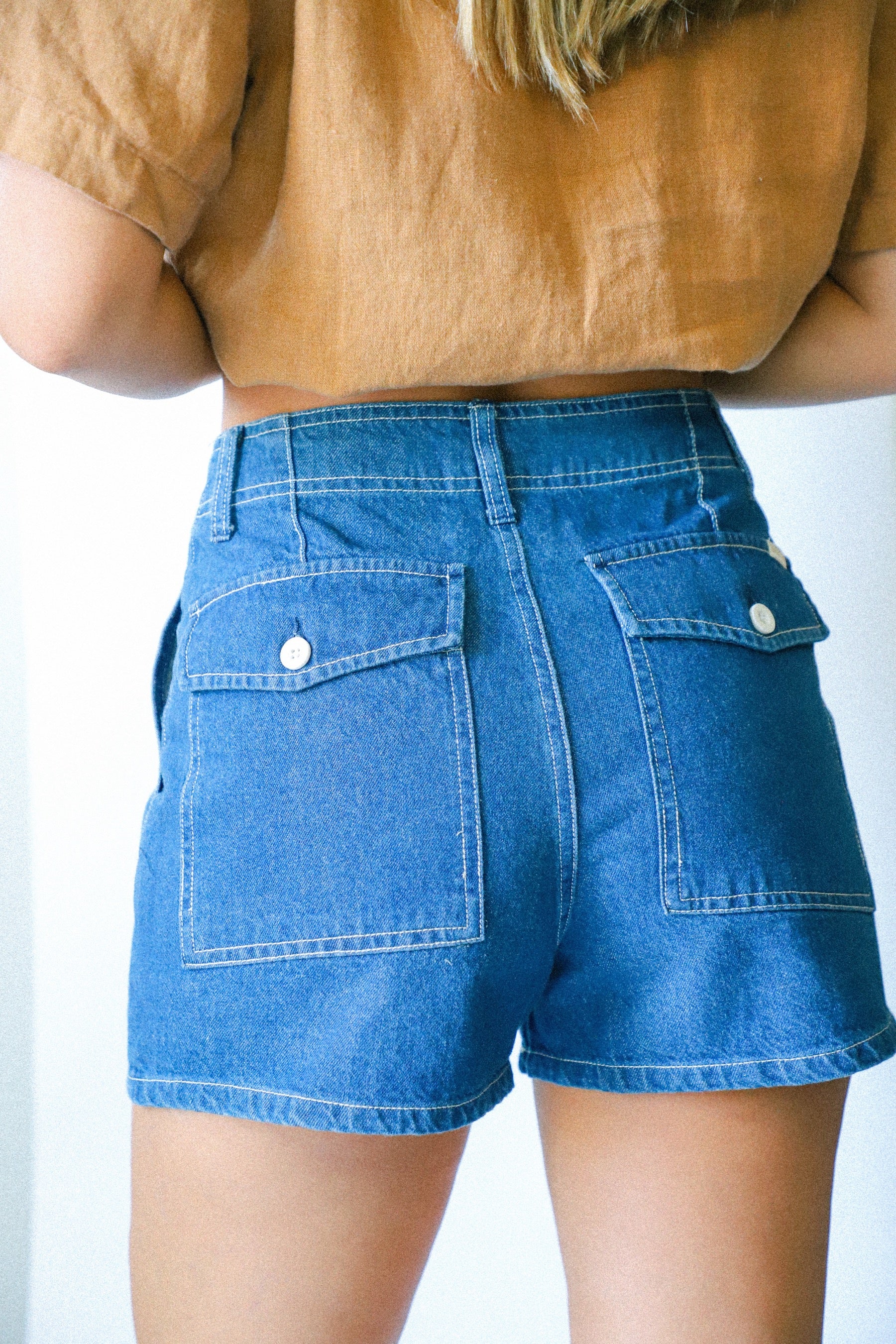 These are a high-waisted utility short with a straight leg. They’re designed with patch pockets and a seamless waistband that channels Hollywood vibes.