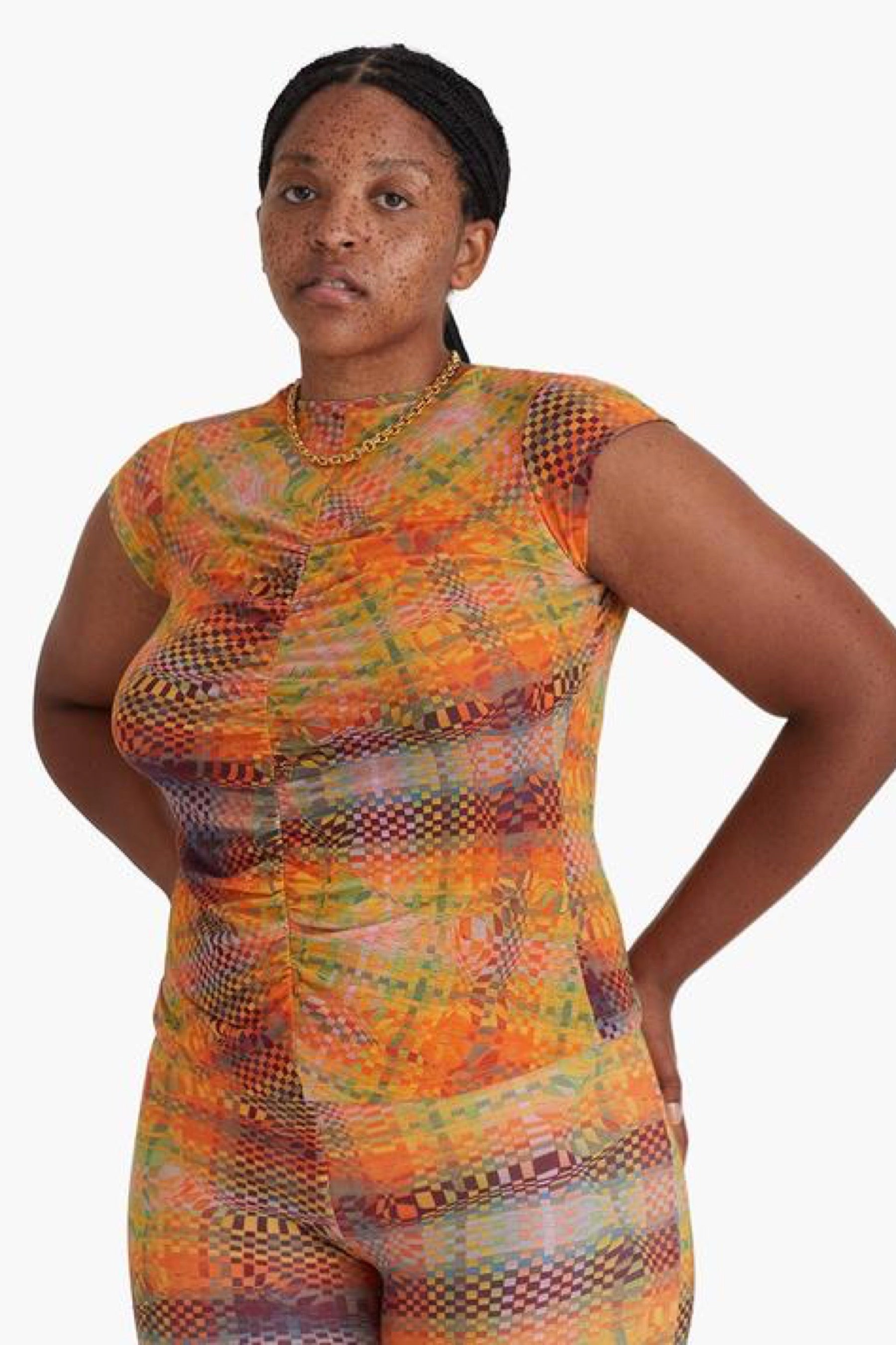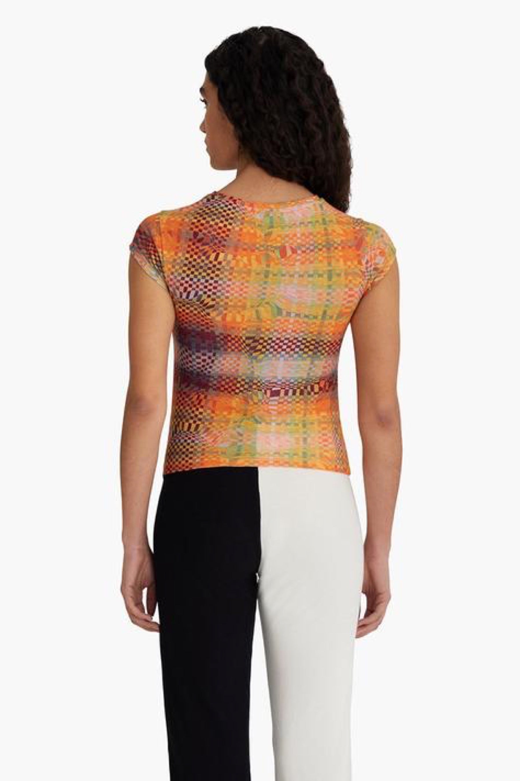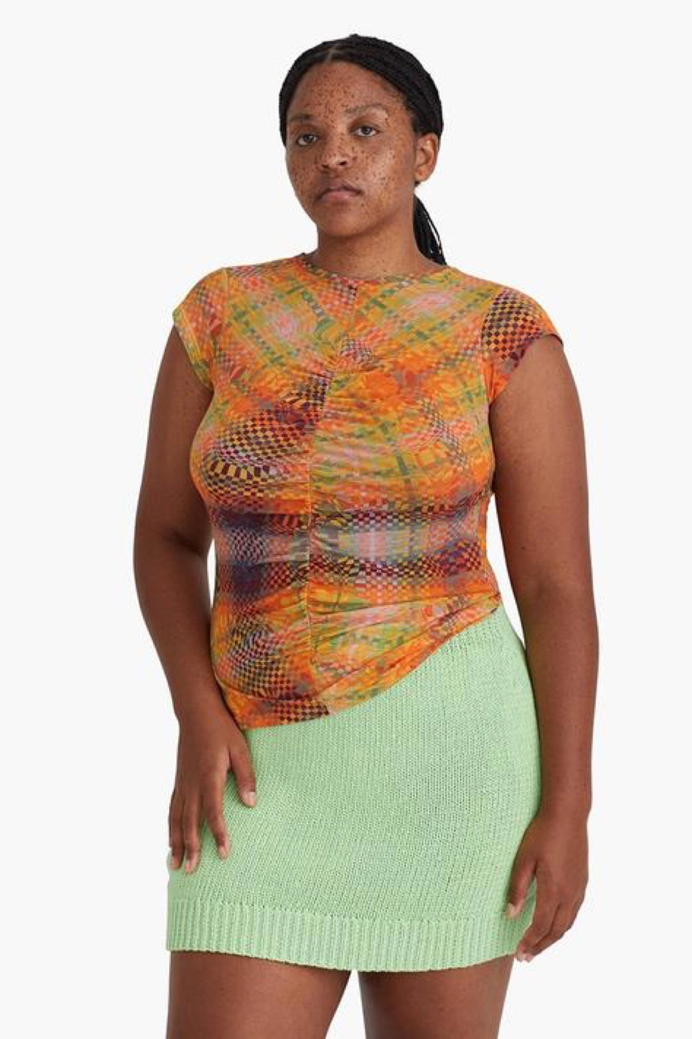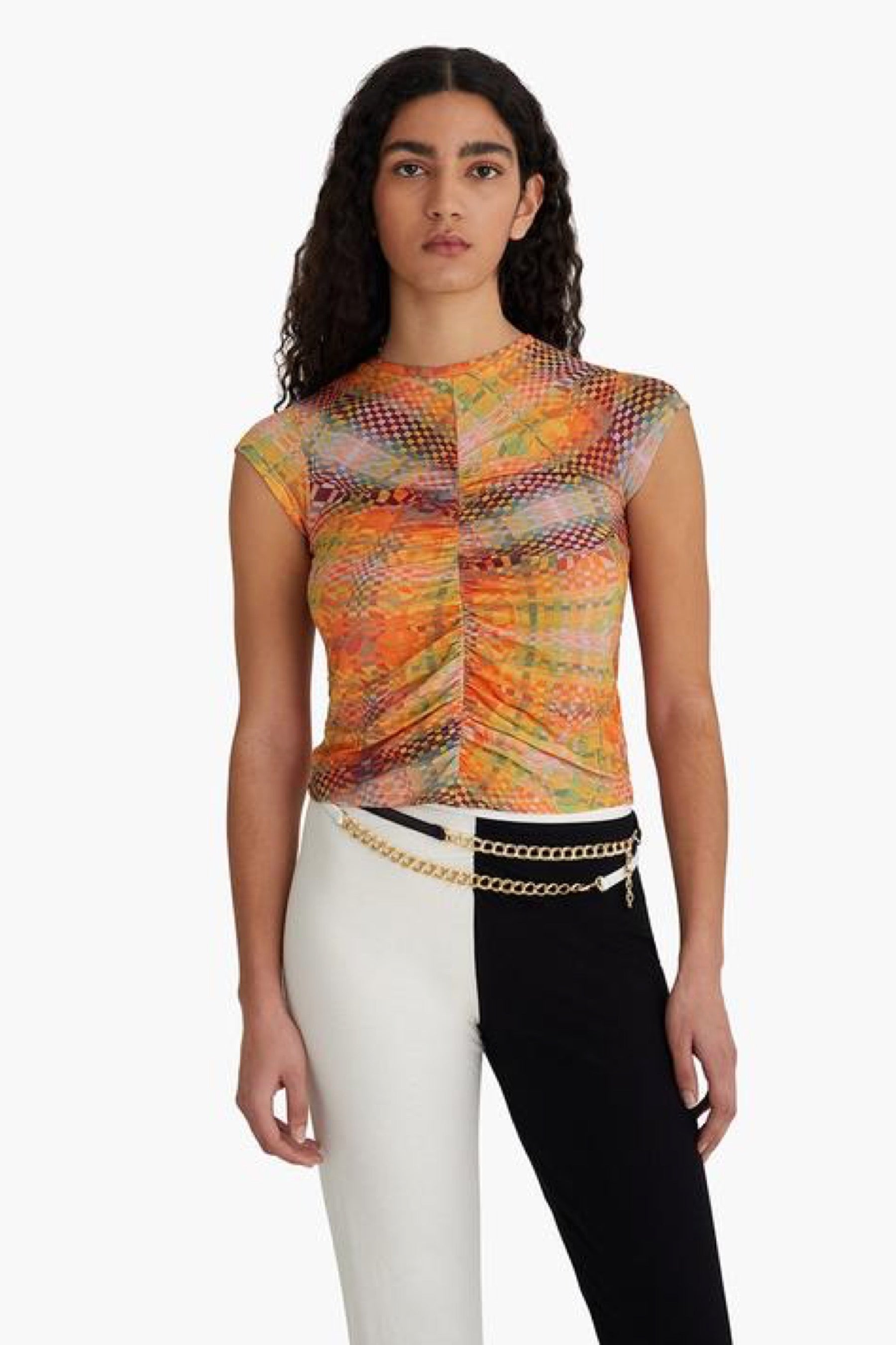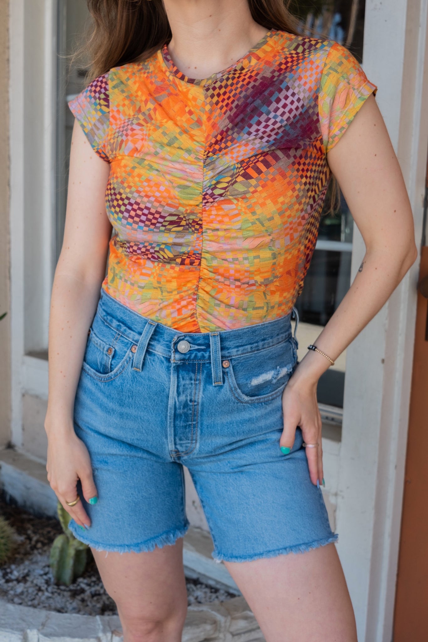 Abstract checkered top featuring a ruched center, cap sleeve and made with eco friendly organic cotton. Print designed by by Julia Esqué.