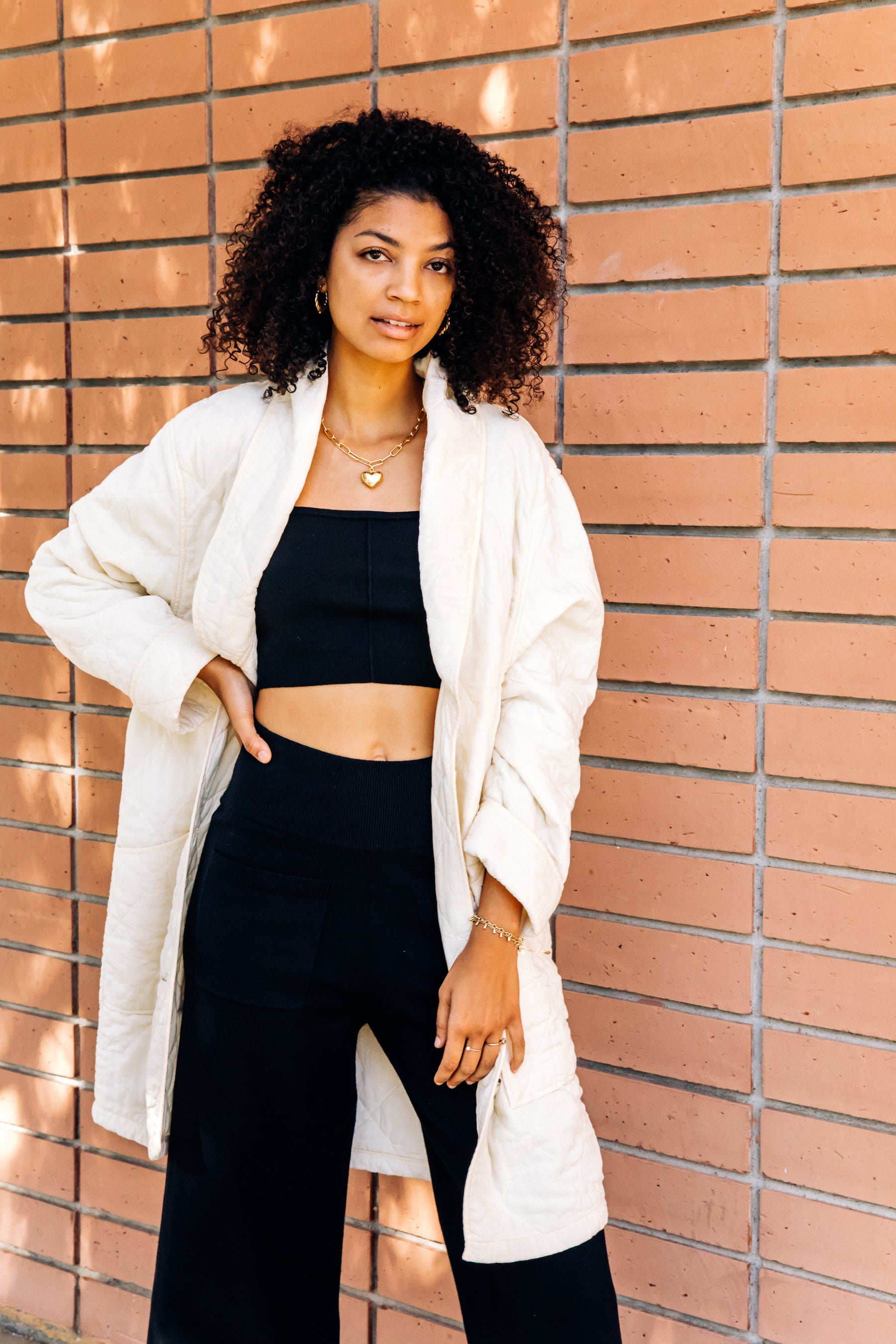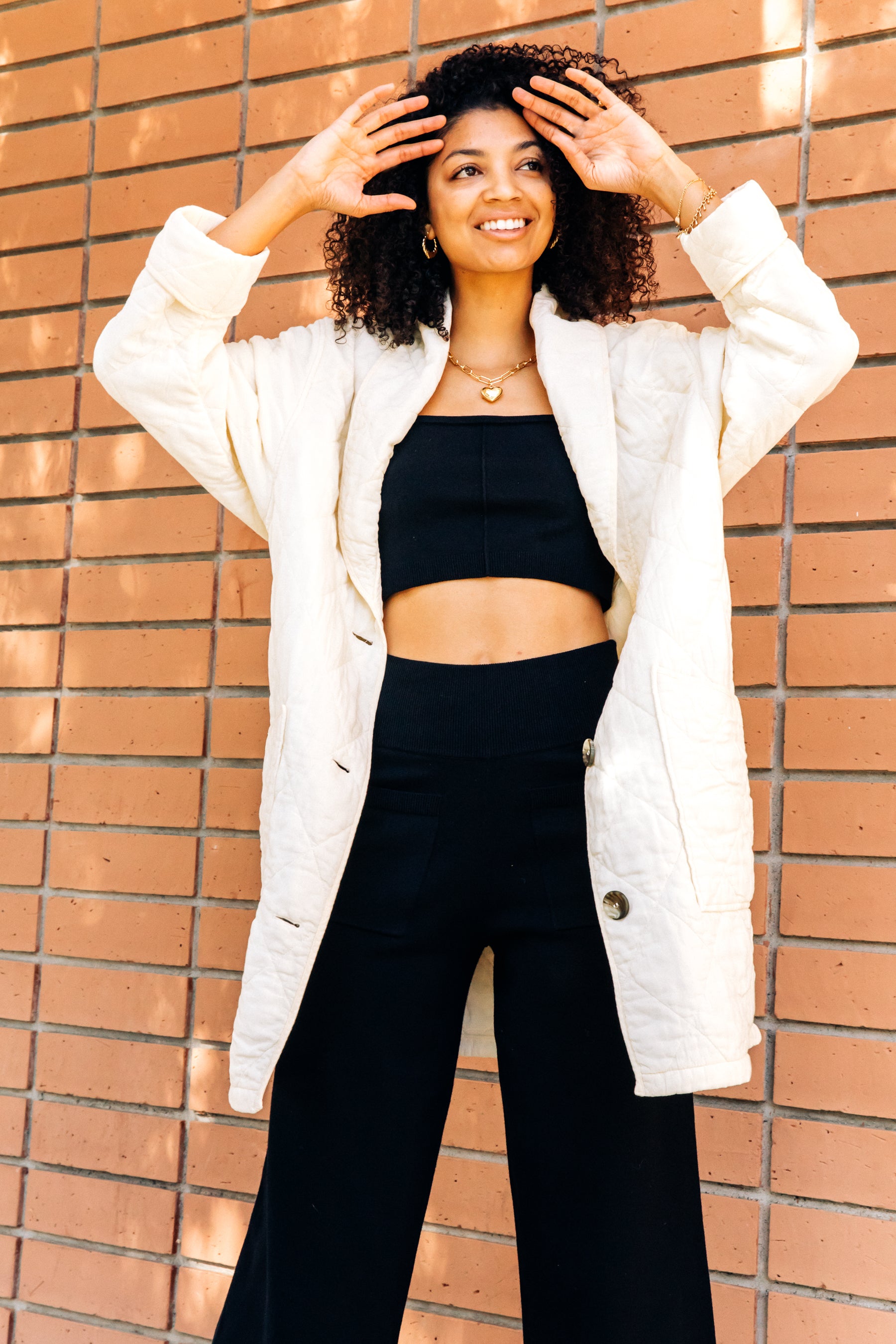 Lightweight quilted jacket in a super slouchy silhouette with button-front closure and exaggerated front pockets. The Happy Day Dreamer features dropped dolman sleeves, a rounded collar detail, in a longline style.