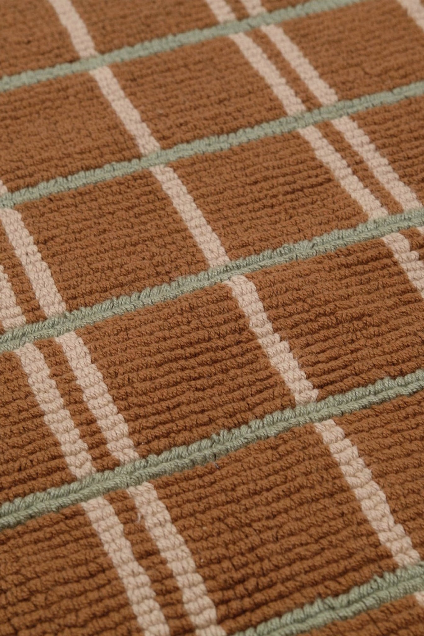 Featuring a smooth surface created by small tight loops, this beautiful piece has a classic check pattern in jade and cream on a warm hazelnut background.