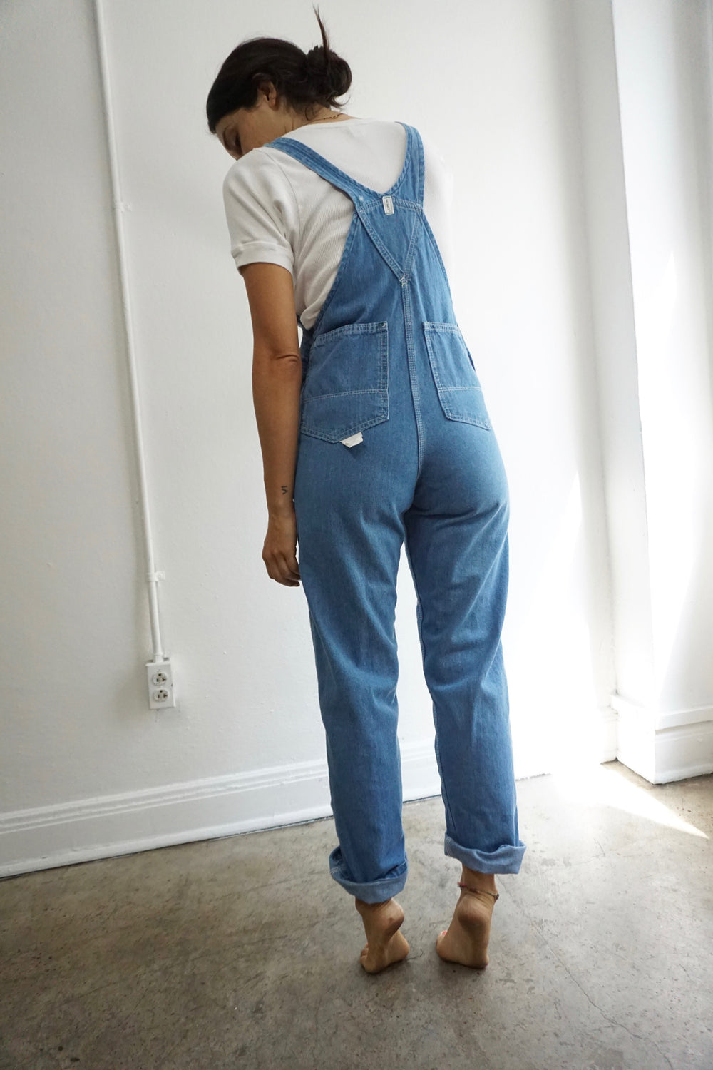 Classic 80s Key brand overalls. Light wash denim. Logo pocket on bib. Small rip below left buckle.