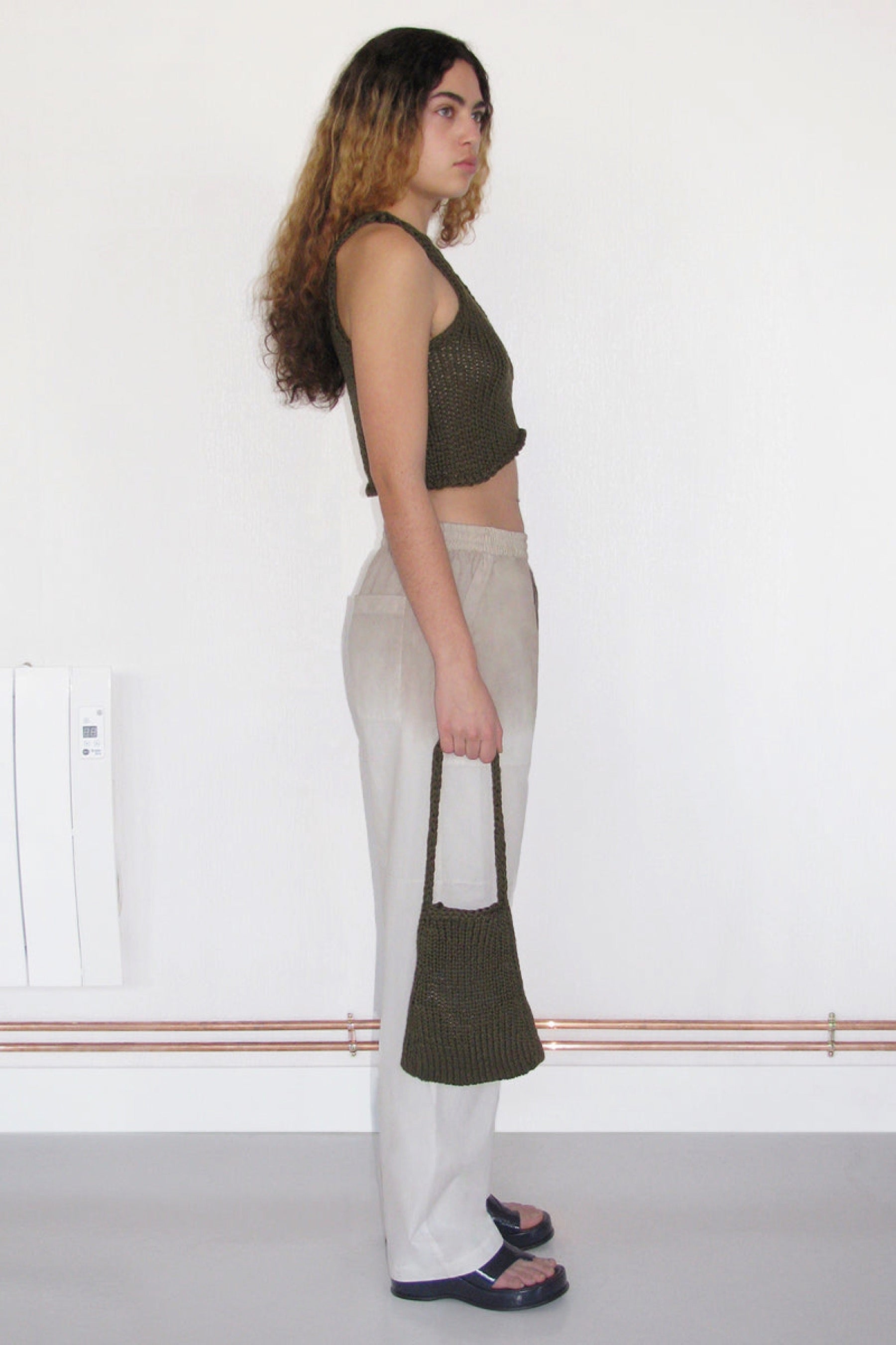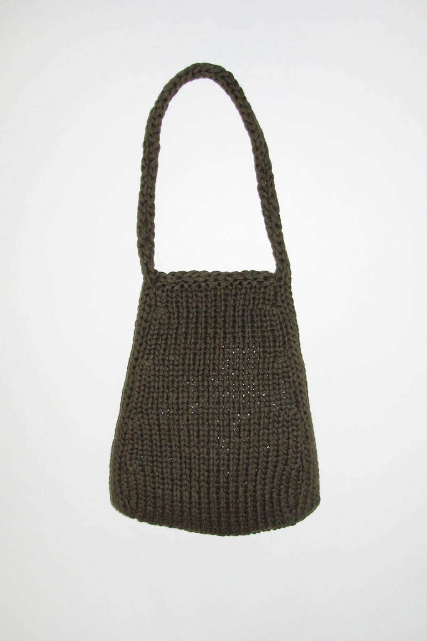 Hand knit bag made out of chunky textured yarn. Made in Spain using environmentally conscious practices.