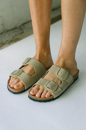 Soft suede two strap sandal featuring tonal buckles and a cork footbed. Ethically made in Spain.