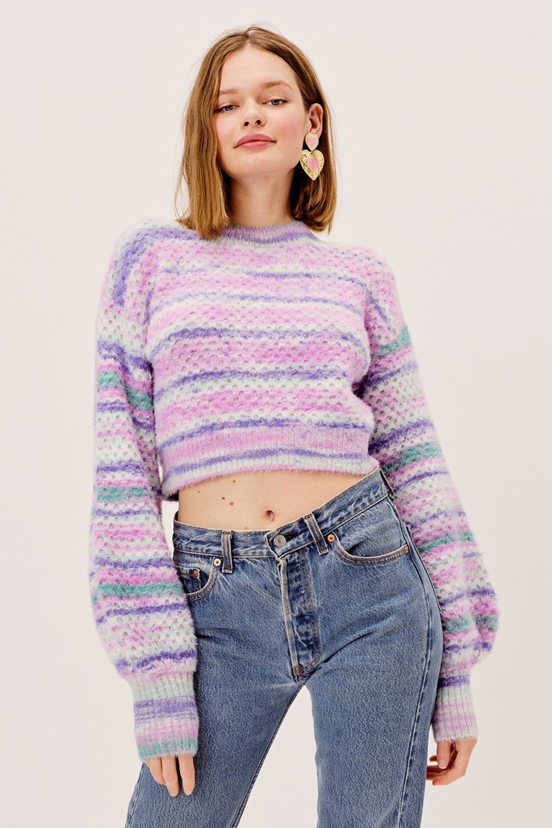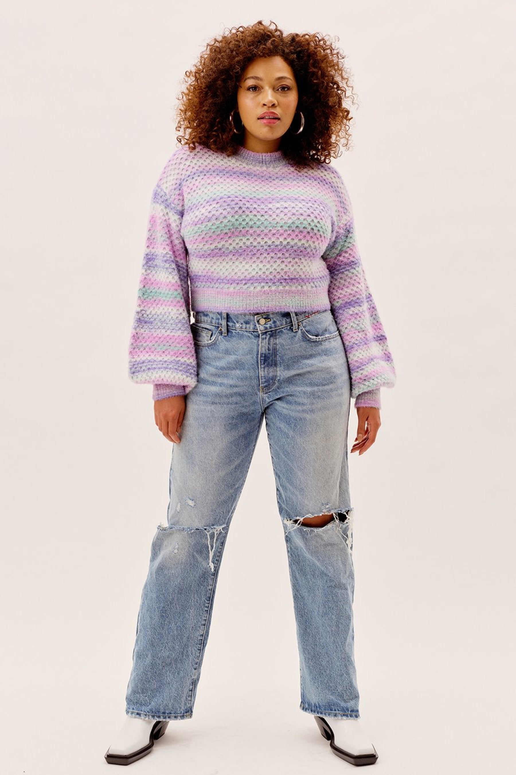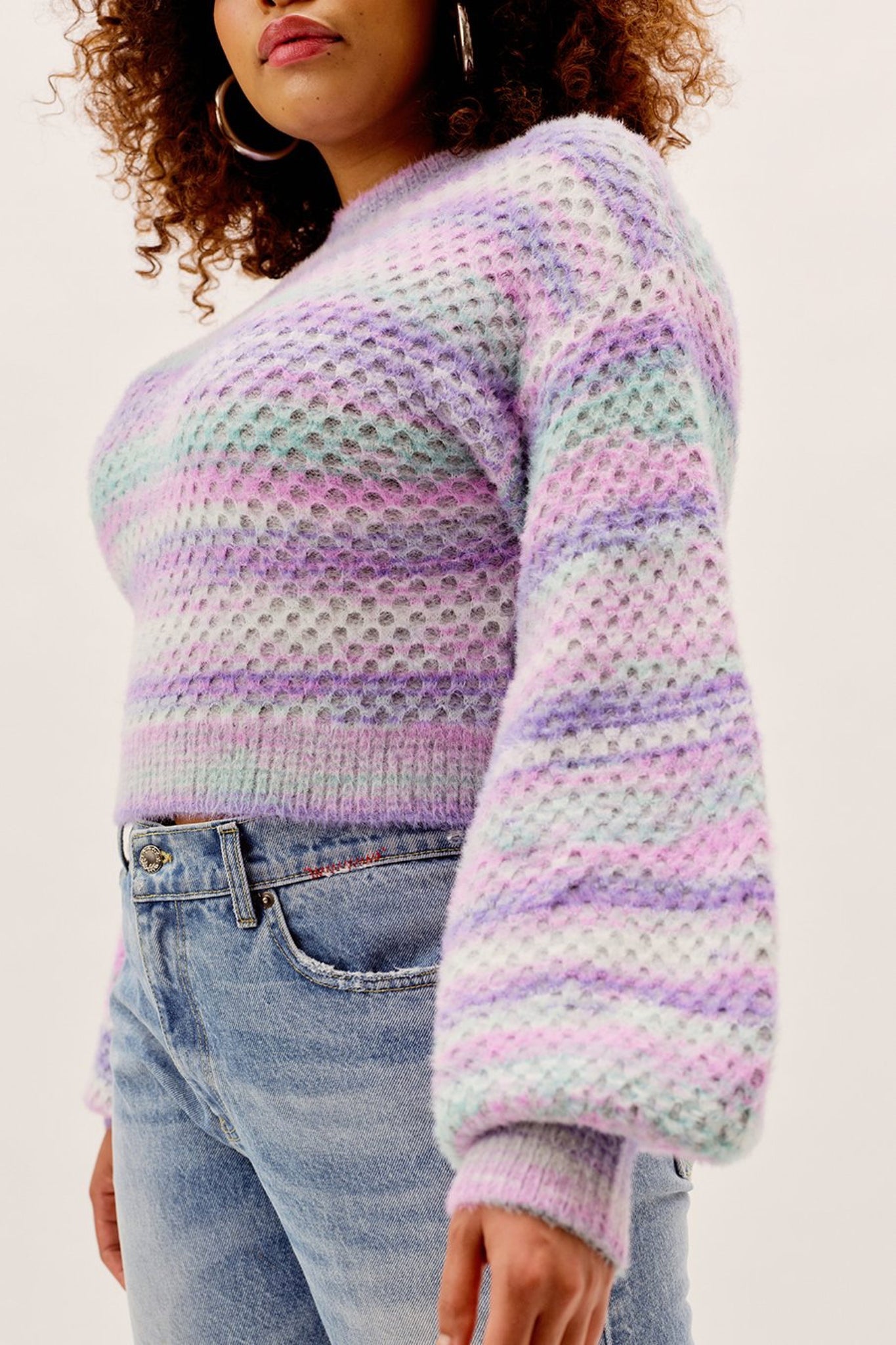 Plush pastel gradient mohair sweater featuring a cropped shape, mock neckline, and full bell sleeves. Slightly fitted silhouette.