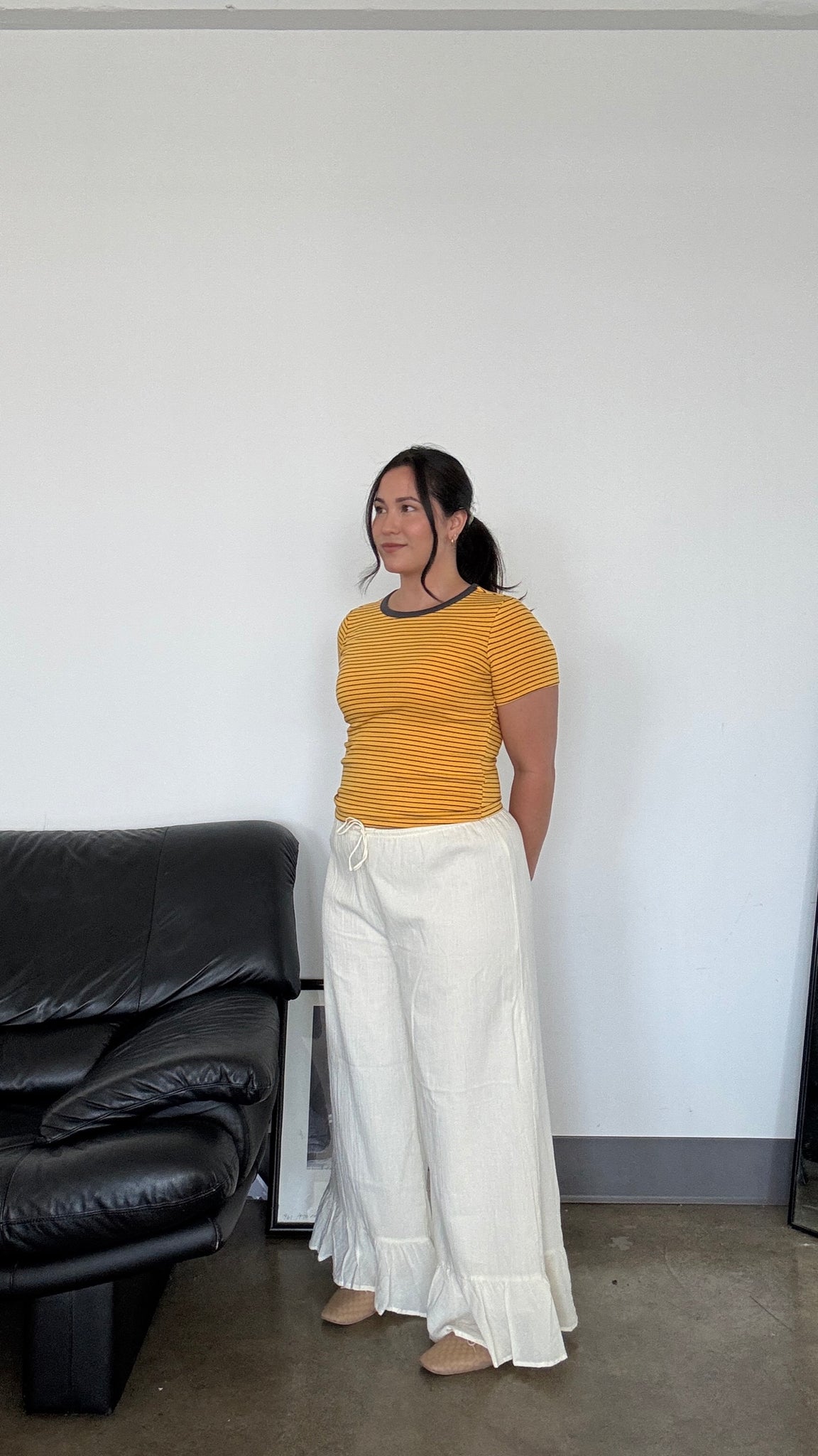 Crafted from soft cotton, these drawstring pants feature playful ruffle details that add a twist to your everyday look. Fully lined for a smooth fit, they combine effortless style with breathable ease—perfect for making a statement wherever you go.