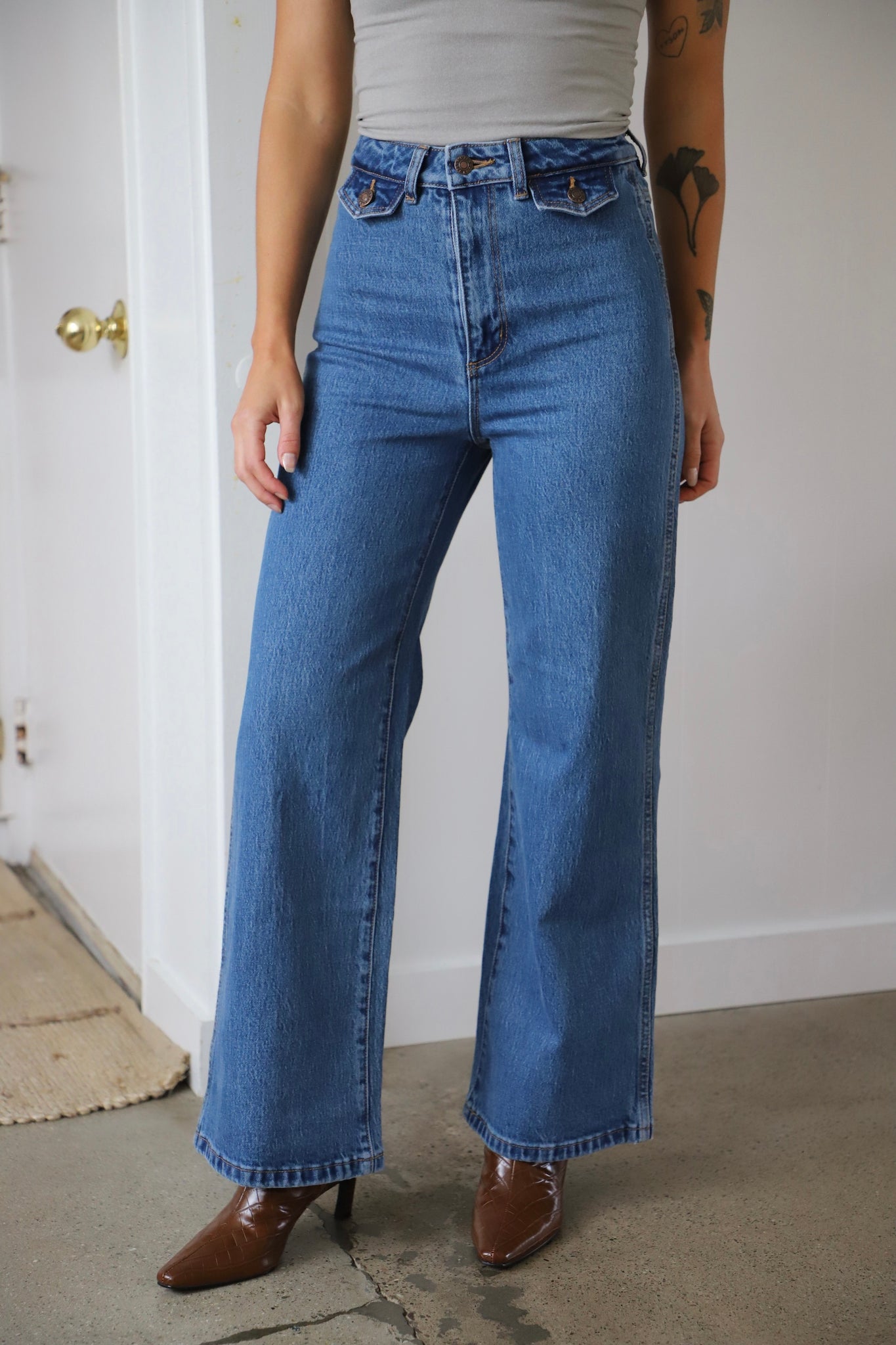 With a super high rise and slim fit, these jeans are designed to flatter your figure. Plus, the wide leg and signature sailor patch pockets add a touch of personality. Made with Rolla's vintage gold logo button and trims, these ankle length jeans are perfect for any adventure.