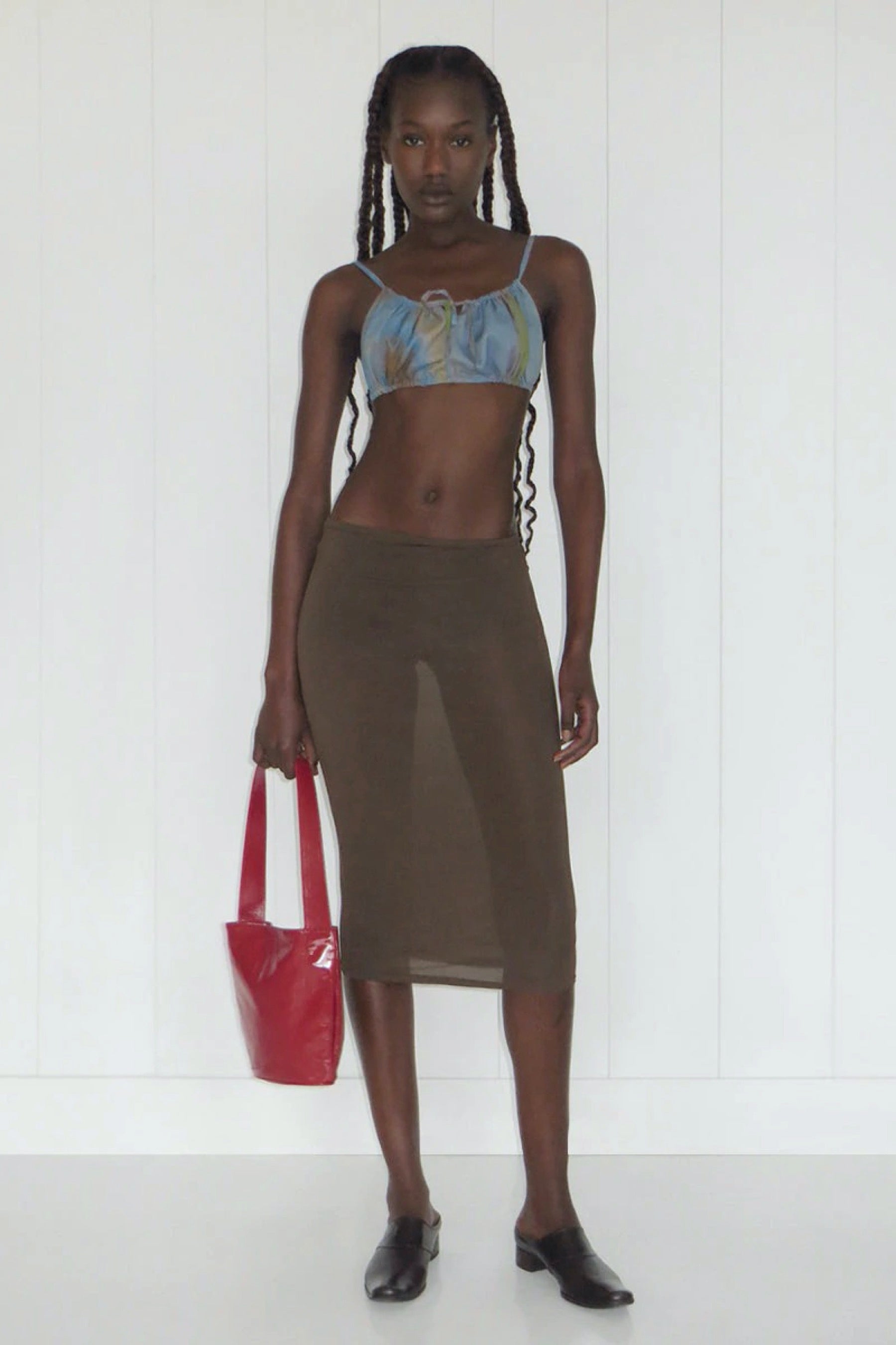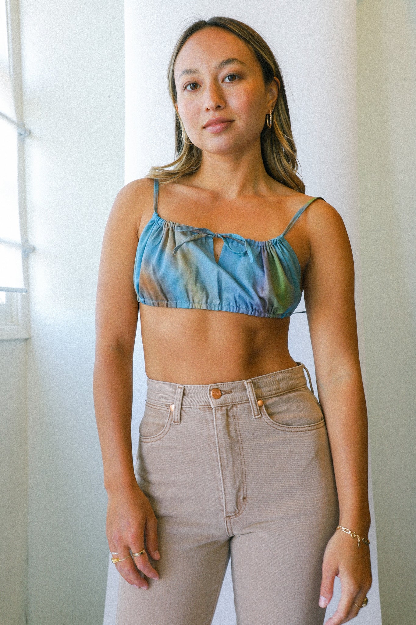 Softly puckered multi position top featuring an exclusive print by Nika Milano.