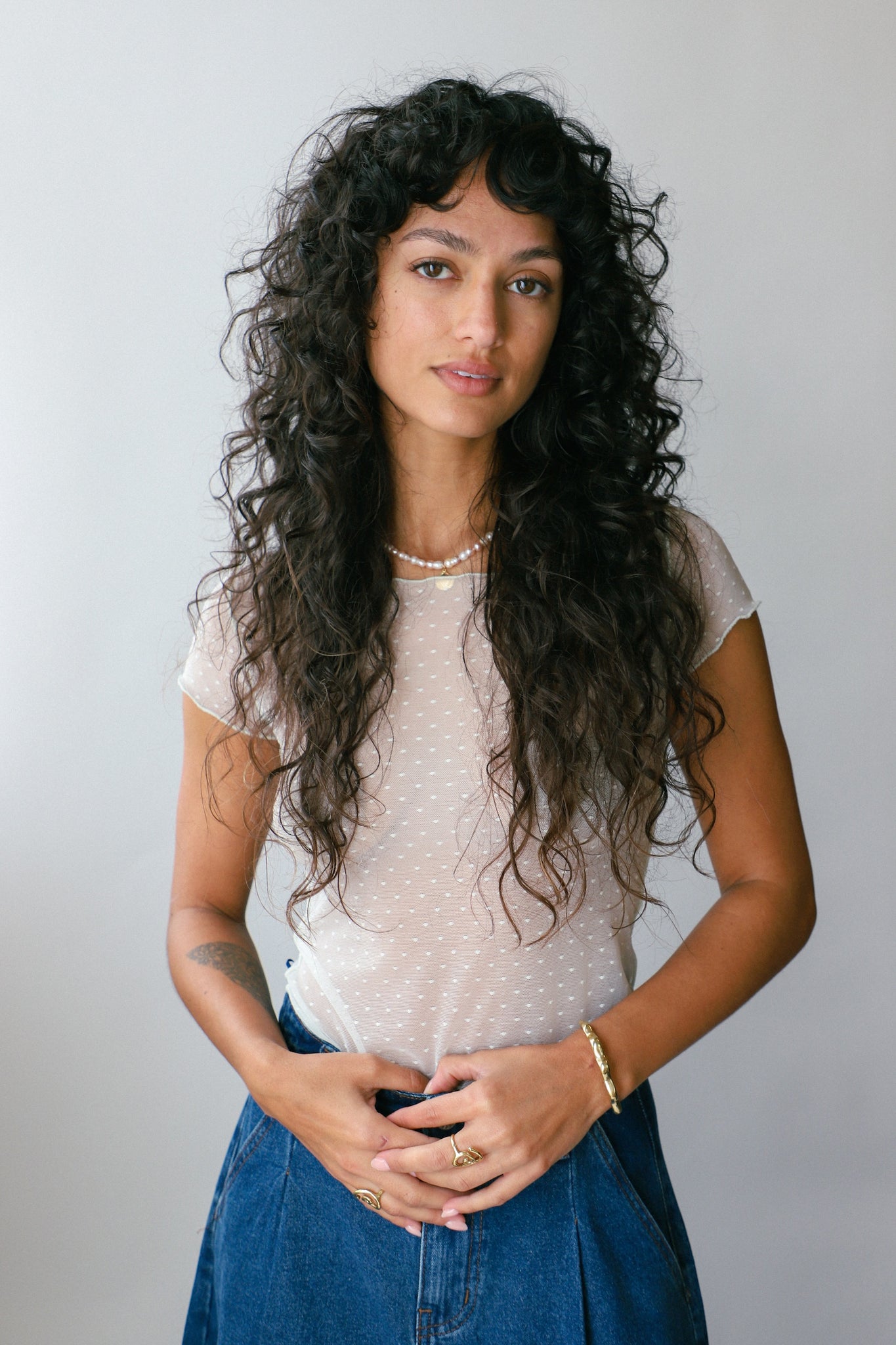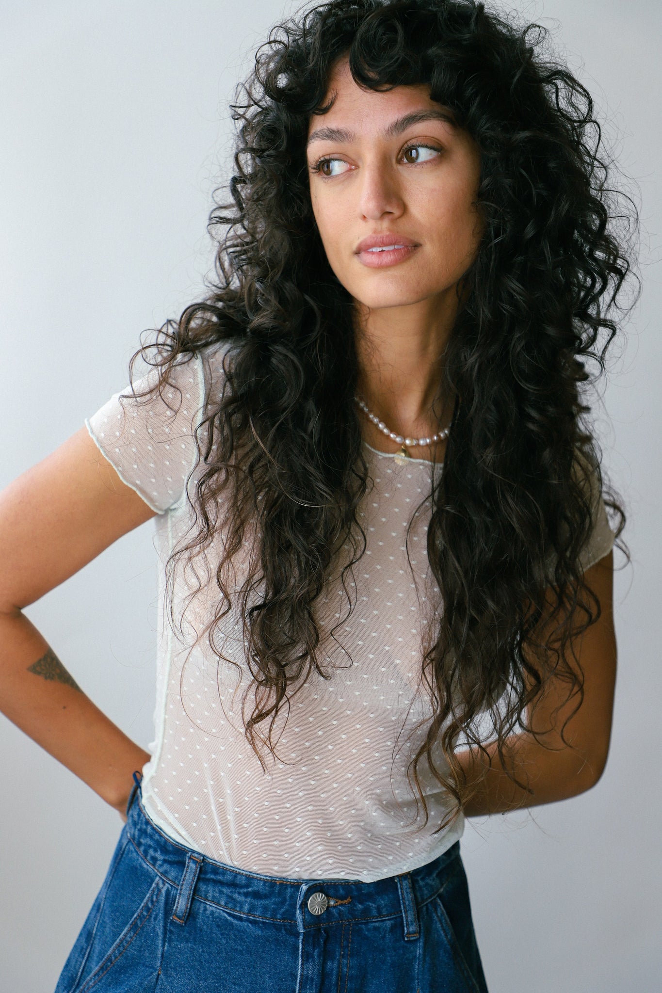Classic and sultry, this sheer baby tee is featured in a mesh fabrication and form-fitting style, complete with a Swiss dot pattern for a darling detail.