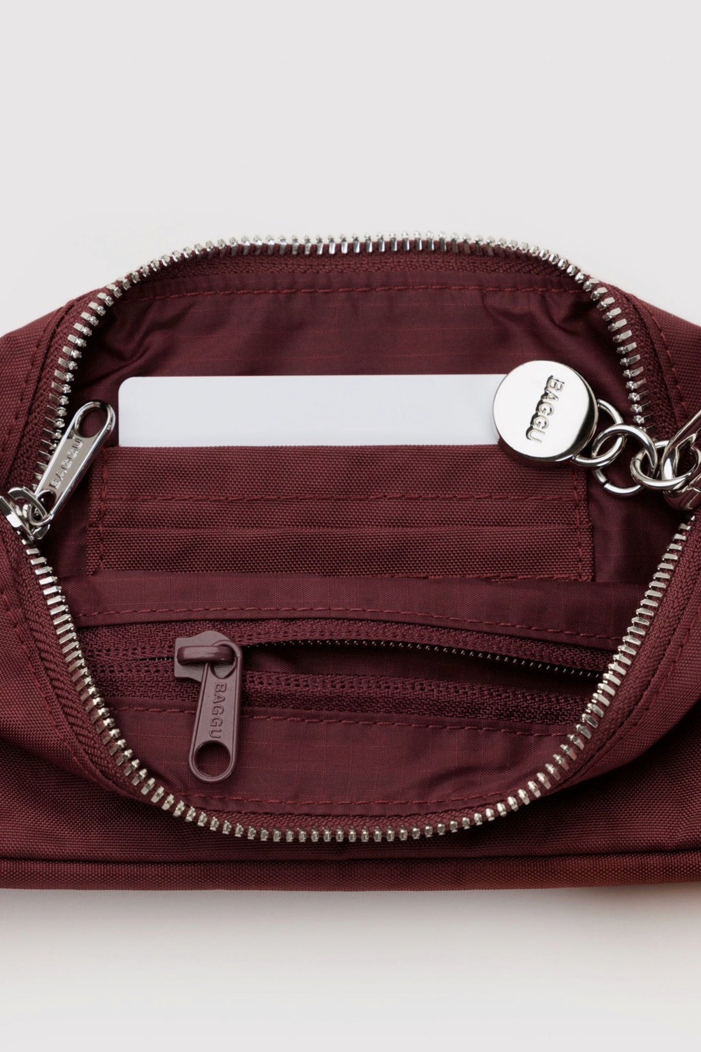 A sleek, compact bag featuring built-in card slots for organization, metal charm, and adjustable strap.