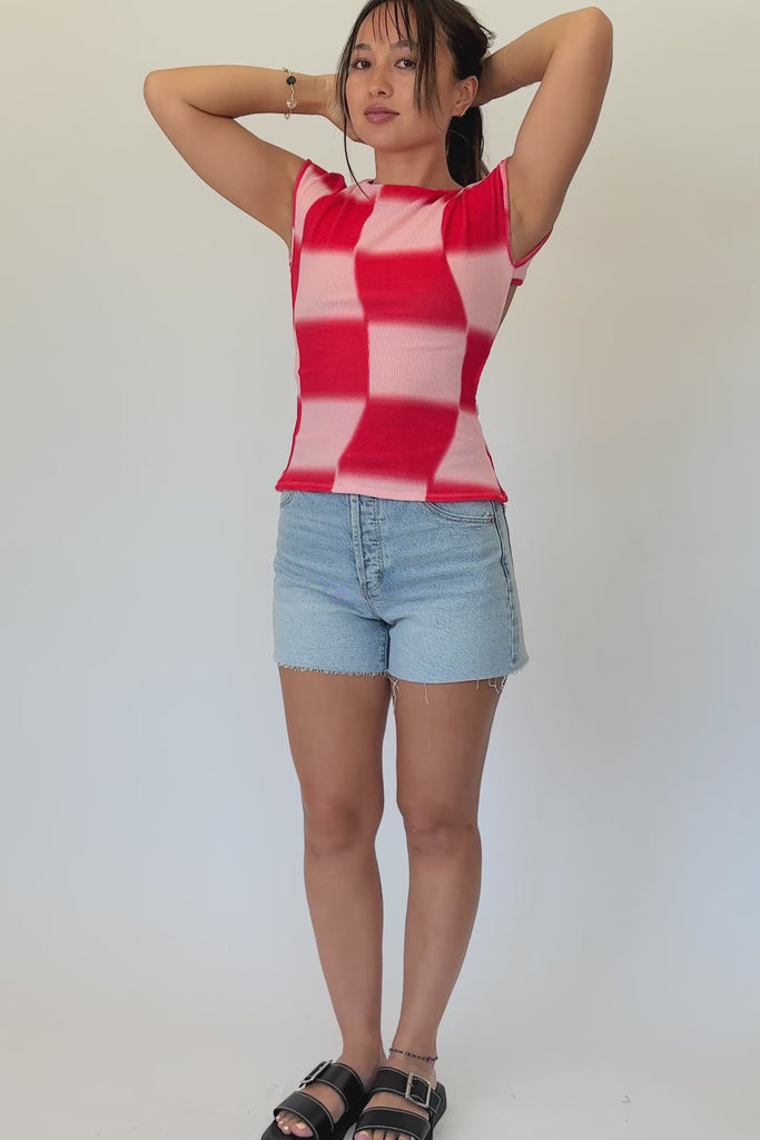 Stay breezy all summer with the Anya top featuring a backless style and twisted strap at the neck. The hazy wavy checkerboard print is perfect on any cool girl.