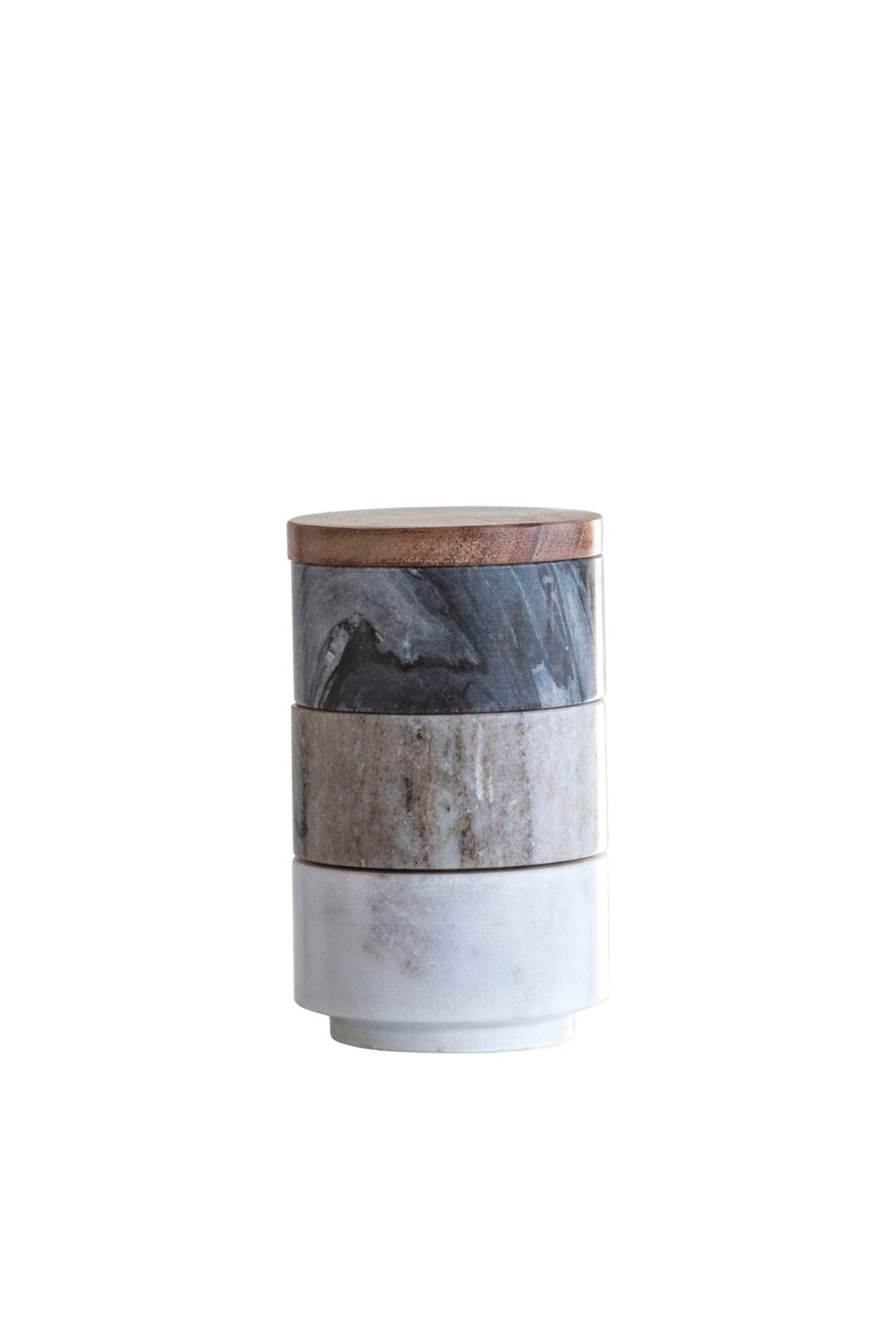 Designed to hold a small pile of salt, pepper or any spice, stackable with a wood lid.