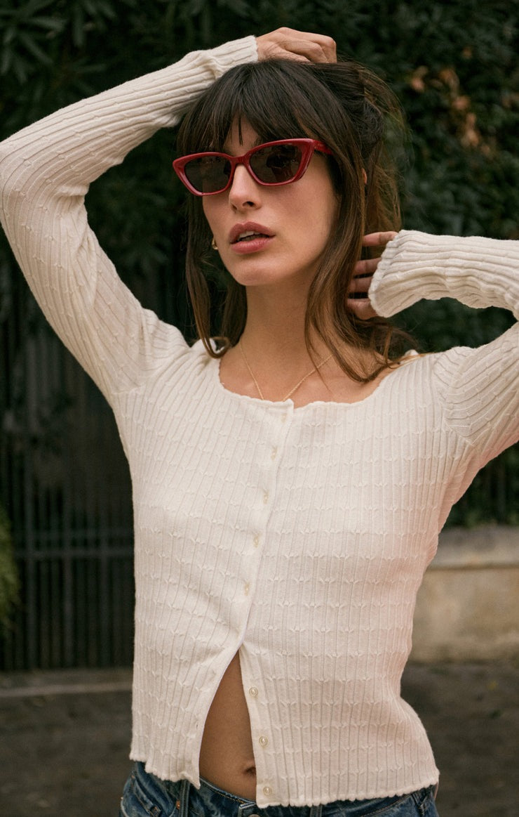 This smaller cat eye frame with sculpted details is perfect for the beach and beyond. 100% UVA, UVB and UVC protection with a polarized lens.