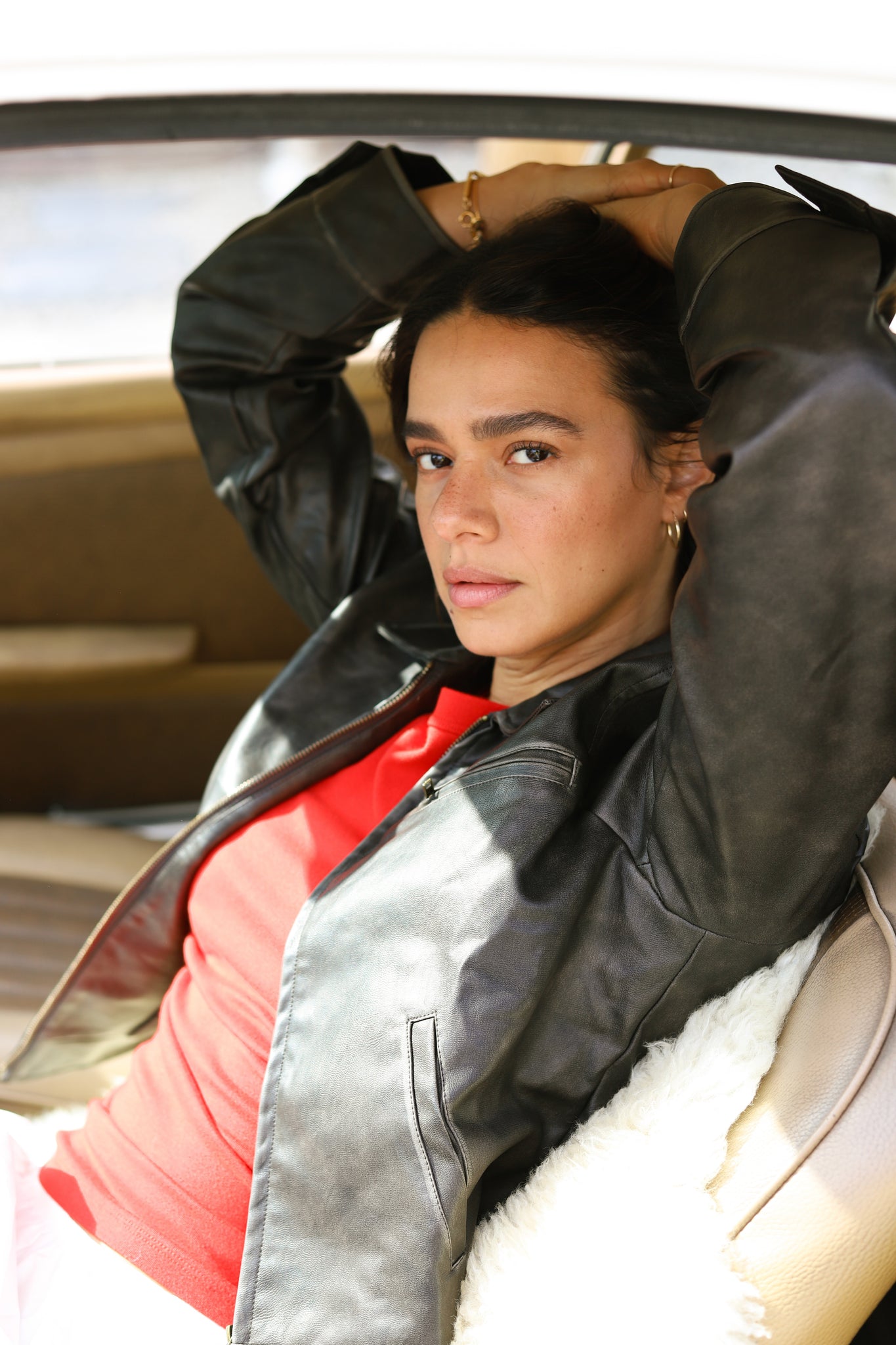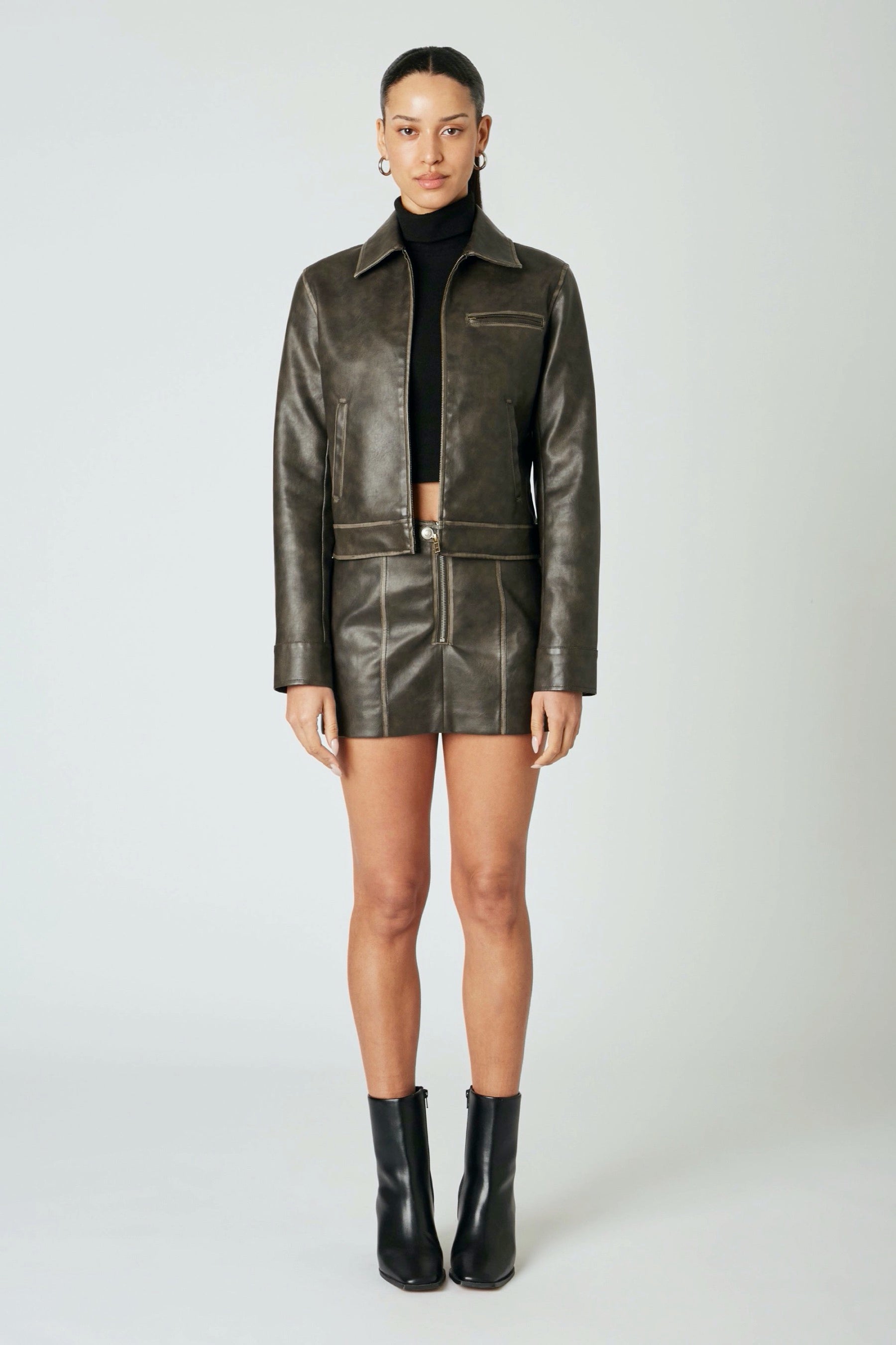 Cropped vegan distressed leather moto jacket with collar and zipper. Fully lined