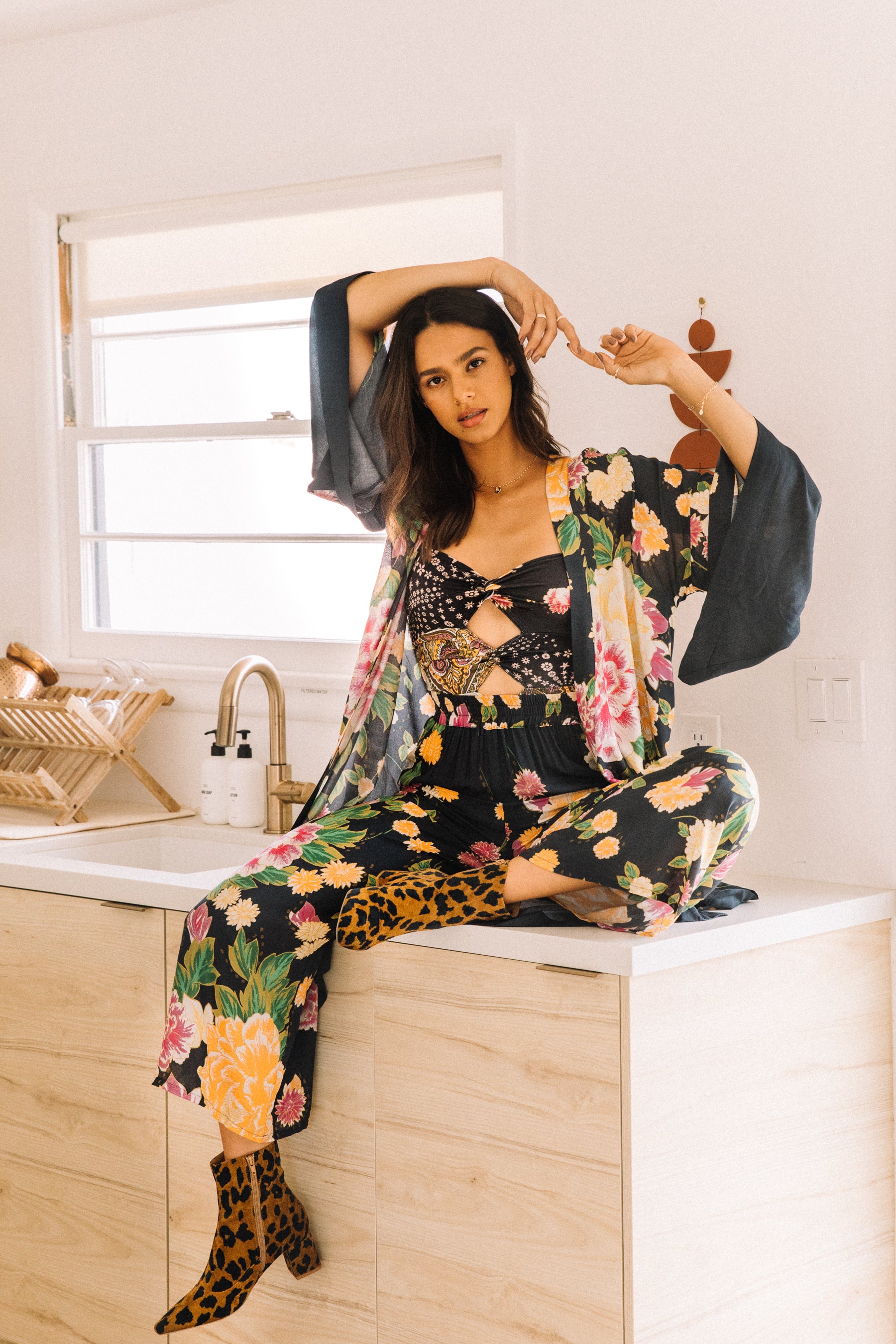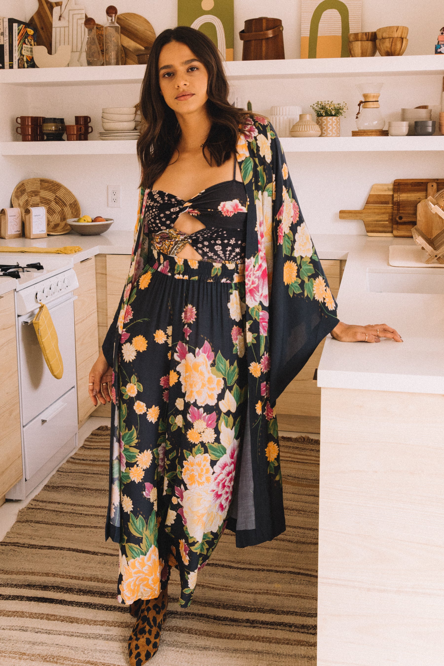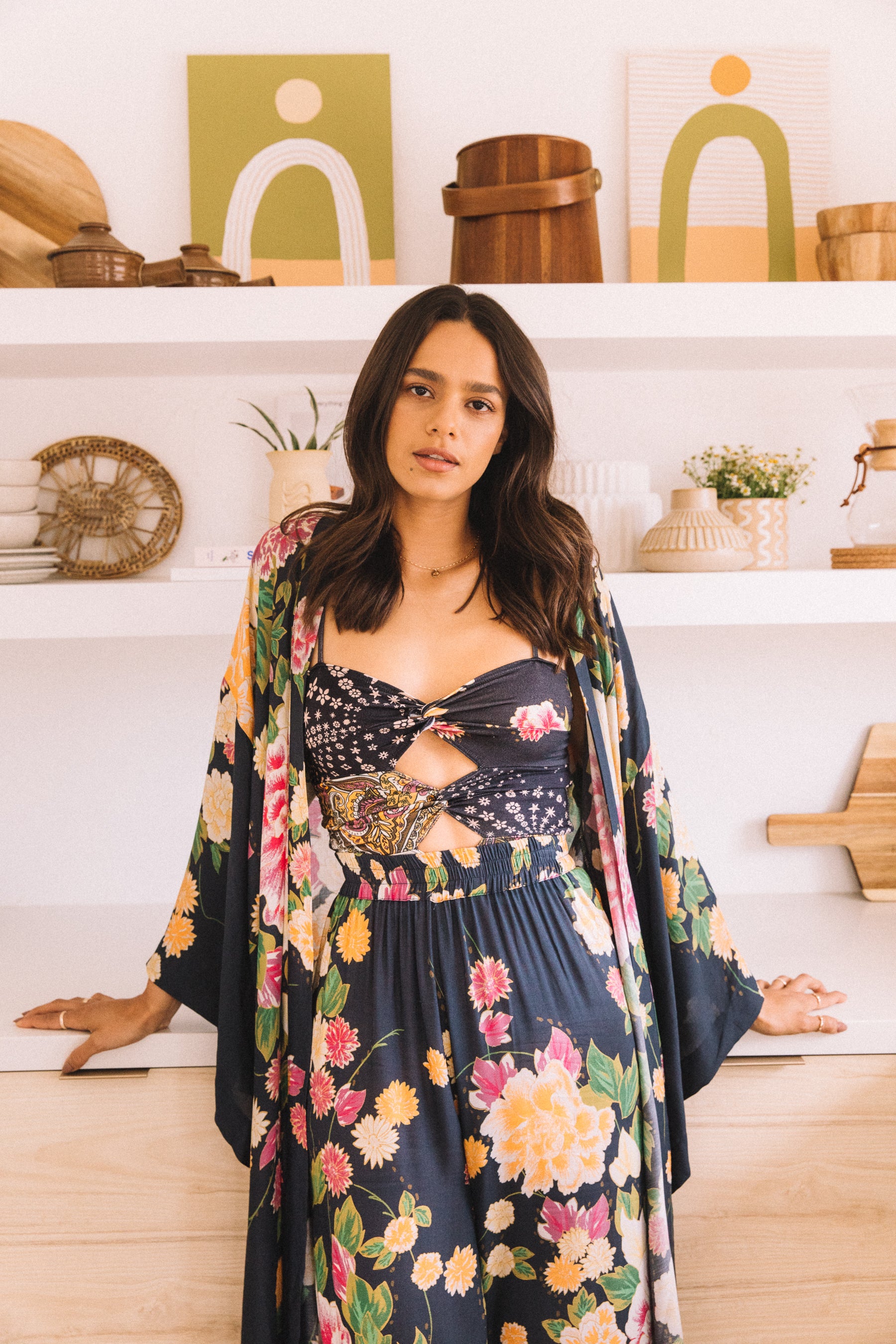 The Motley Etta Tank is a fitted tank featuring keyhole cutouts throughout the bodice, thin straps, and a gorgeous black geisha floral print. Tuck into some high-waisted denim, or pair it with it's matching trousers.