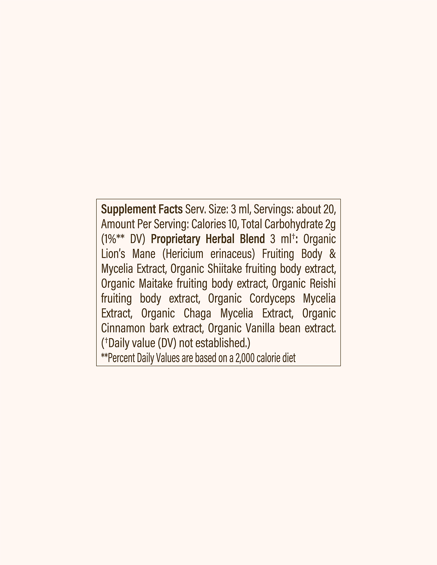 Five medicinal mushrooms help balance energy, support digestion, and calm stress. Dual-extracted and sweetened with cinnamon and vanilla, this formula is good enough to eat.