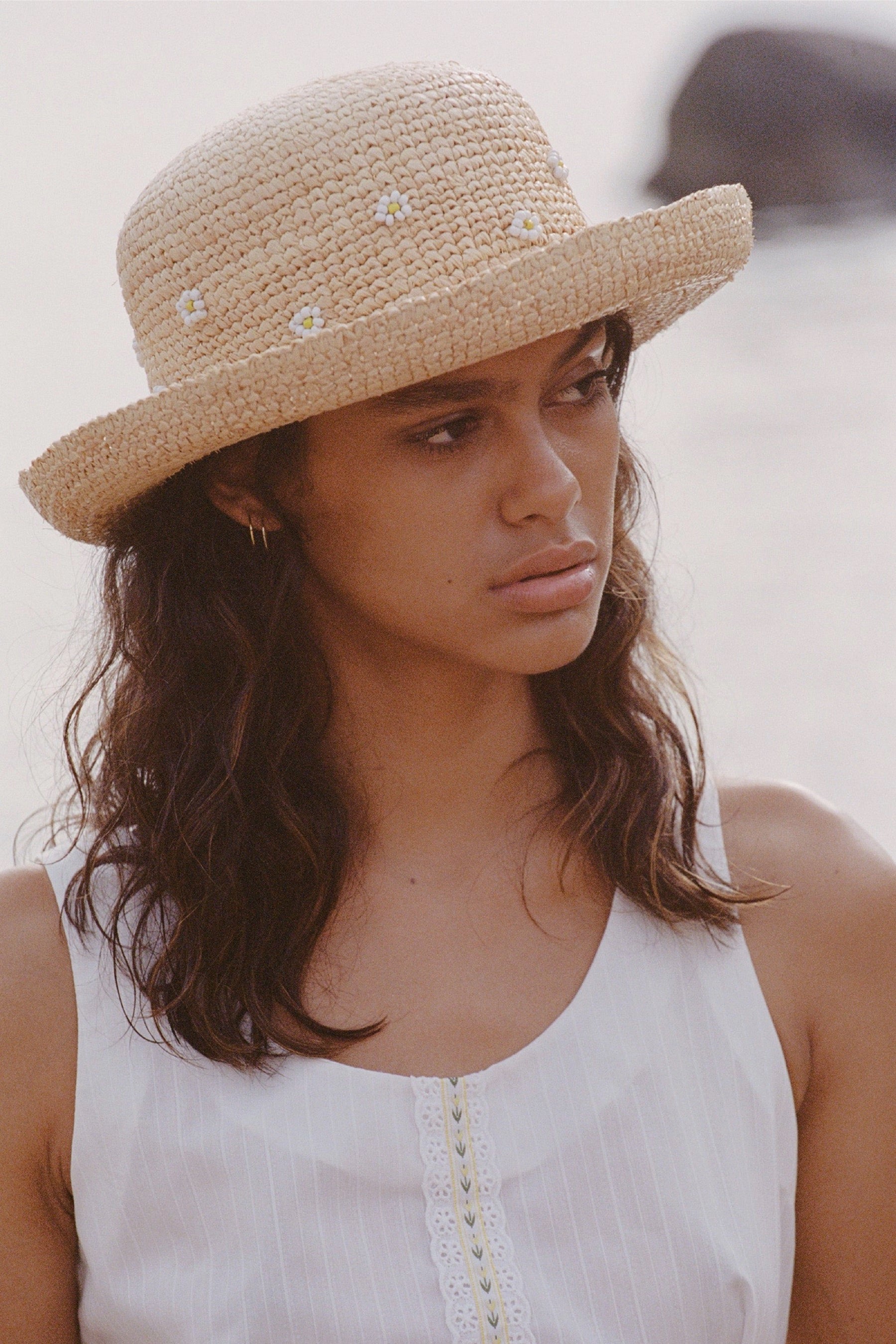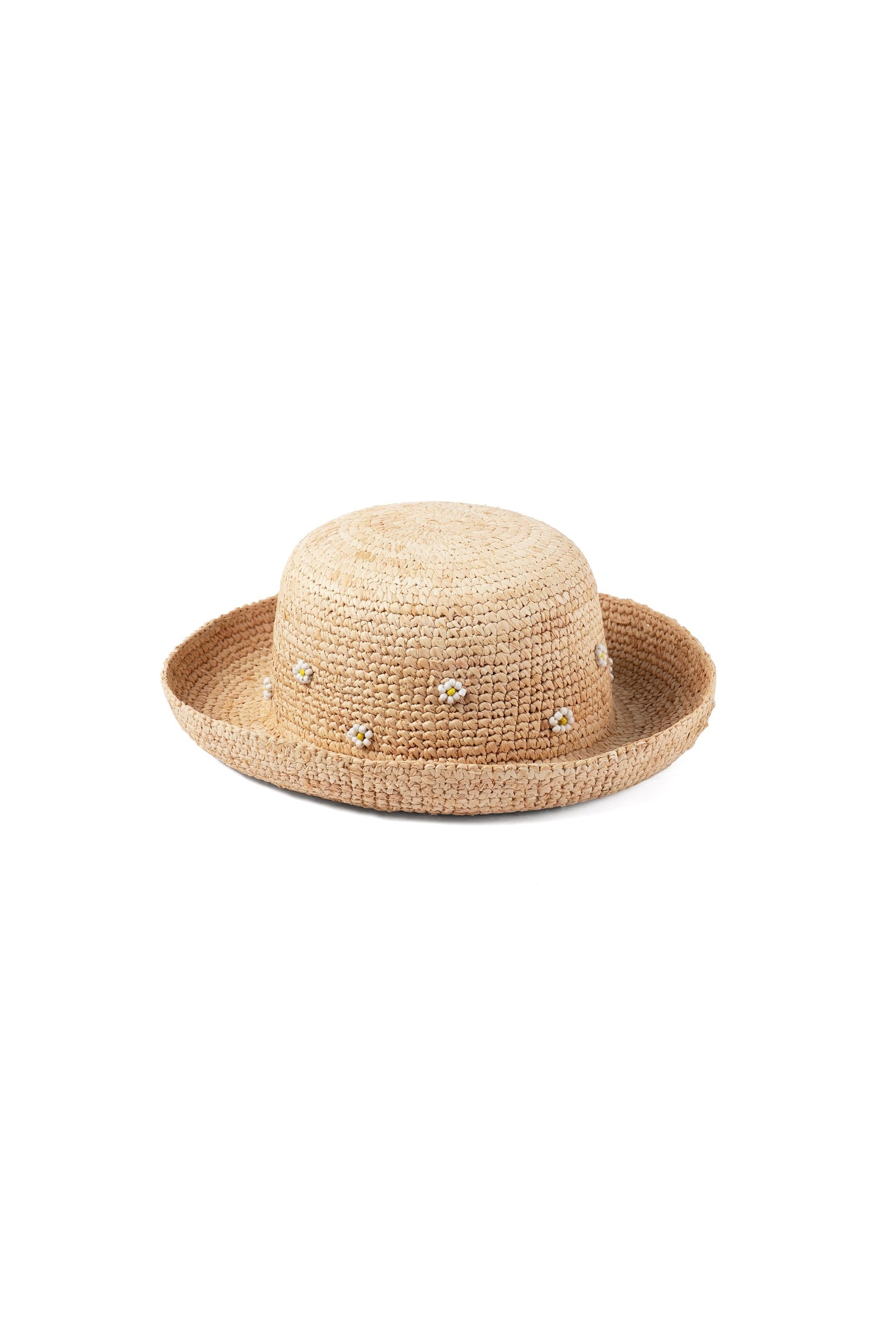 The Natural Daisy Cruiser is here to take your sun-soaked looks on a summery ride. Crafted from 100% raffia straw, this boater hat is made to last with a flicked edge to wear two different ways. Best of all, this serene style is complete with hand-beaded daisies - the perfect way to dress up any look!
