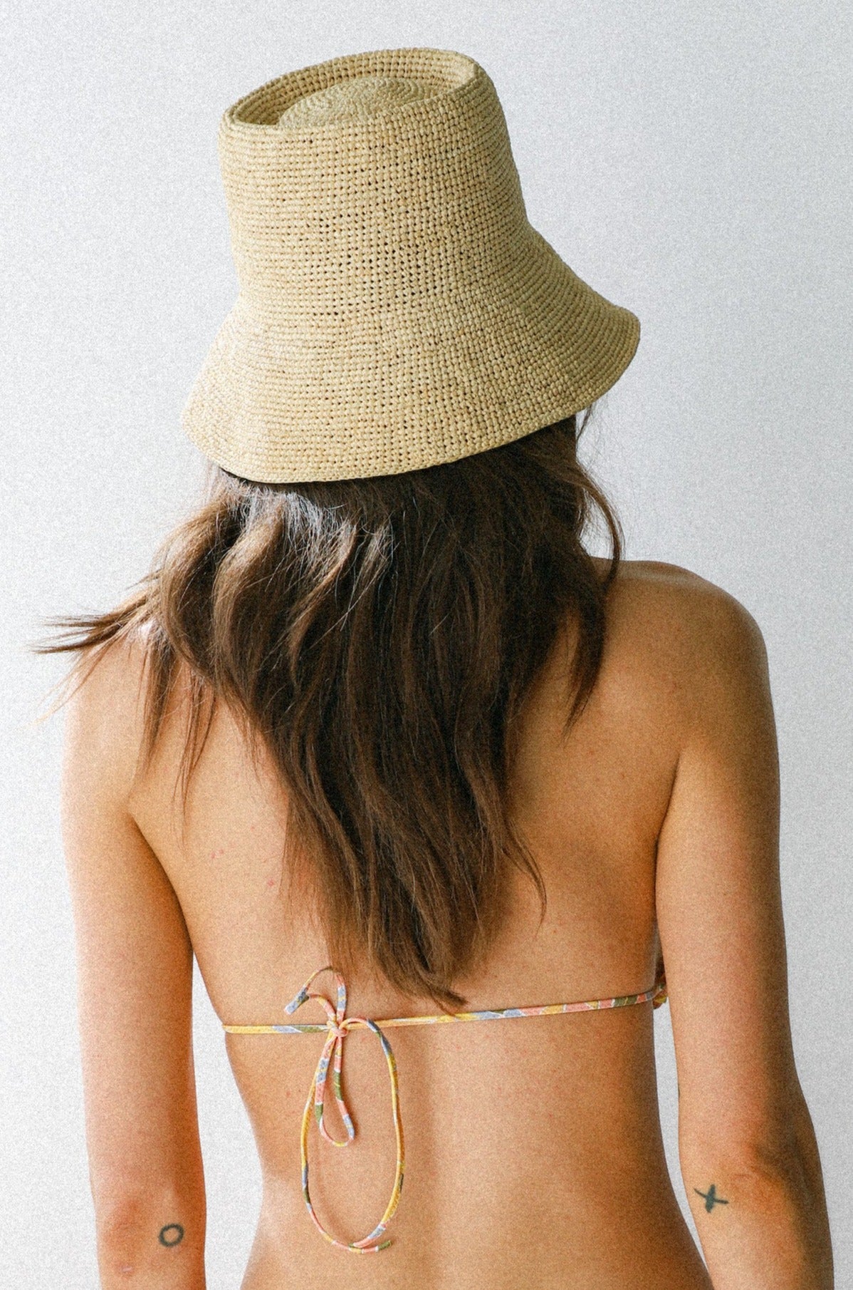A natural straw bucket hat made for summer. This short-brimmed crochet bucket hat was intricately crocheted to create a flexible and structured design. This effortless bucket hat can easily be worn year-round and is meant for traveling with you wherever you go whether in a suitcase, a purse or a beach bag. Packable.